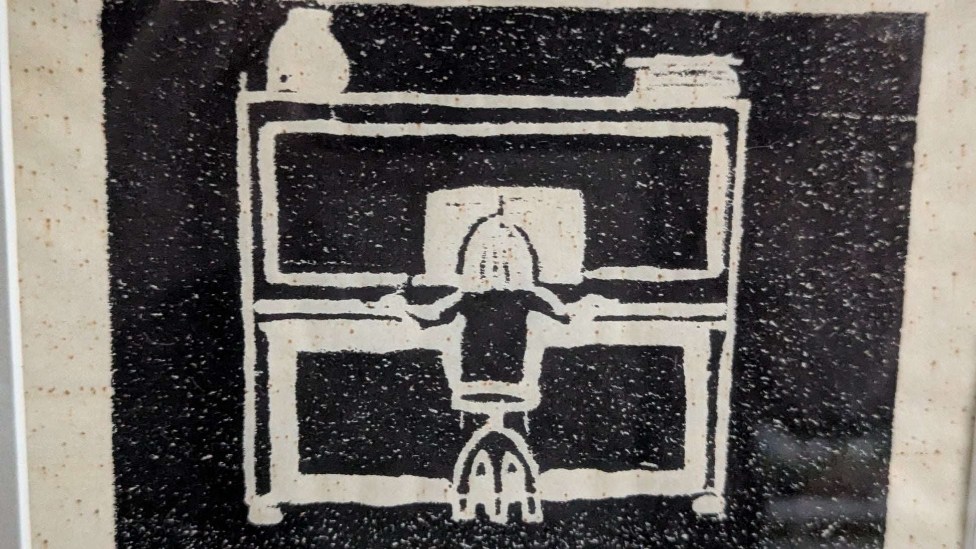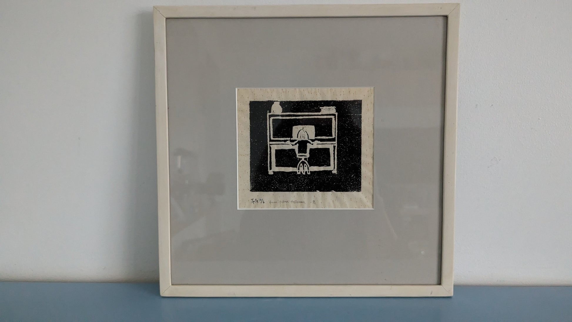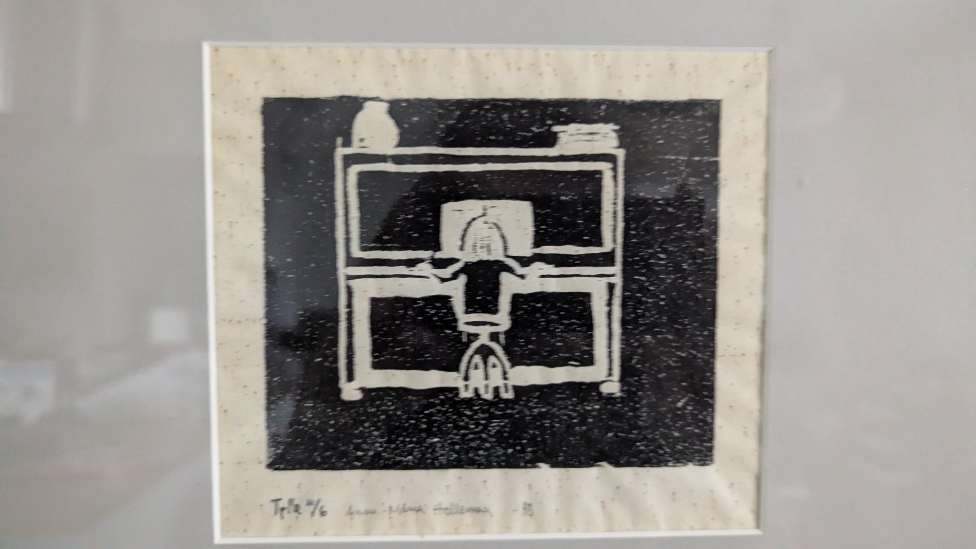 Anna-Maria Hellemaan signeeraama ja numeroima pianonsoittaja aiheinen puupiirros vuodelta 1983.