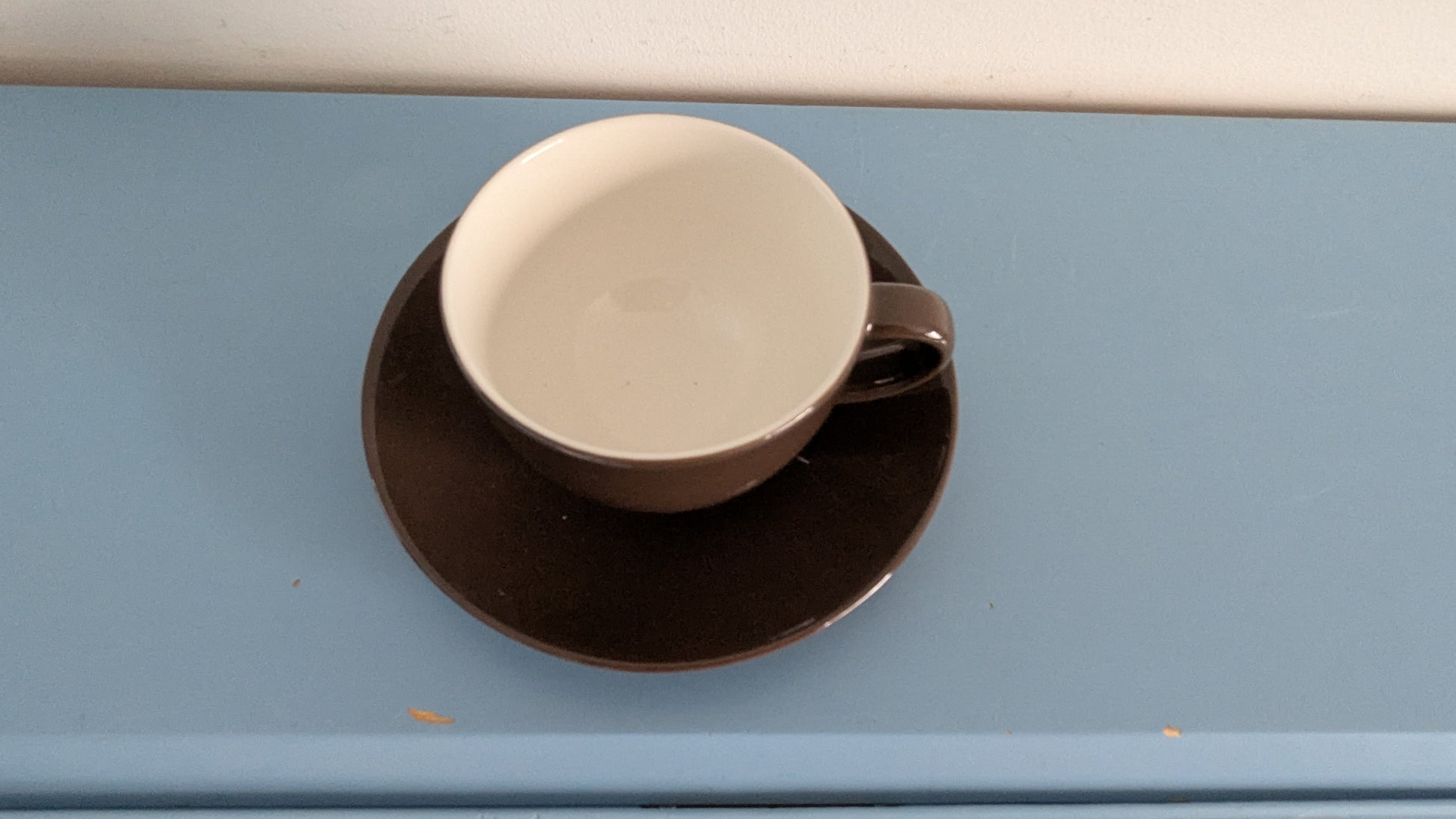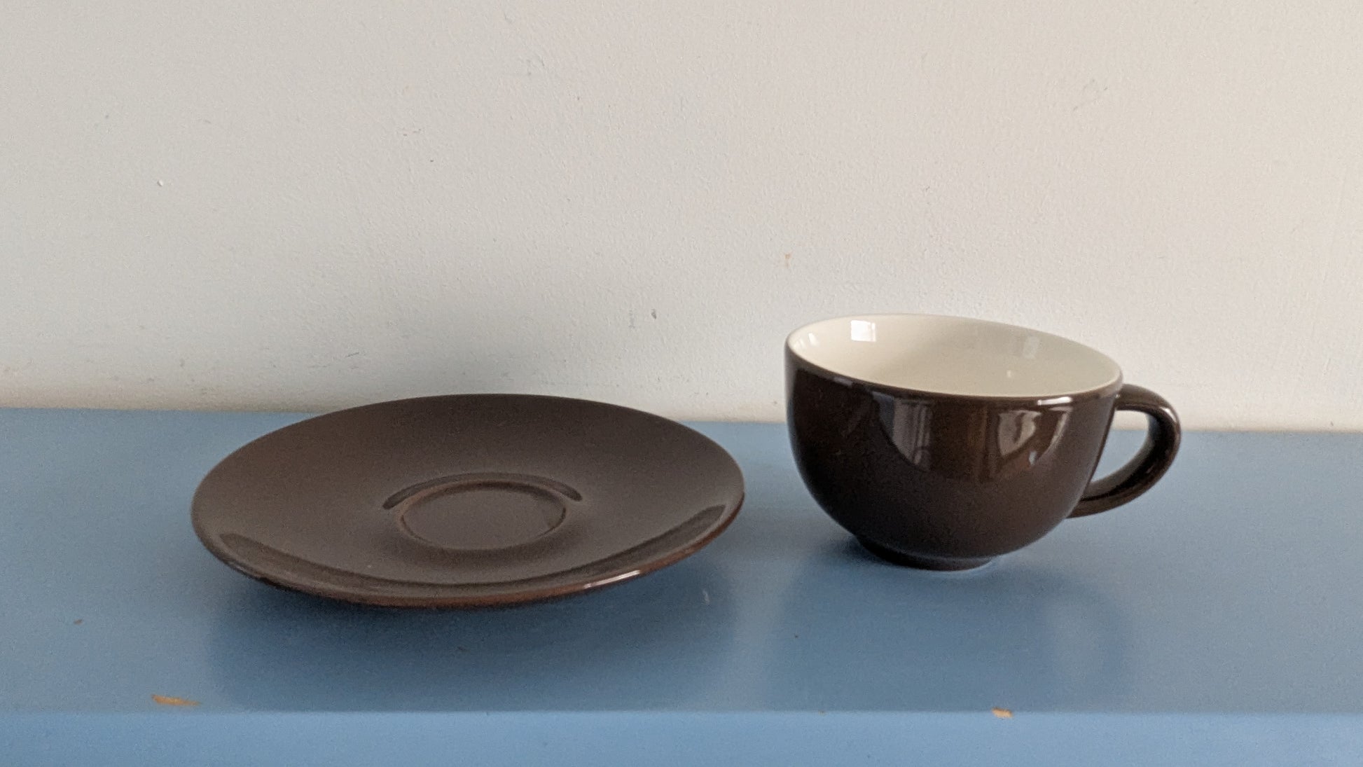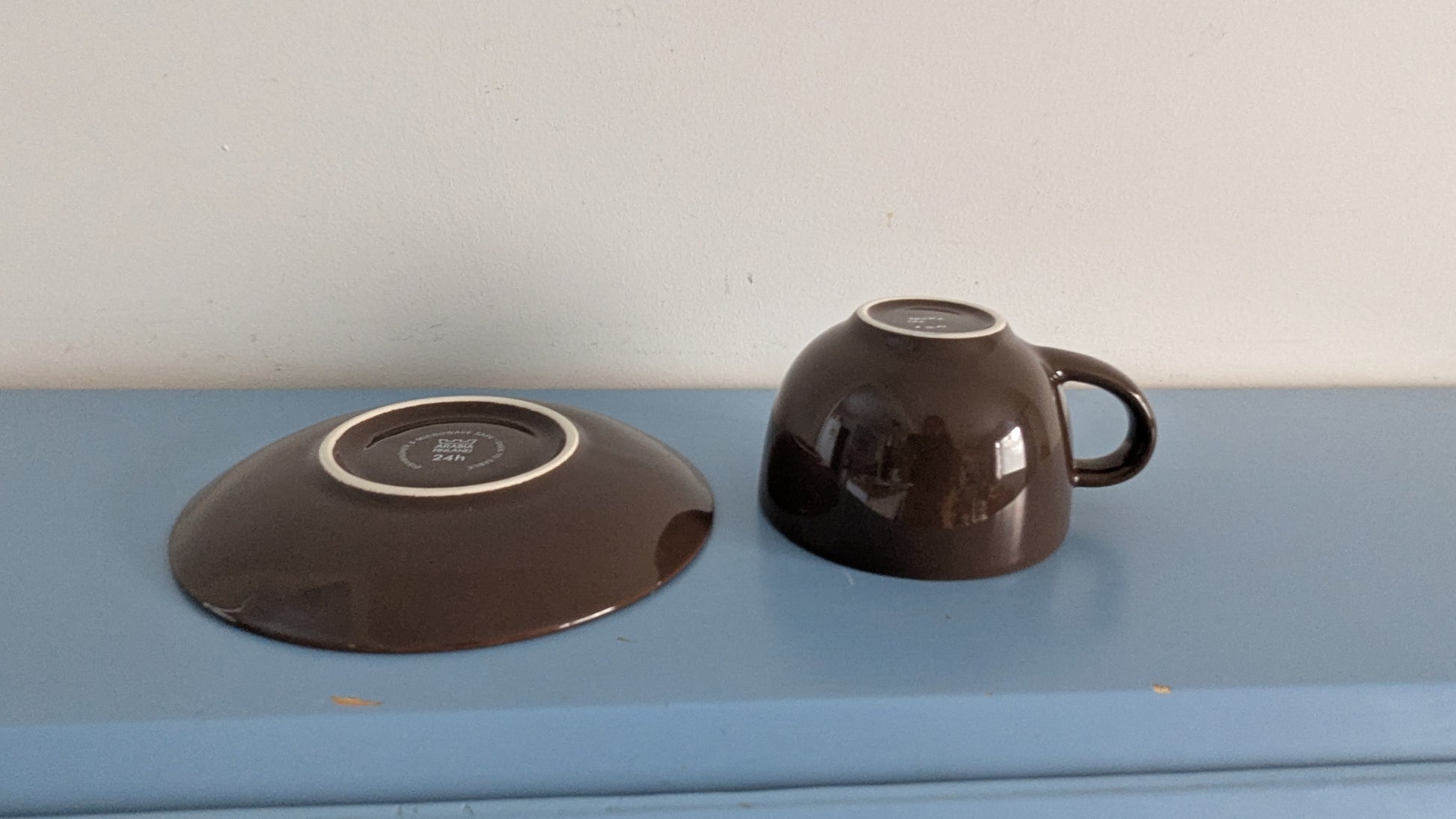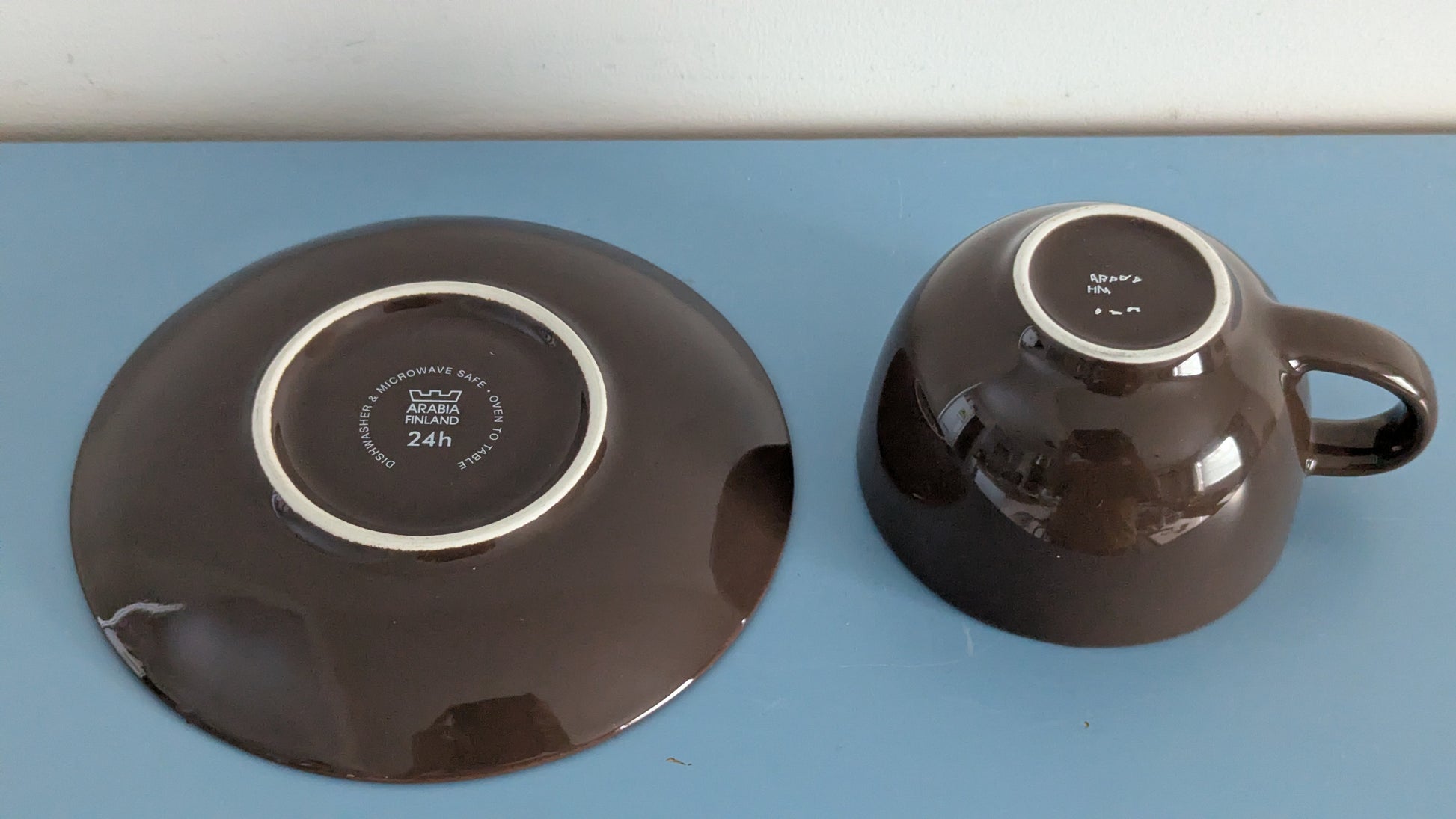 Ei iskemiä tai halkeamia. Olematonta käyttökulumaa. Lautasessa vielä leimat tallella mutta mukista kulunut lähes kokonaan jo pois.