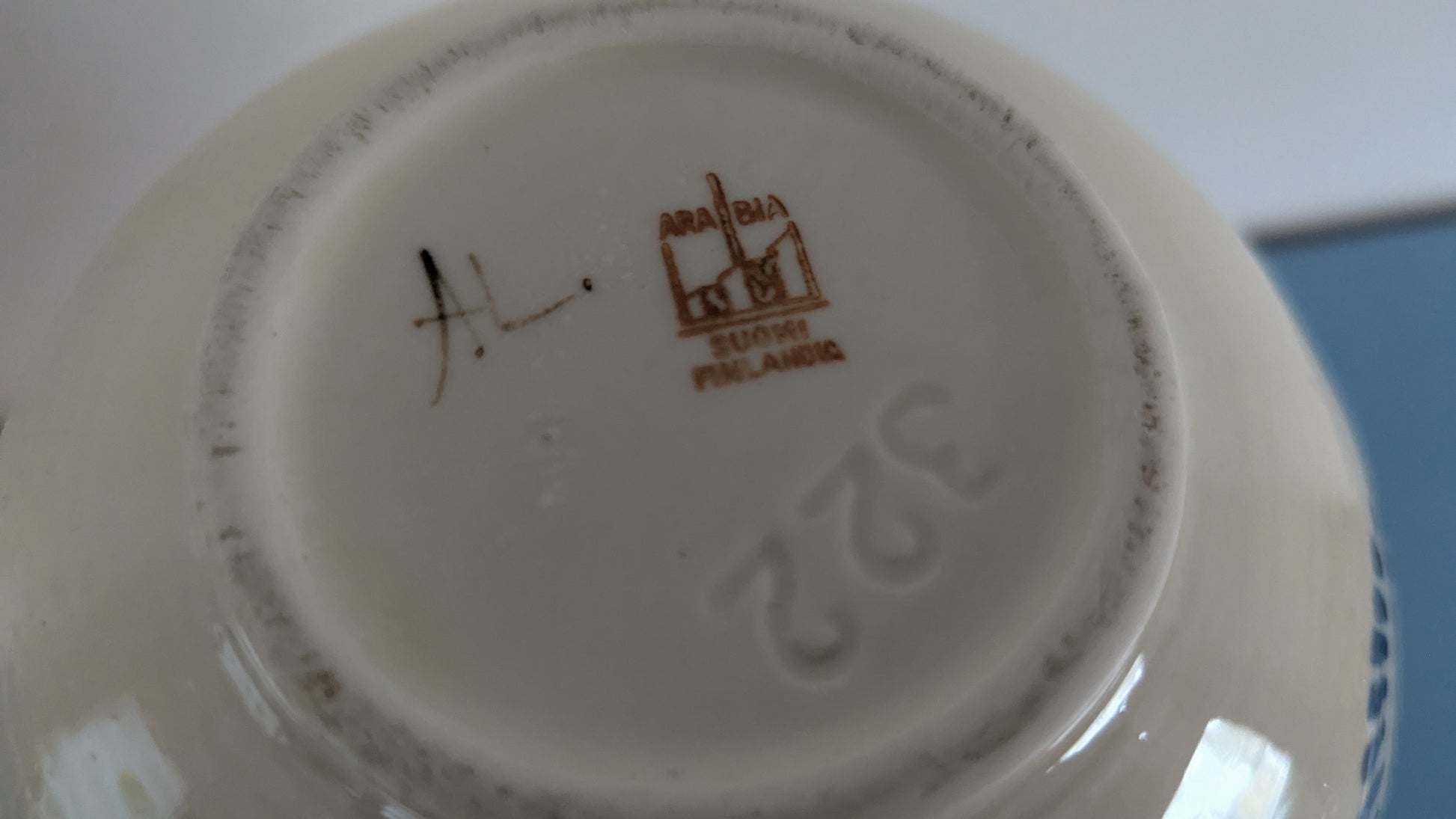 Pohjamassassa mallimerkintä 322, Arabian piippuleima ja maalarin signeeraus AL.