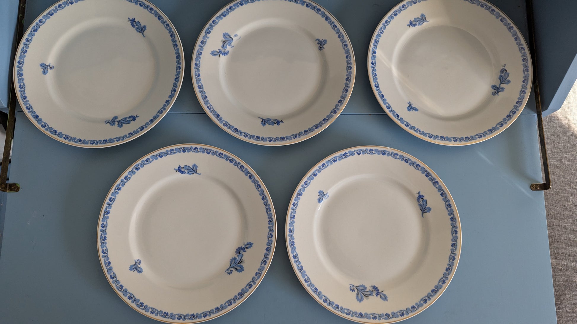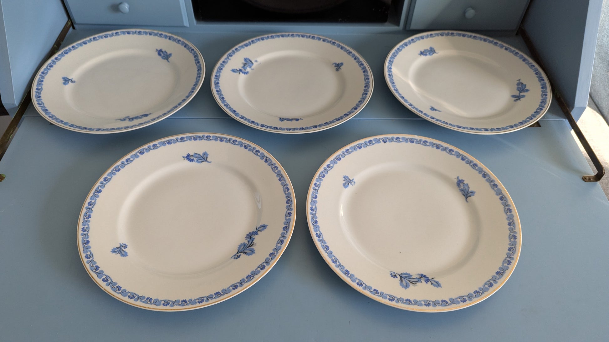 Ei halkeamia. Yhdessä lautasessa viimeisen kuvan mukainen pintaiskemä. Muissa ei iskemiä. Kultaukset hyvässä kunnossa. Vähäistä käyttökulumaa.