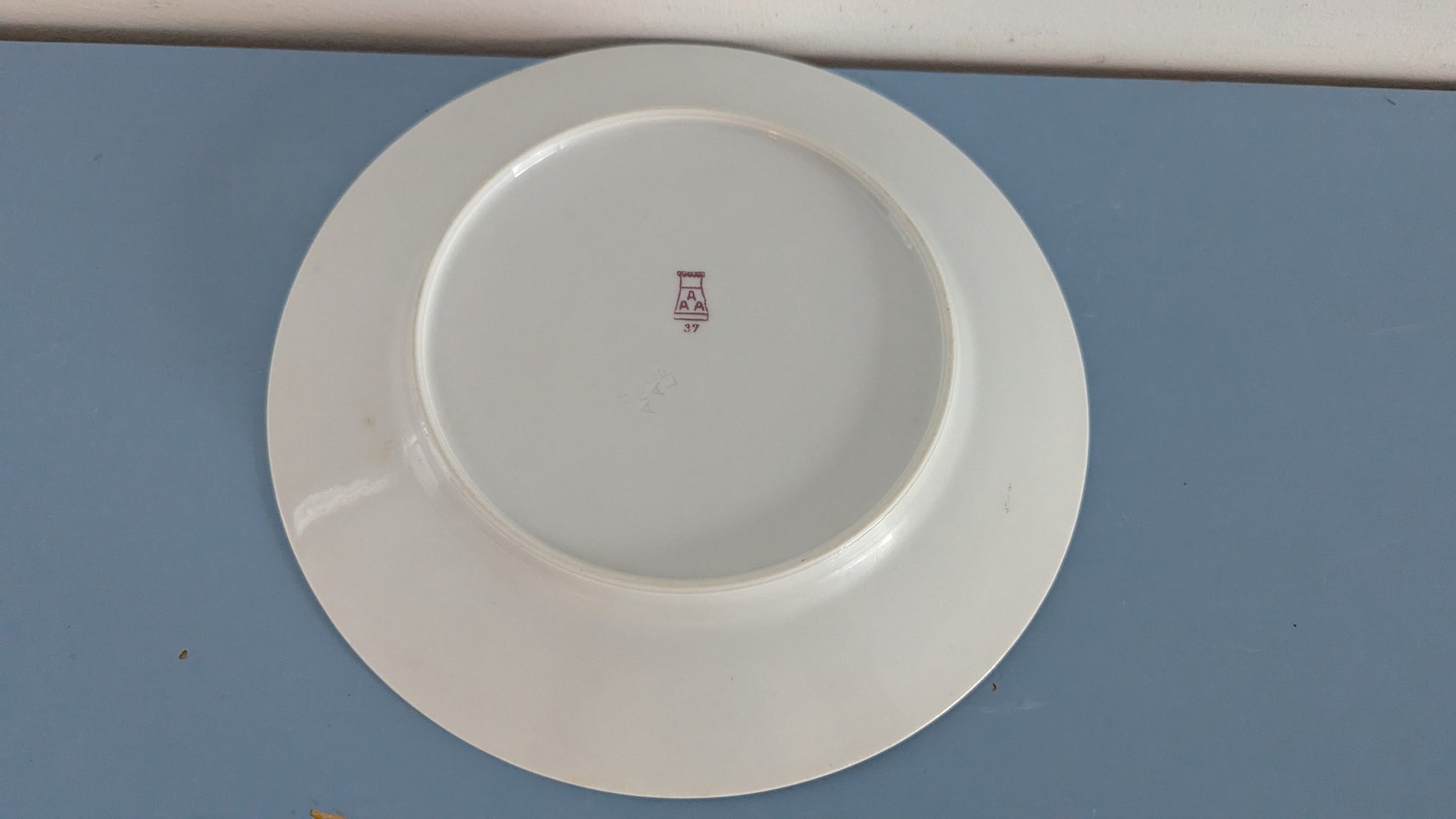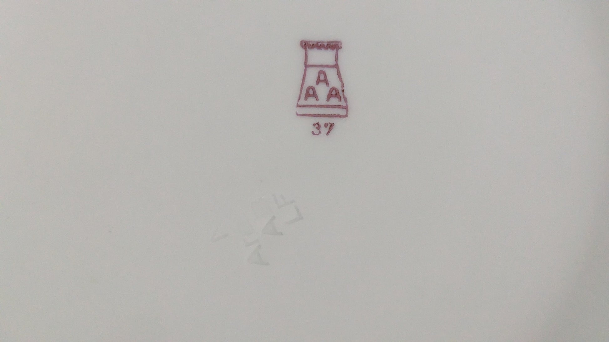 Pohjassa AAA-leima joka oli käytössä 1928-1932. AB-malli taas suunniteltiin vuonna 1930 eli näiden tietojen perusteella tämä vati valmistettu vuosien 1930-1932 välillä.
