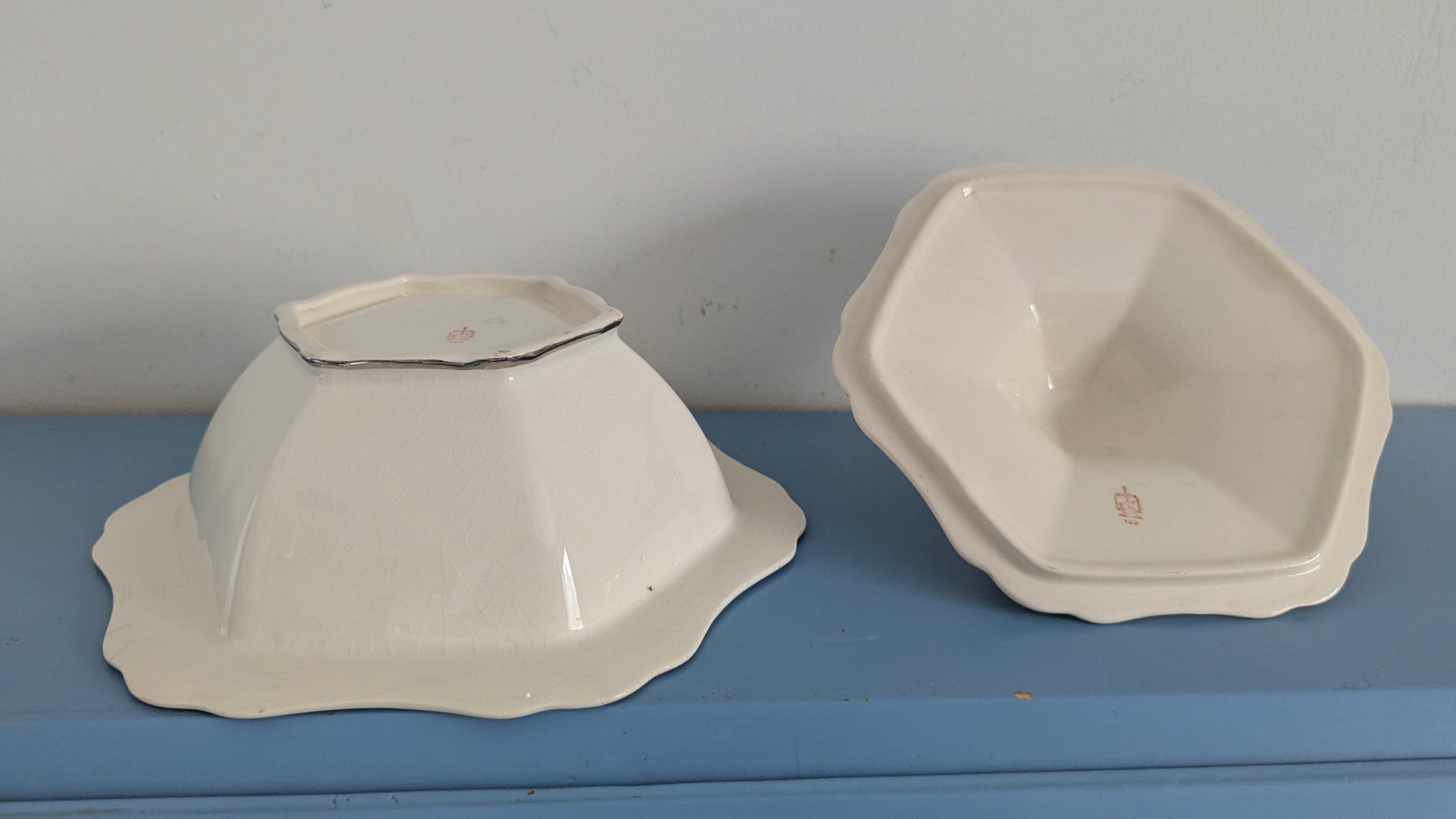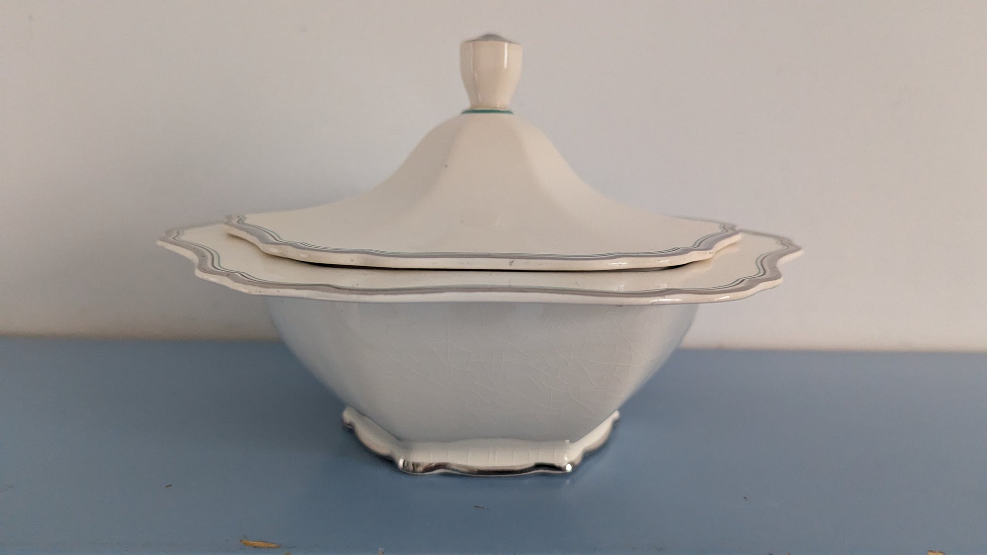 Ei iskemiä, halkeamia tai käyttökulumaa mutta krakeloitumista löytyy joka puolelta kulhoa. Kannessa ei sitäkään. Koriste erinomaisessa kunnossa.