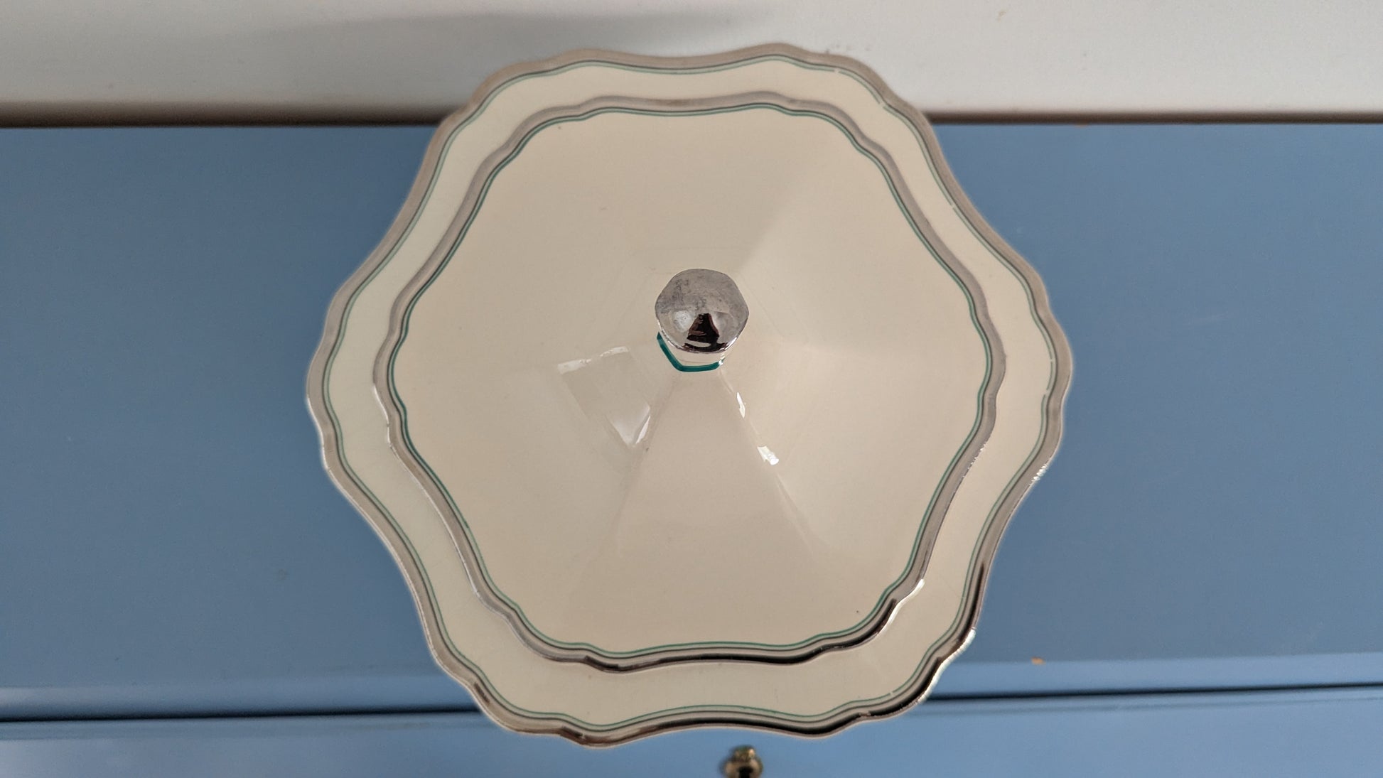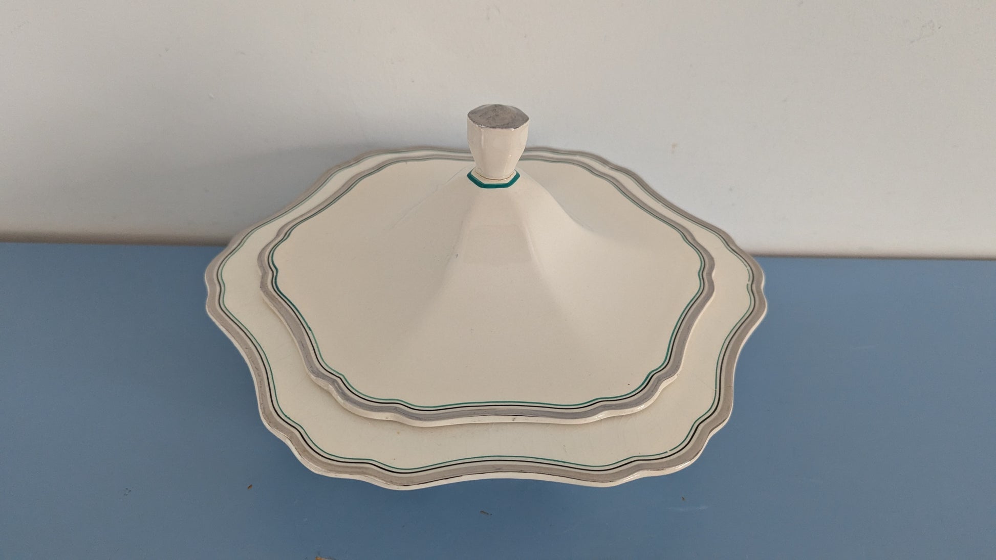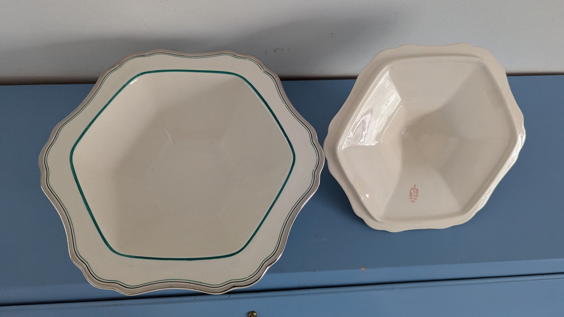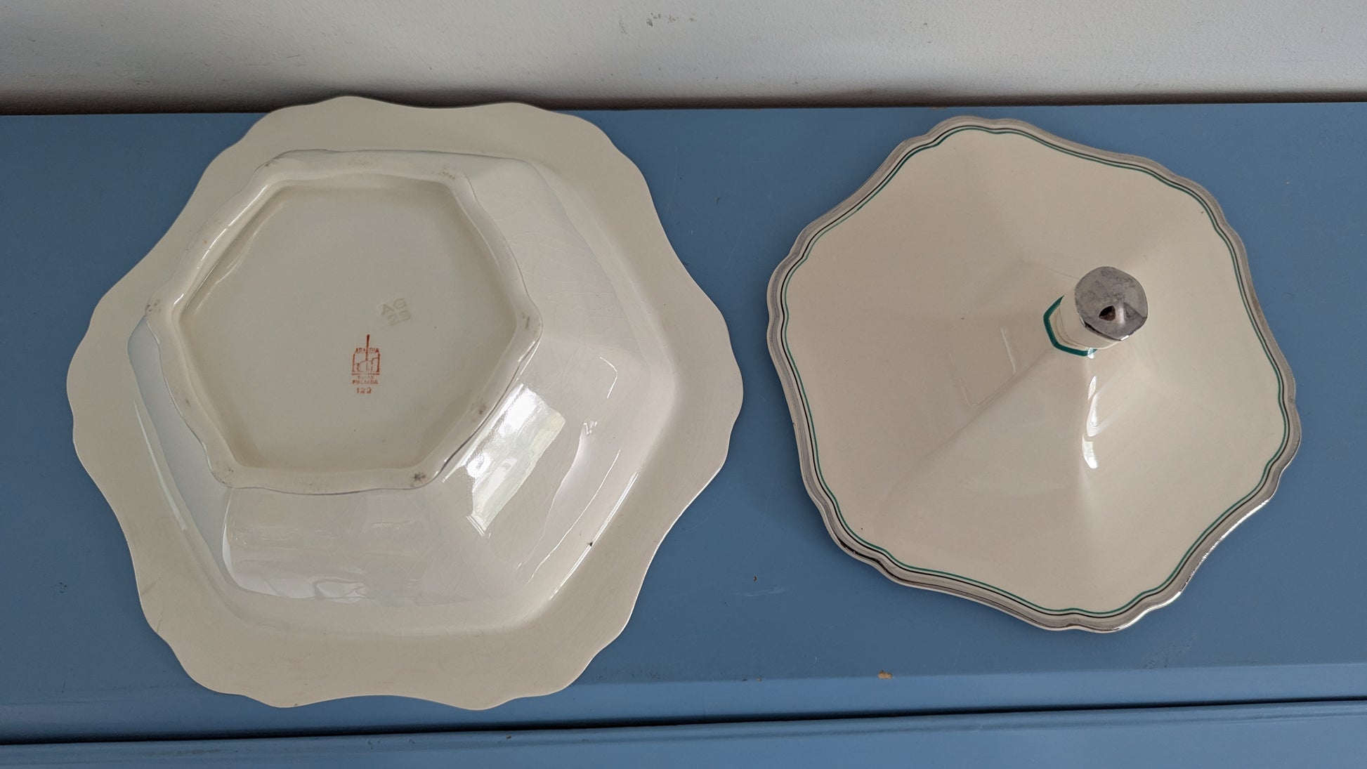 Koriste muuten sama kuin koriste numero 21 mutta punaisen raidan sijaan tässä on vihreä raita. Koriste nro 21 oli tuotannossa 1934-1940. Tämä varmaan samoihin aikoihin.