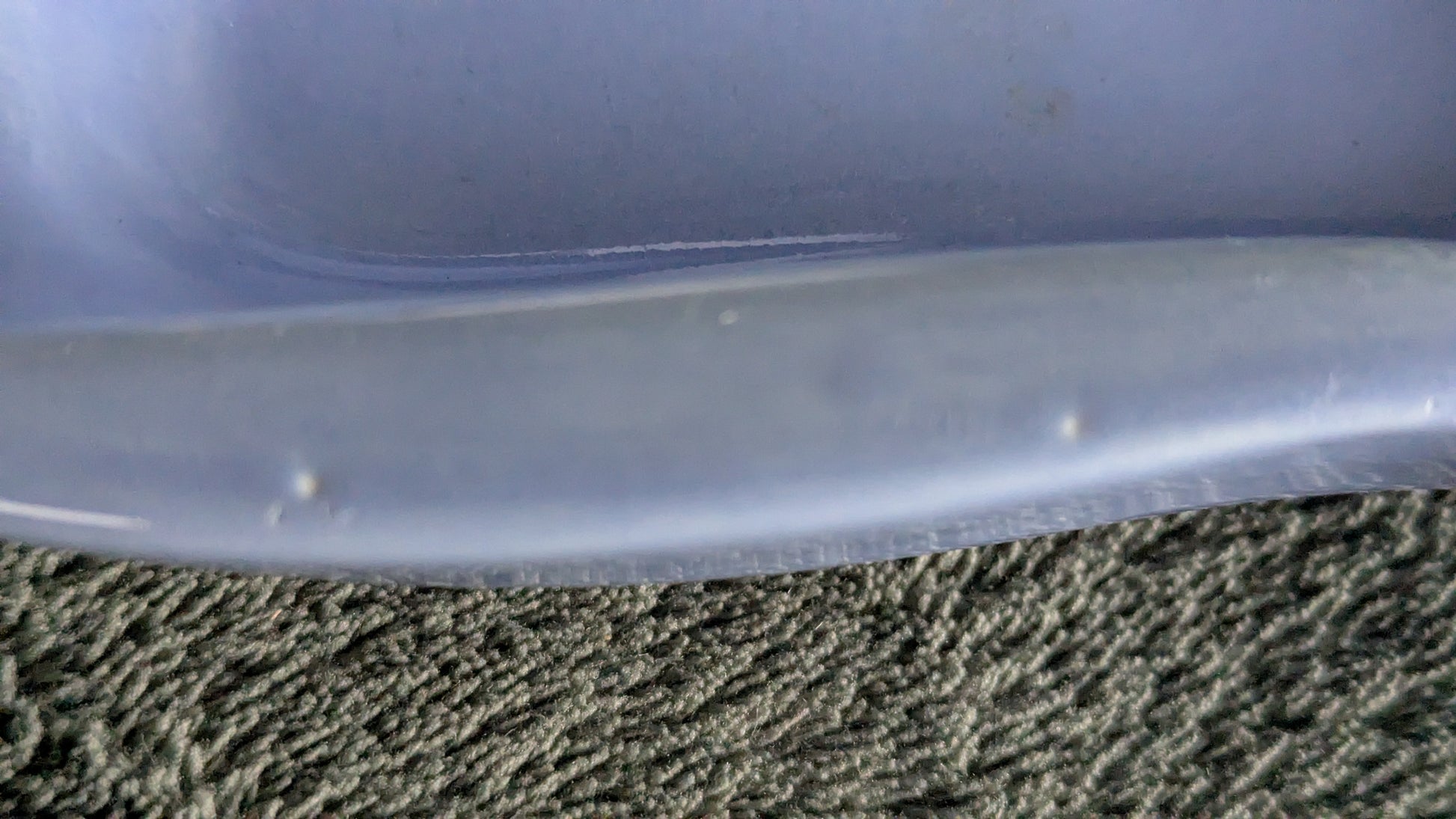 Ei iskemiä, halkeamia. Minimaalista käytönkulumaa. Reunassa neljä valkoista pistettä / koloa. Ovat nuppineulan terän kokoisia. Tullut jo valmistusvaiheessa koska osan päällä on lasite.