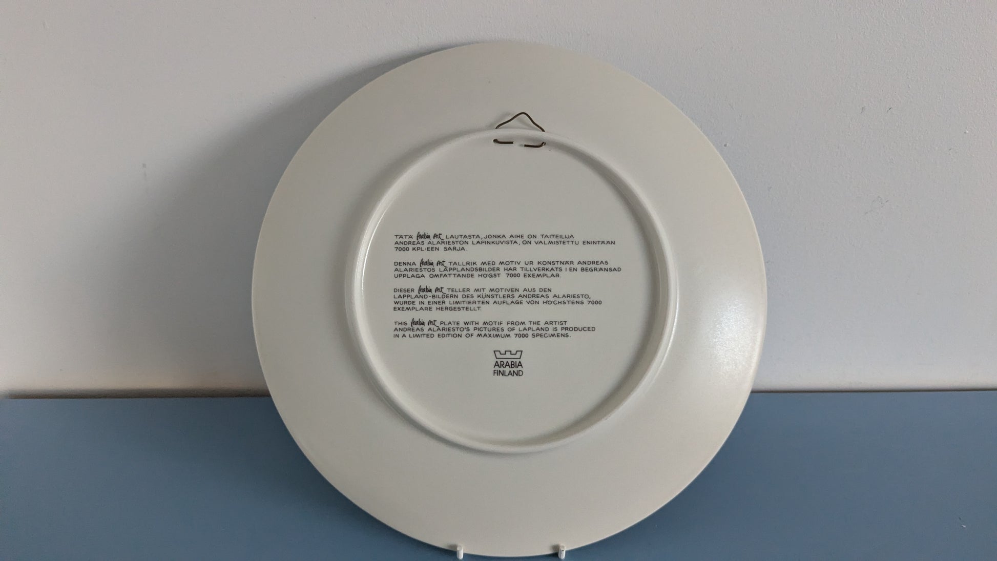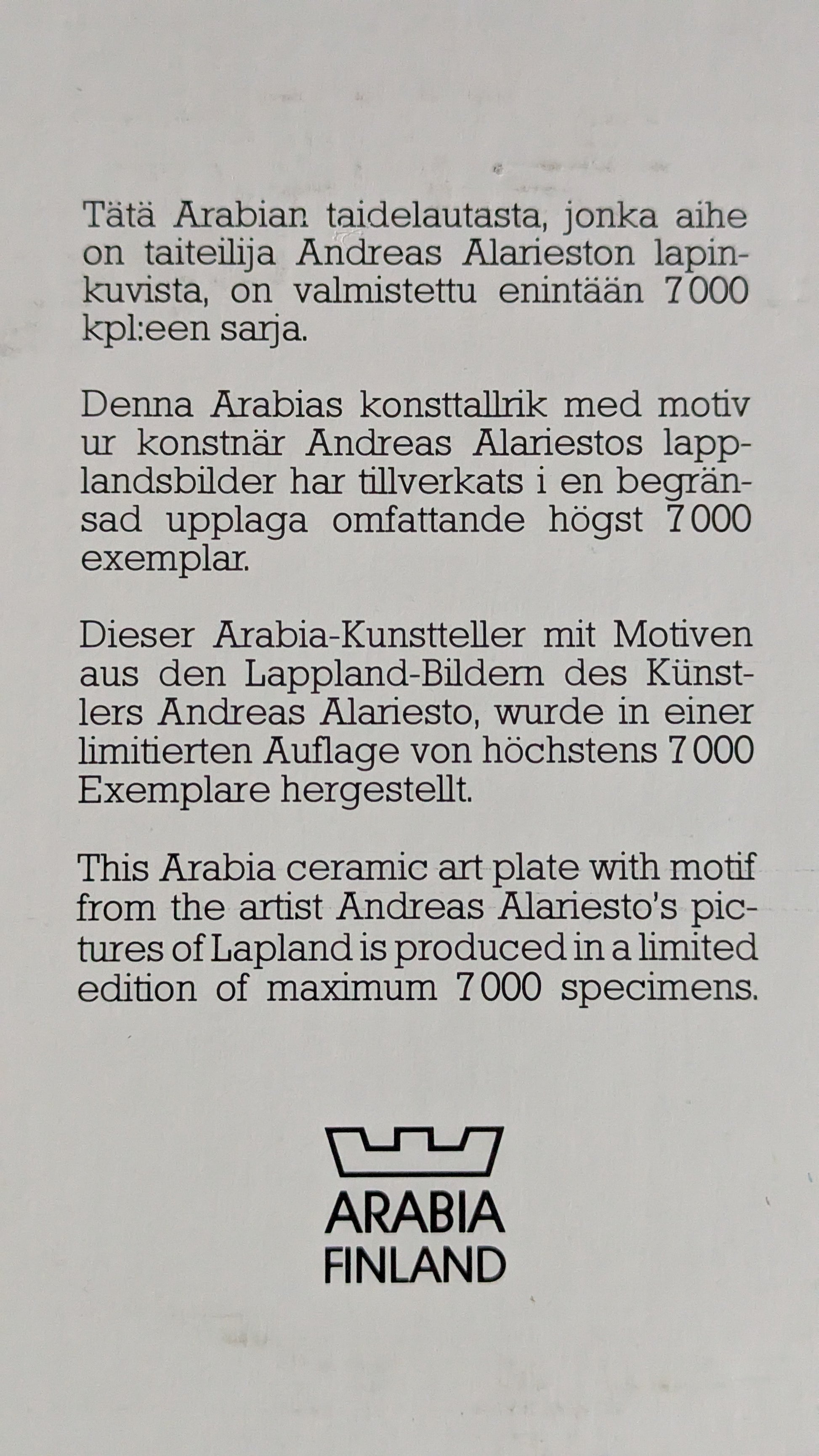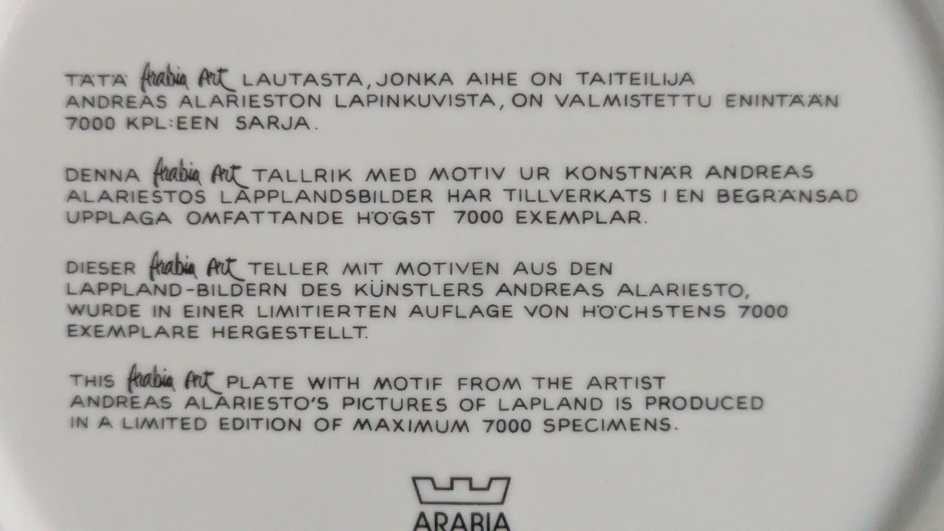 "Tämä Arabia Art lautasta, jonka aihe on taiteilija Andreas Alarieston lapinkuvista, on valmistettu enintään 7000kpl:een sarja."