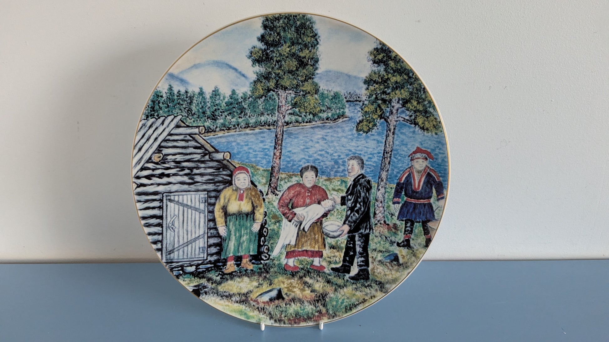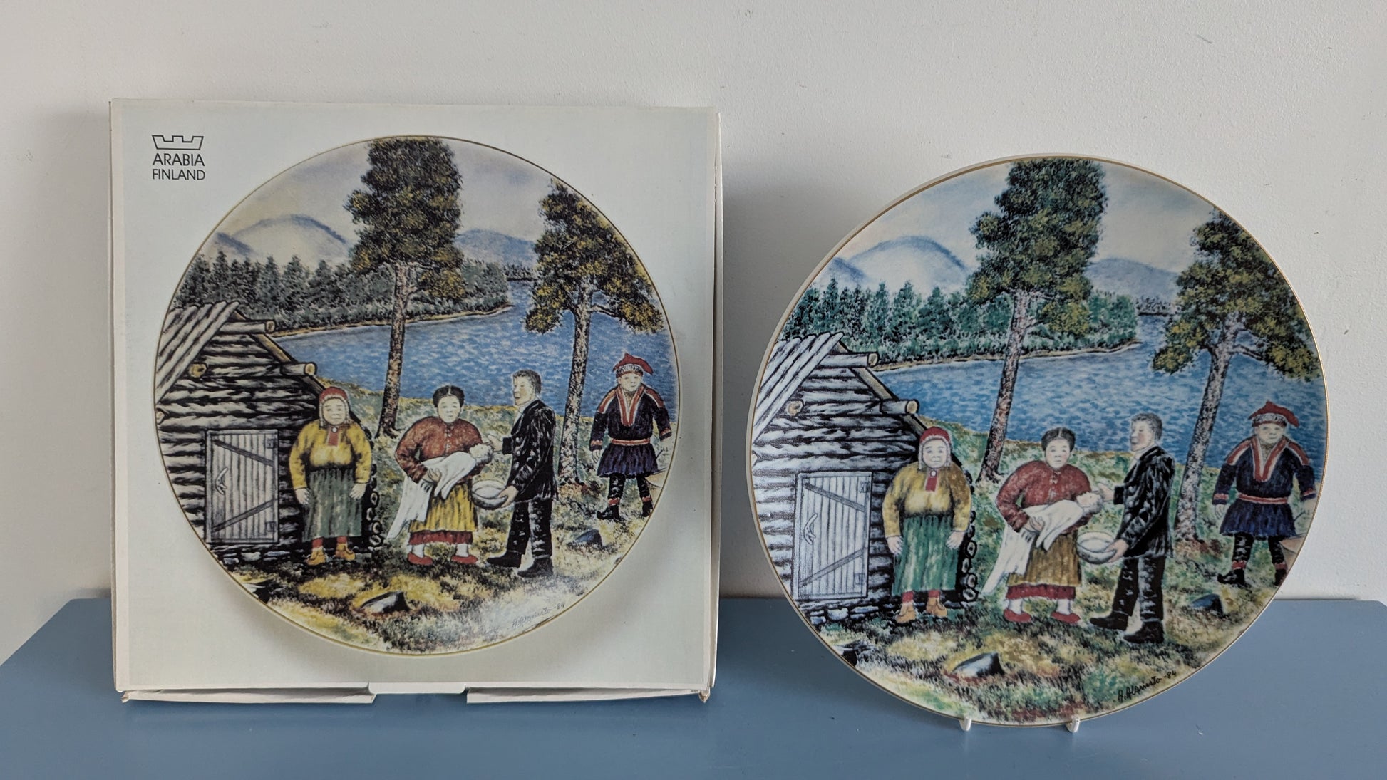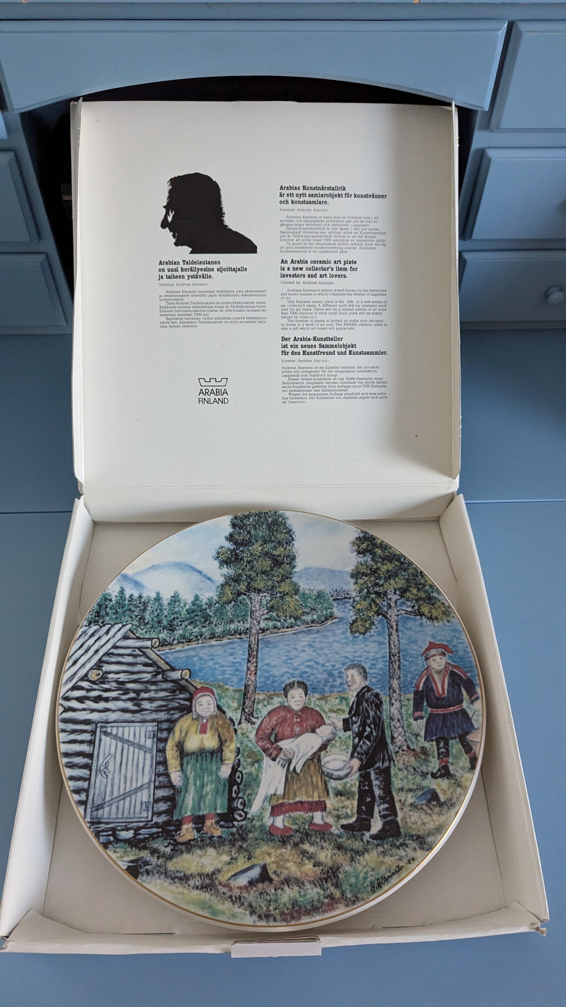 "Tämä Arabia Art lautasta, jonka aihe on taiteilija Andreas Alarieston lapinkuvista, on valmistettu enintään 7000kpl:een sarja."
