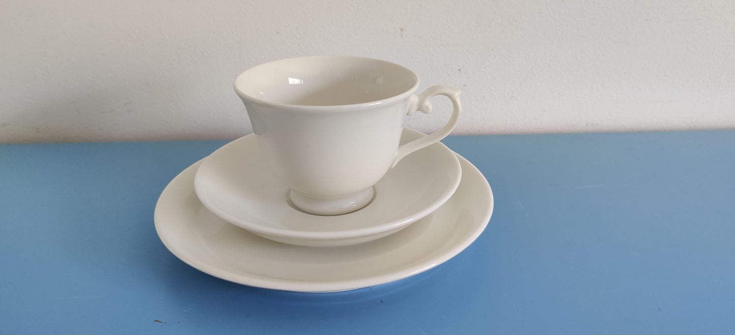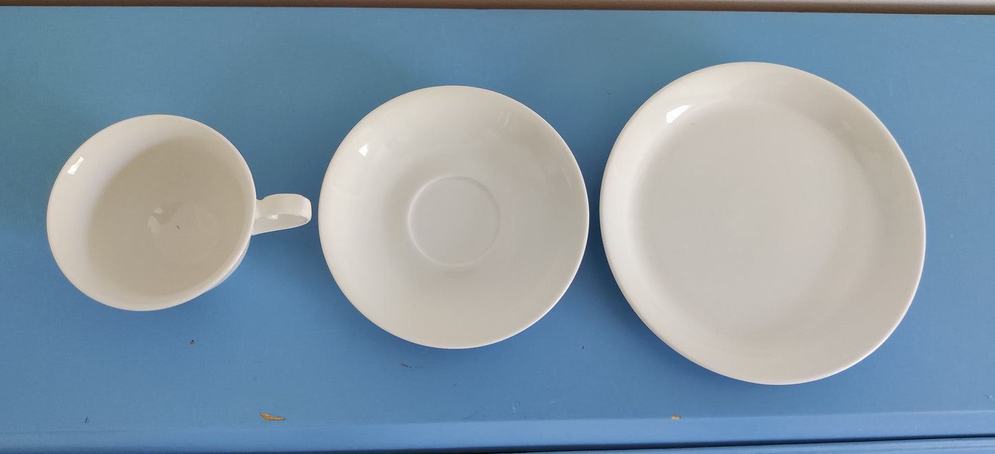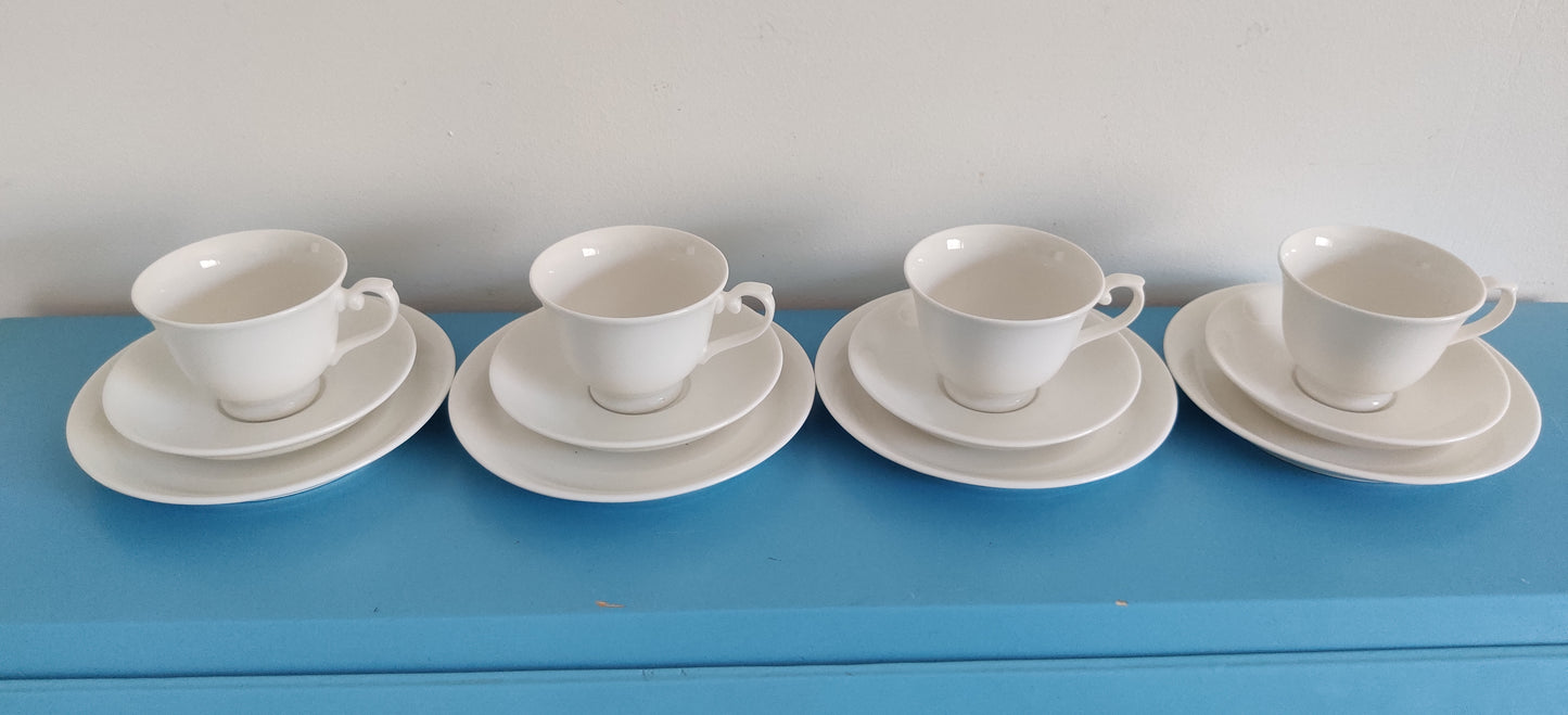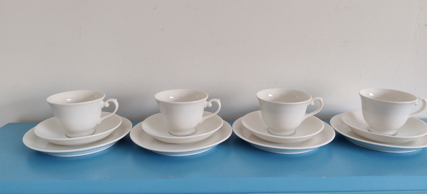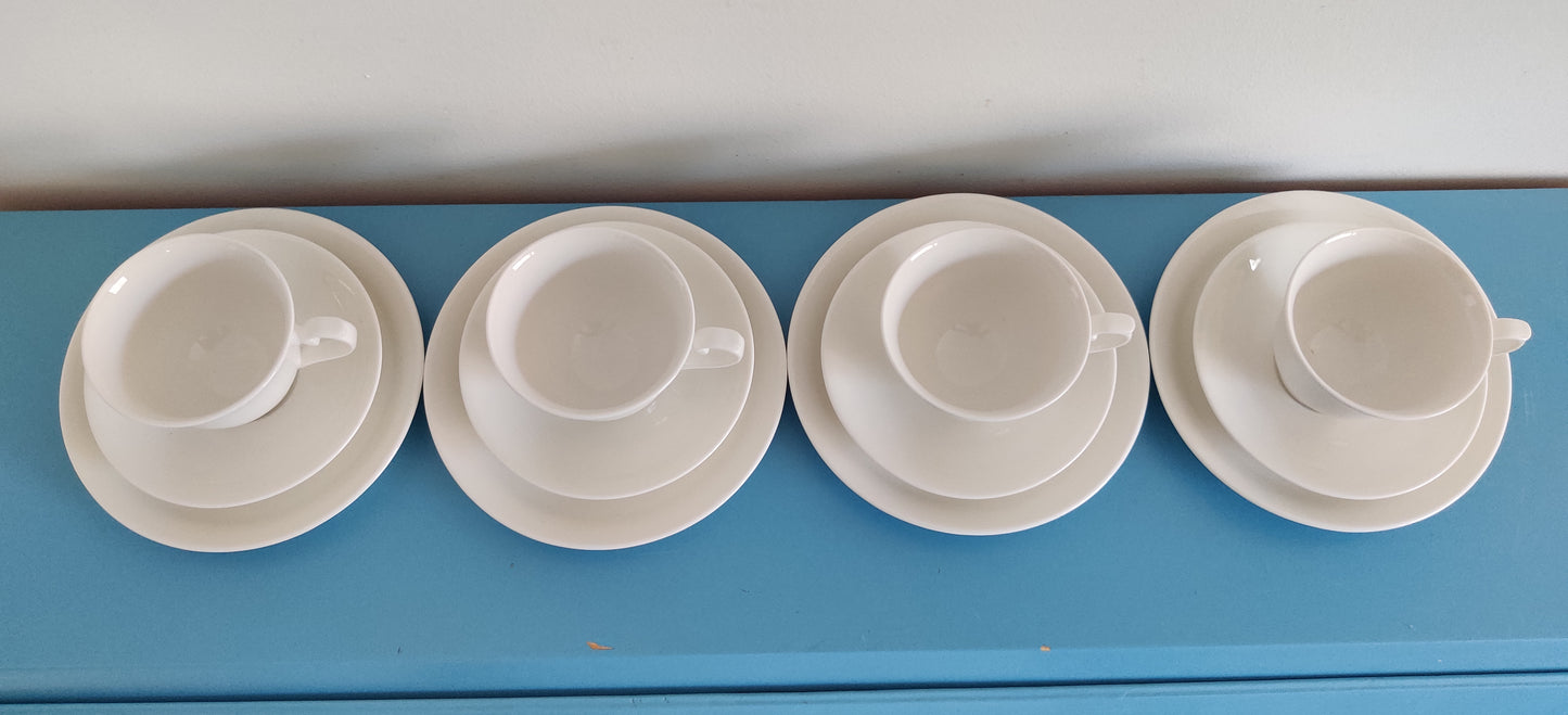 Valkoinen 12-osainen koristelematon AX-mallin kahviastiasto neljälle hengelle.