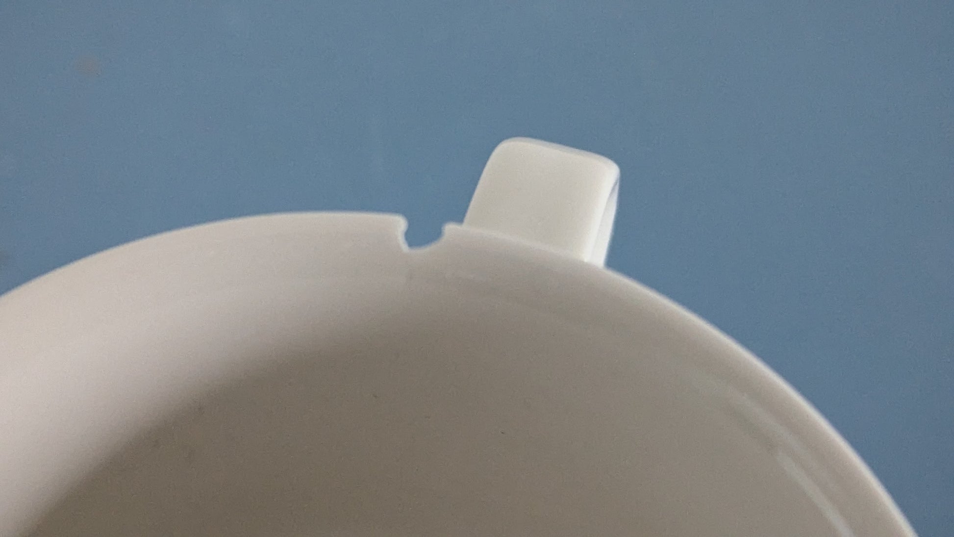 Ei halkeamia tai naarmuja. Yhden kupin yläreunassa, kahvan kohdalla, 2.5mm iskemä, mikä näkyy viimeisessä kuvassa. Muissa ei iskemiä.