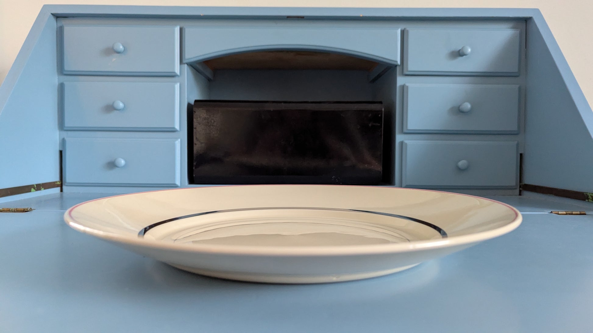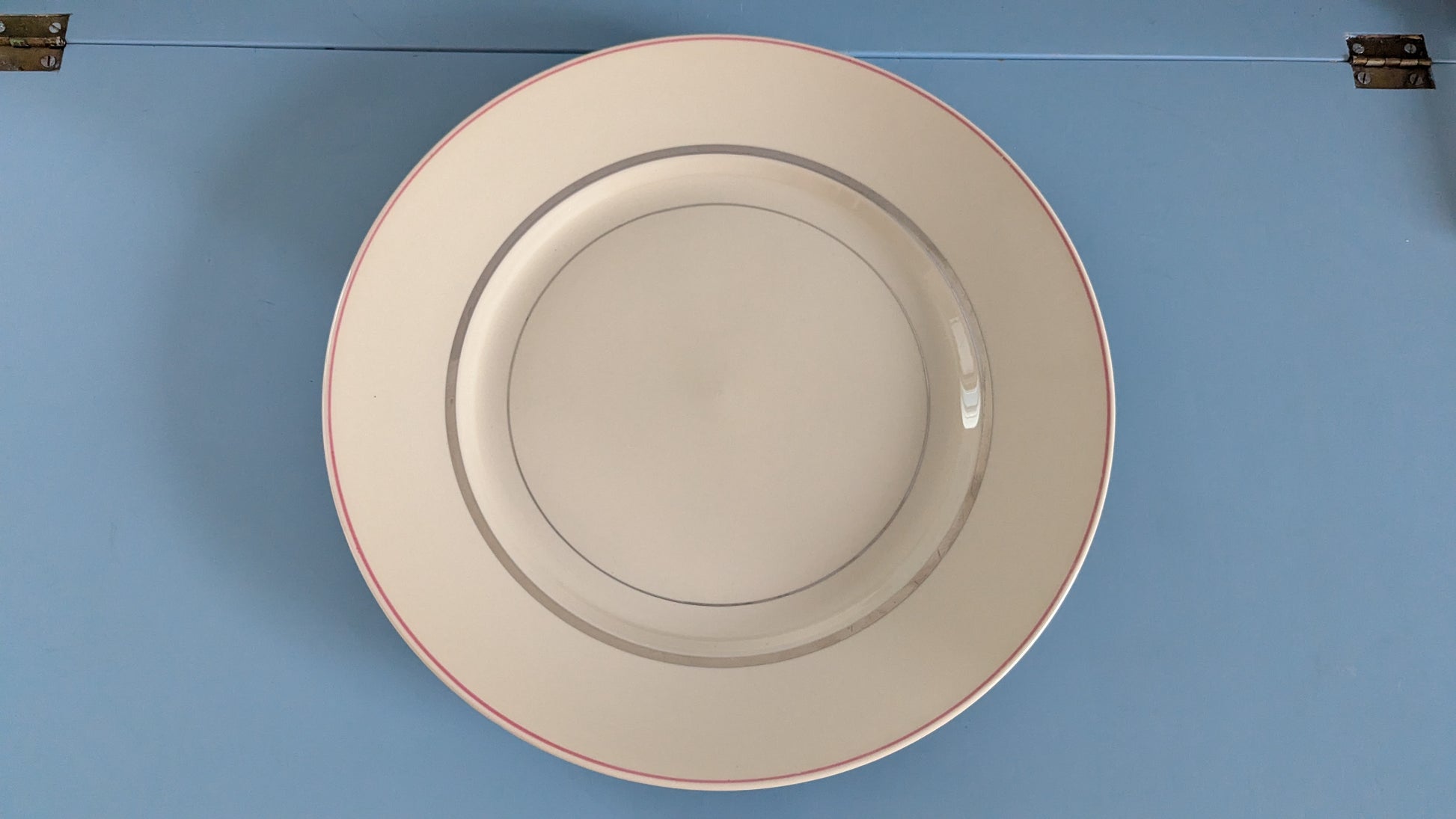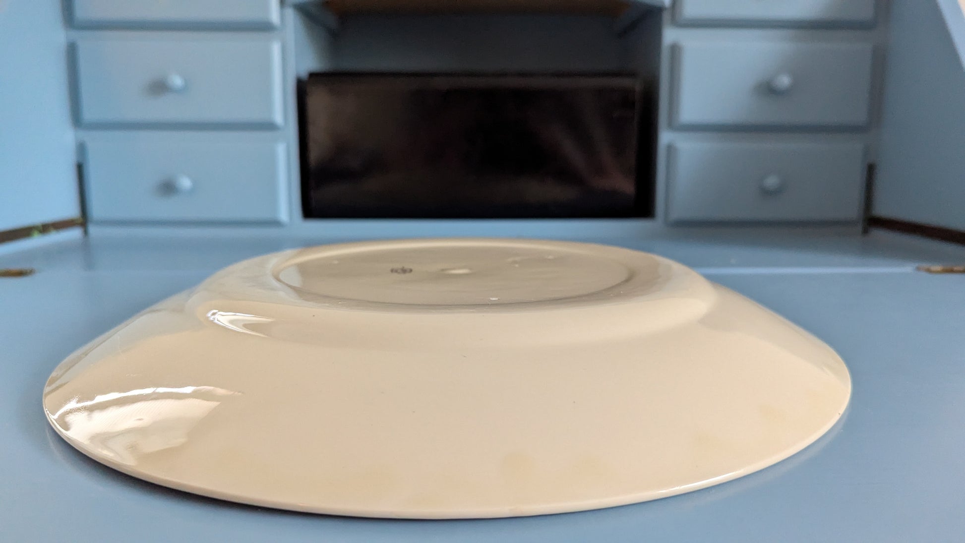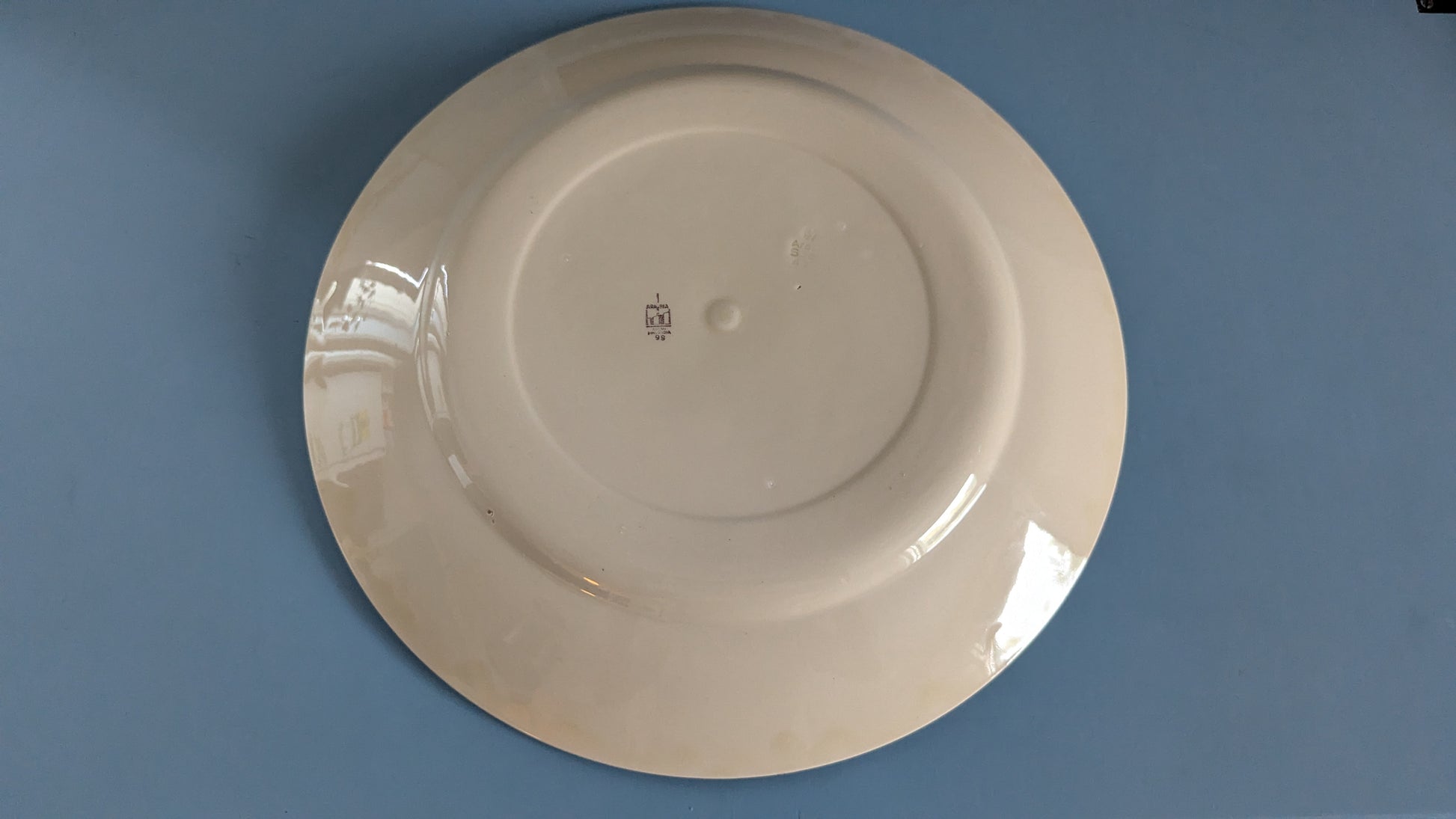 Ei iskemiä tai halkeamia. Erittäin vähäistä käyttökulumaa. Koristeraidoissa minimaalista kulumaa. Pohjapuolella jossain kohtaa reunoilta valunut lasitetta niin että niissä kohtaa hieman tummempi alue. Pieni sävyero näkyy kun pohjaa peilailee valossa. Näkyy viimeisessä kuvassa.