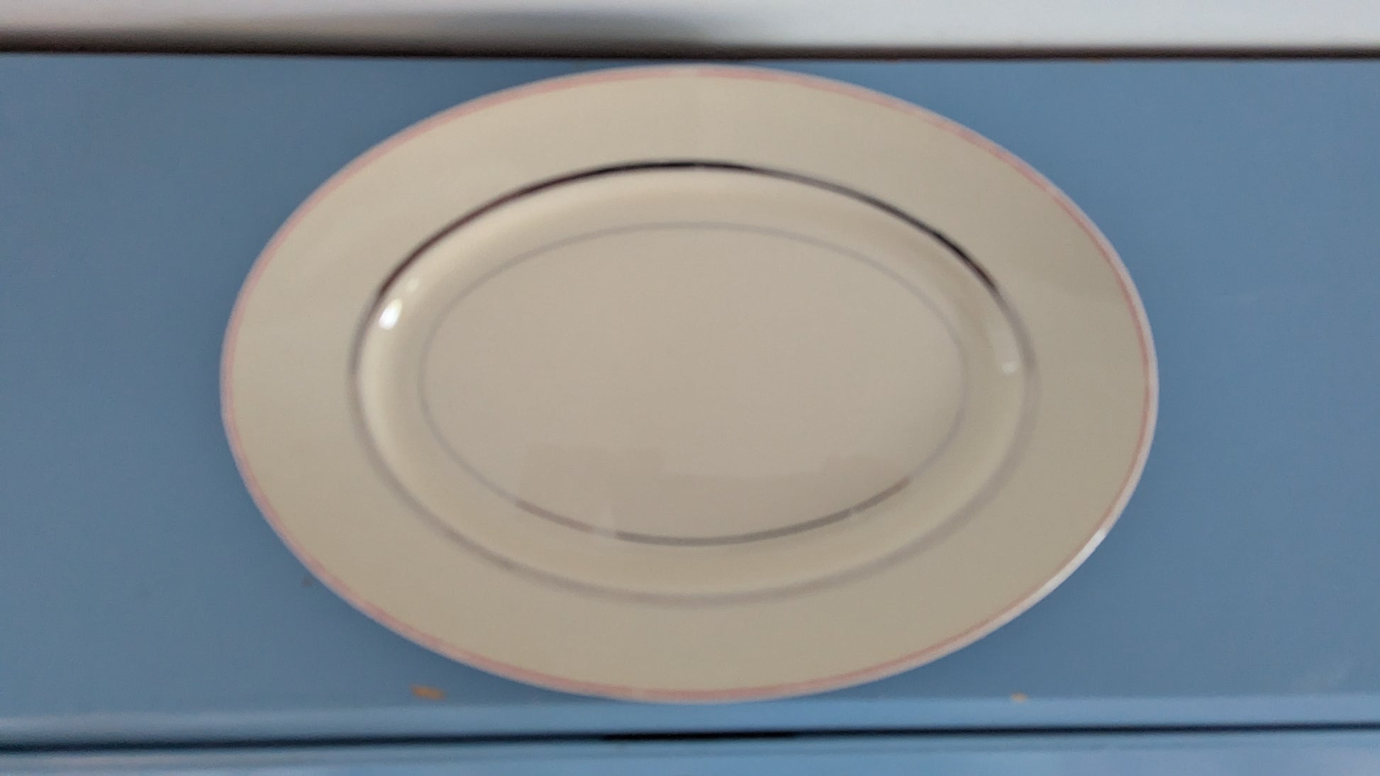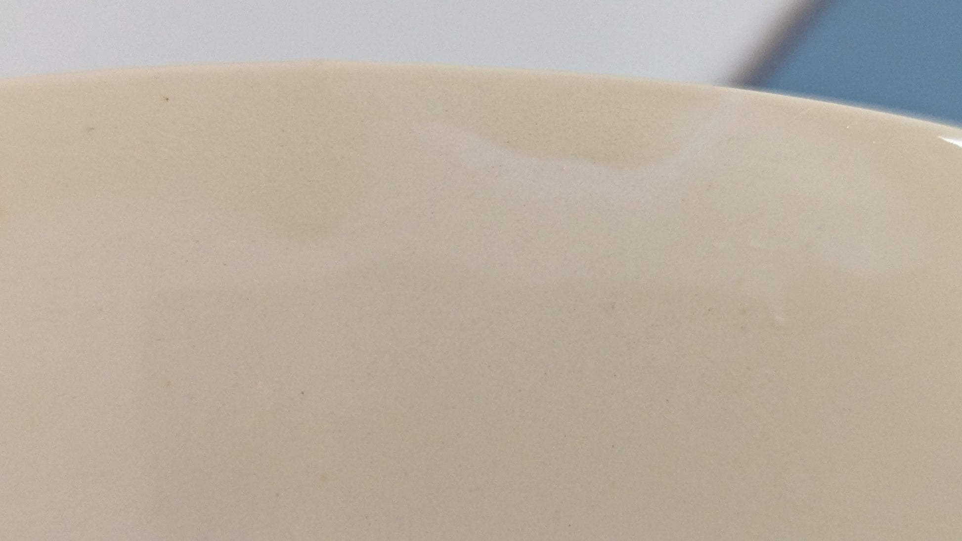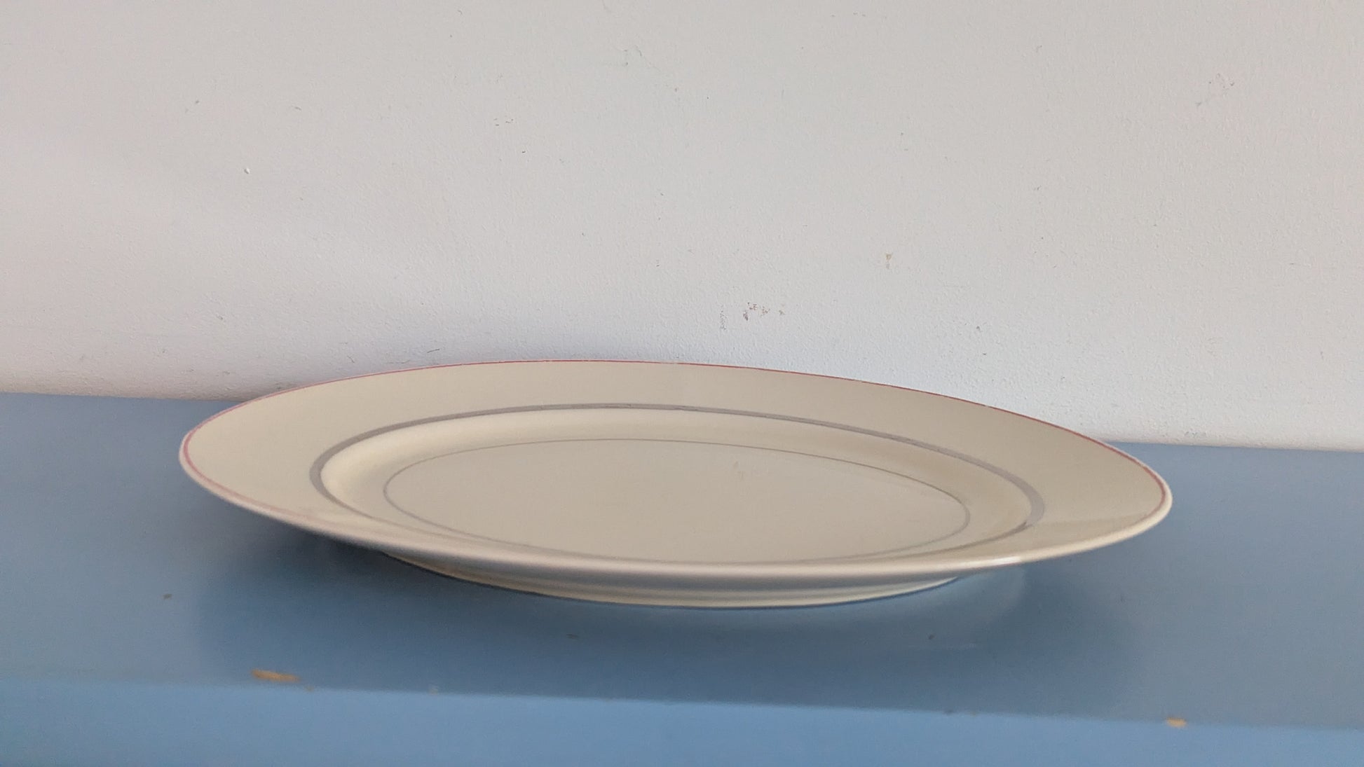 Ei iskemiä tai halkeamia. Vähäistä käyttökulumaa. Hopeiset koristeraidat hyvässä kunnossa mutta ulkoreunana punaisessa koristeraidassa kulumaa. Pohjapuolella jossain kohtaa reunoilta valunut lasitetta niin että niissä kohtaa hieman tummempi alue. Pieni sävyero näkyy kun pohjaa peilailee valossa. Näkyy viimeisessä kuvassa.