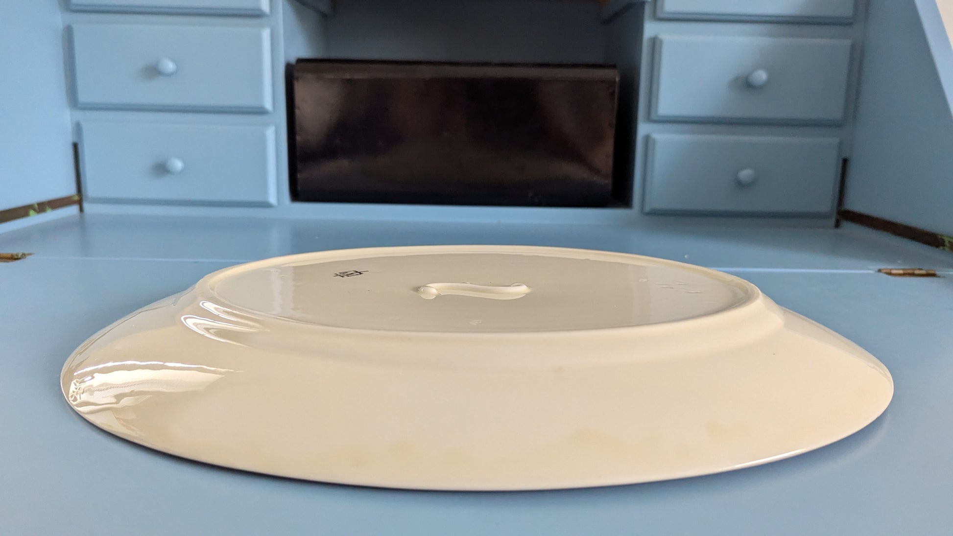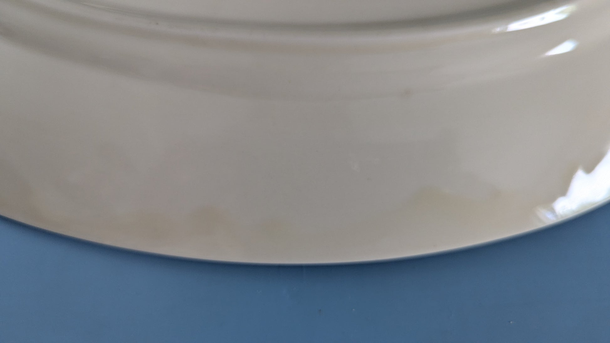 Ei iskemiä tai halkeamia. Erittäin vähäistä käyttökulumaa. Koristeraidat erinomaisessa kunnossa.. Pohjapuolella jossain kohtaa reunoilta valunut lasitetta niin että niissä kohtaa hieman tummempi alue. Pieni sävyero näkyy kun pohjaa peilailee valossa. Näkyy viimeisessä kuvassa.