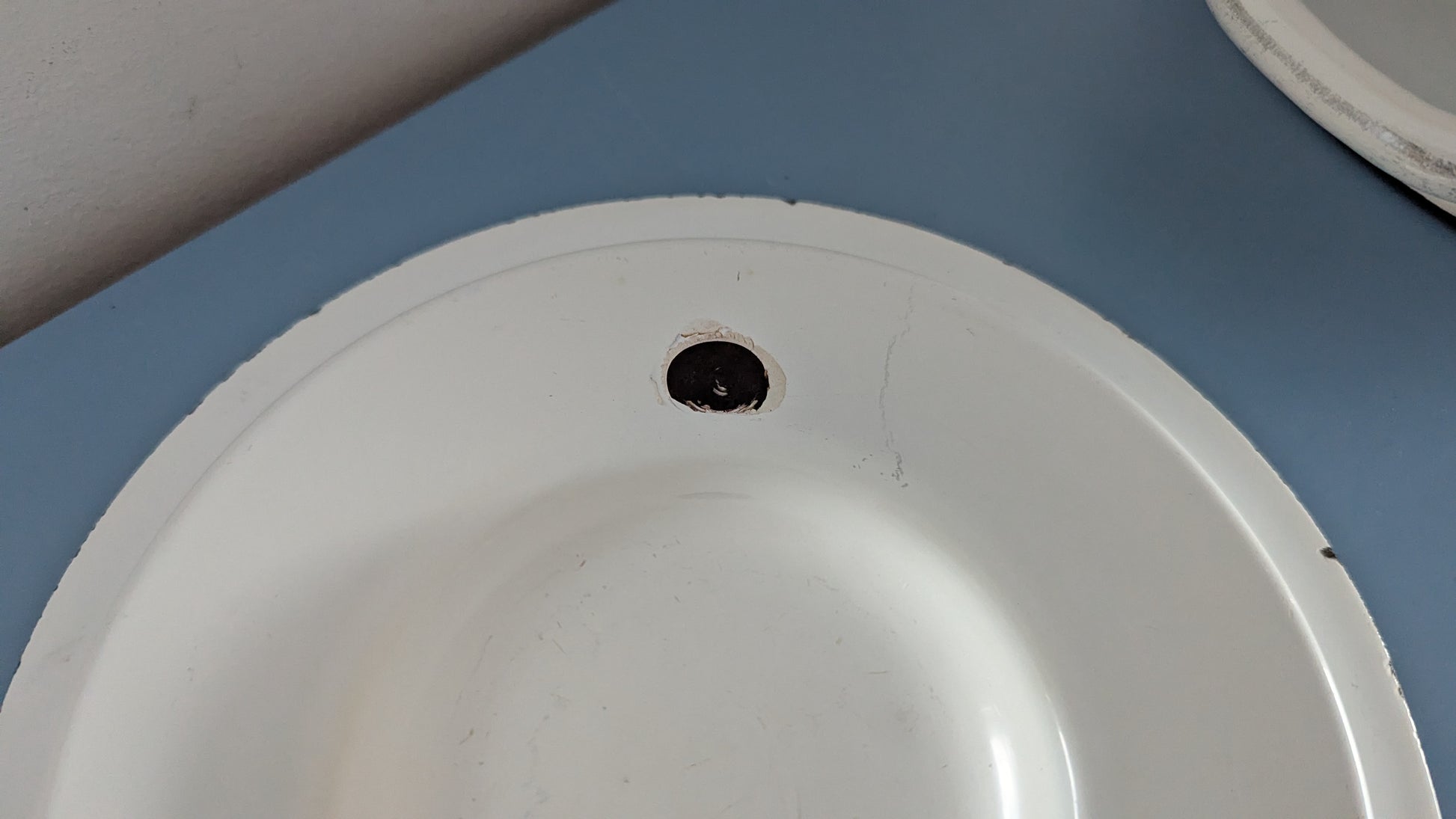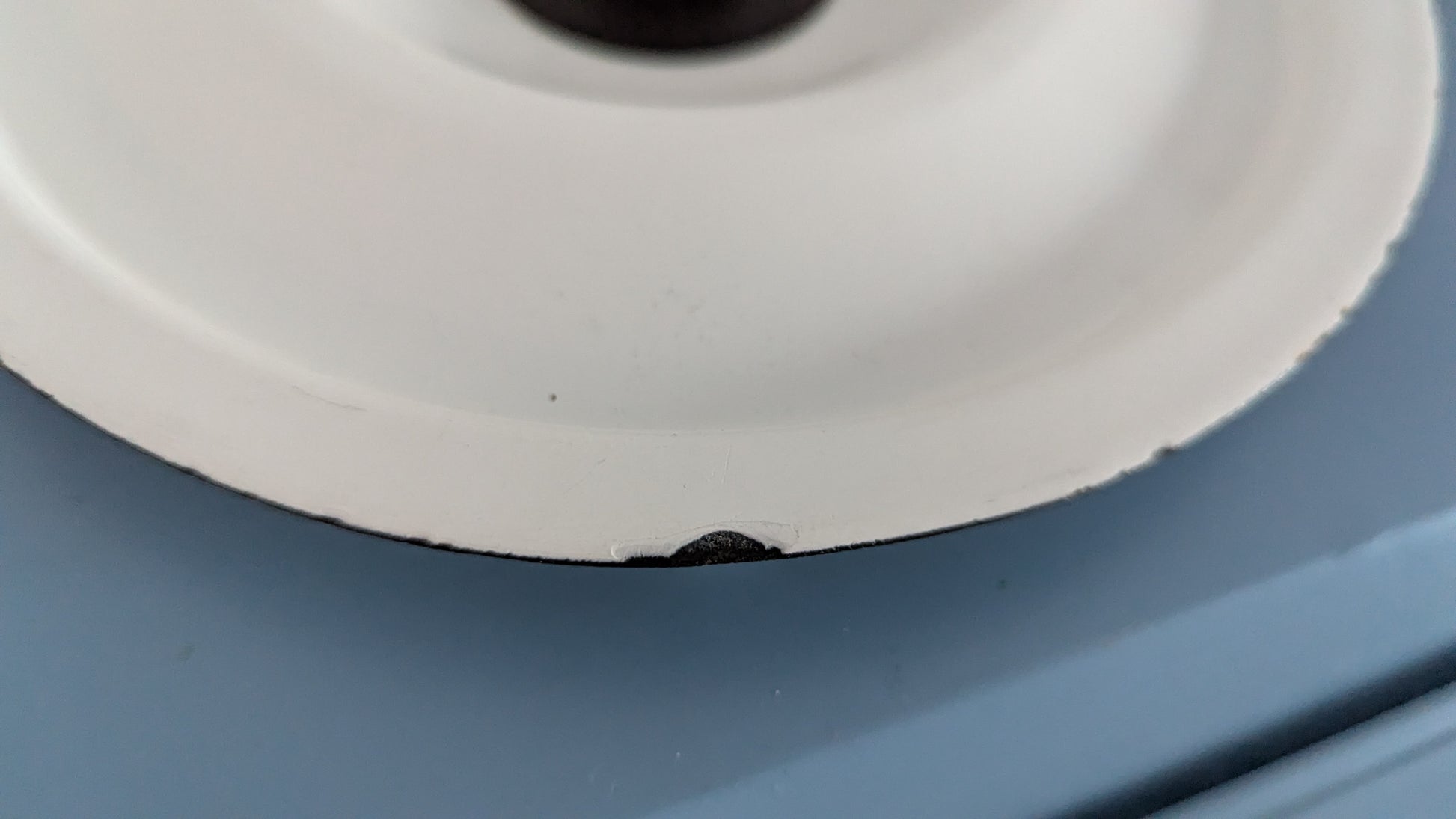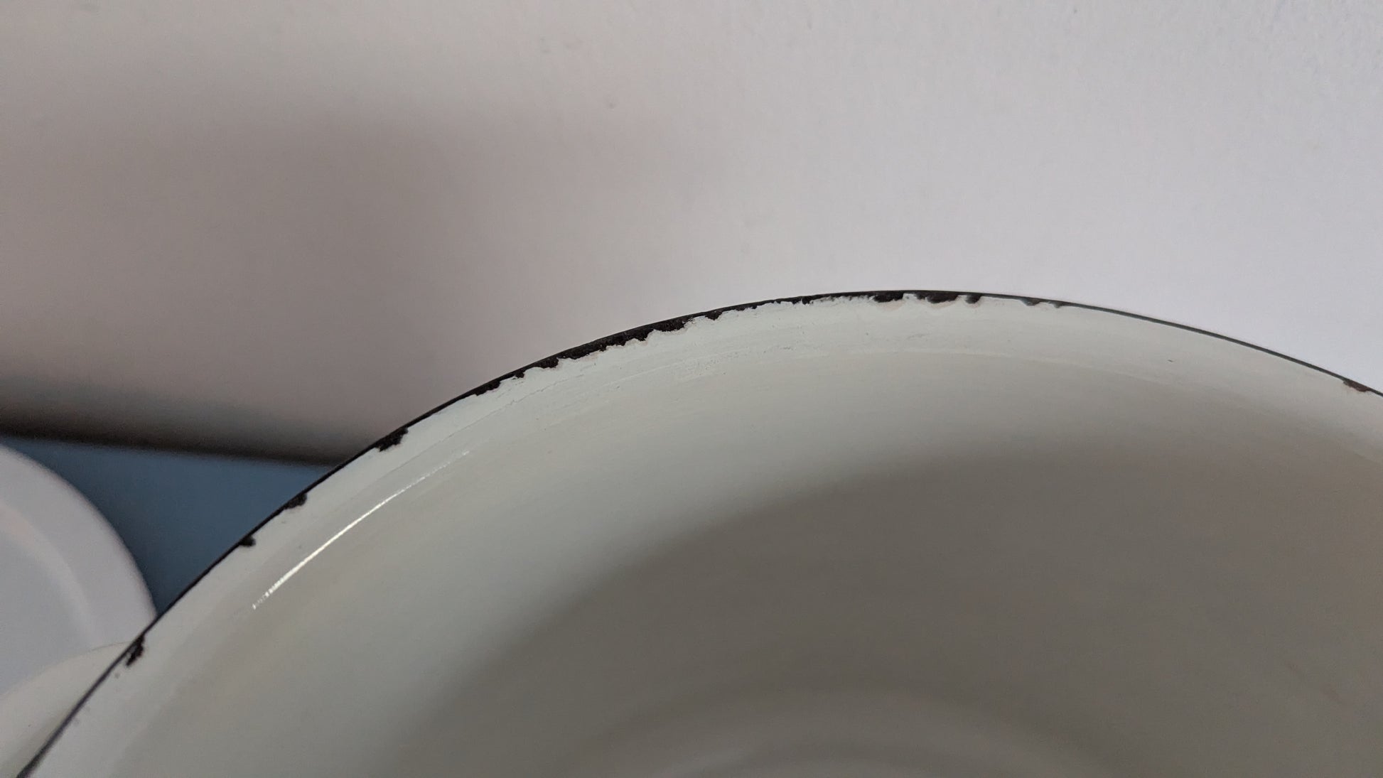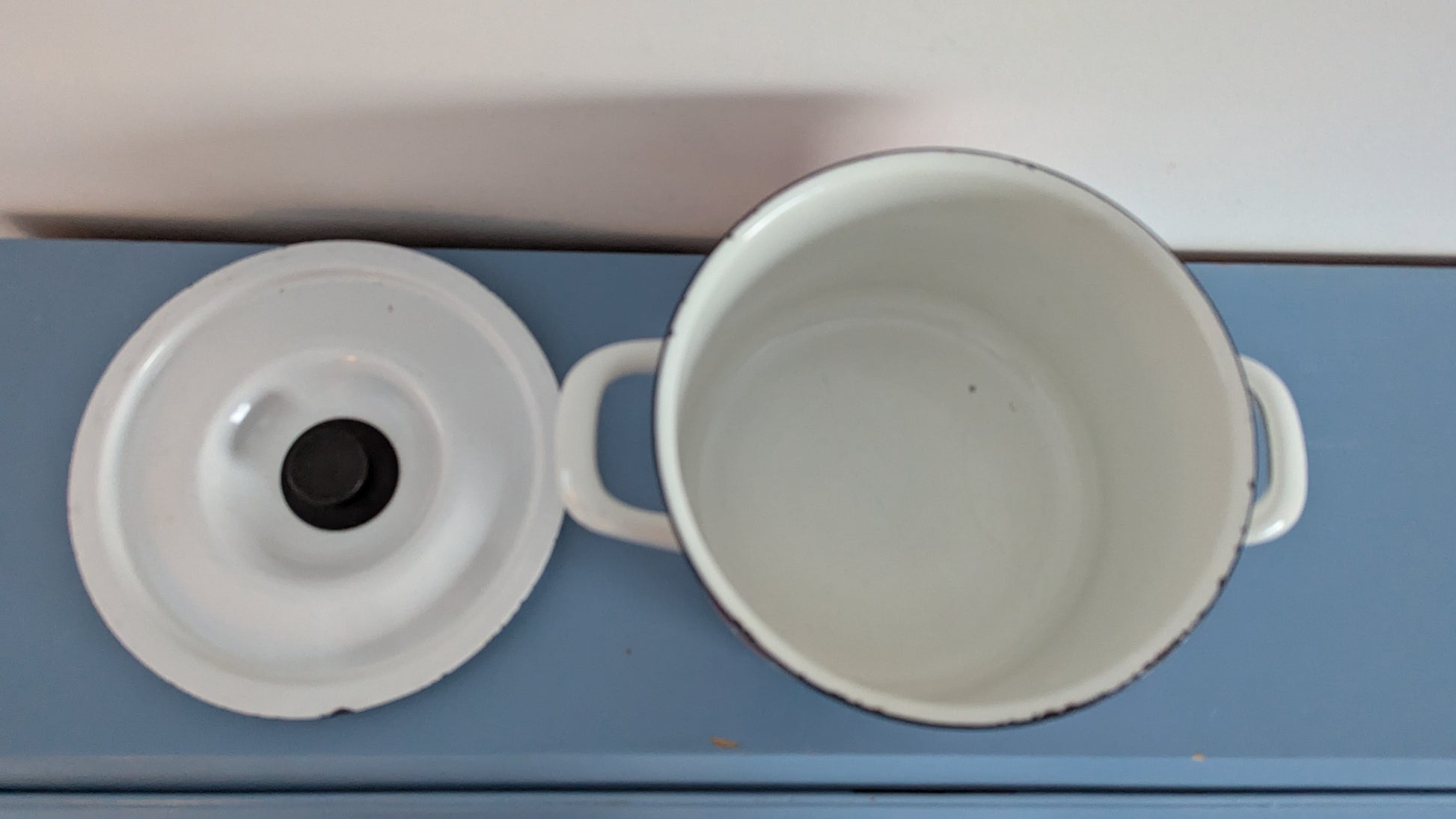 Kattilan sisäpuolella ei tummumista. Tosin pari harmaata viivaa pohjalla, jotka tulleet metallisesta kauhasta tai vastaavasta. Ulkopuolen koriste hyvässä kunnossa. Emalirikkoa vain yläosan reunoilla. Kannen sisäpuolelle yksi 1.5cm x 1cm emalirikko. Kannen sisä- ja ulkoreunoilla emalirikko. Kaikki rikot sellaisessa paikassa että ei vaikuta kokkailuun. Viat näkyy kolmessa viimeisessä kuvassa.