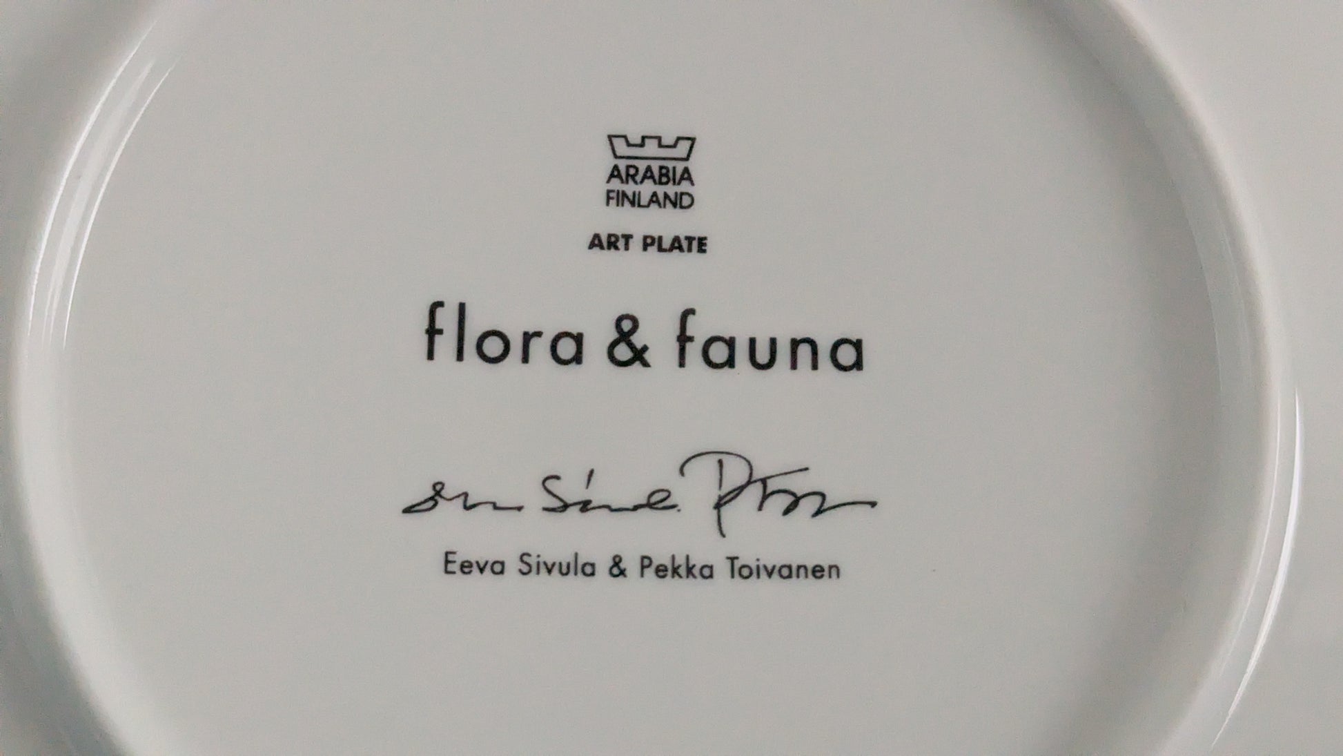 Pohjassa Eeva Sivulan ja Pekka Toivasen signeeraus sekä Flora & Fauna ja Art Plate tekstit.