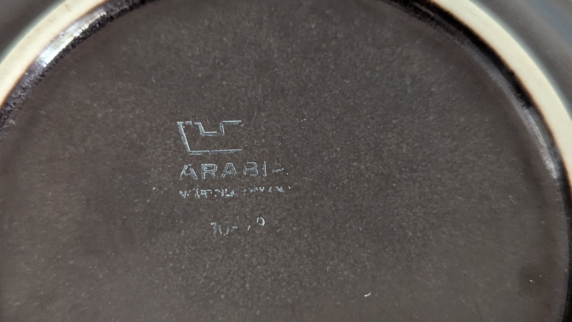 Suurimmassa osassa leima kulunut pois. Niissä joissa sitä vielä on niin se on, tai mitä siitä on enää jäljellä, näyttää olevan Arabia Wärtsilä leima eli sen perusteella nämä valmistettu 1971-1975 välillä.
