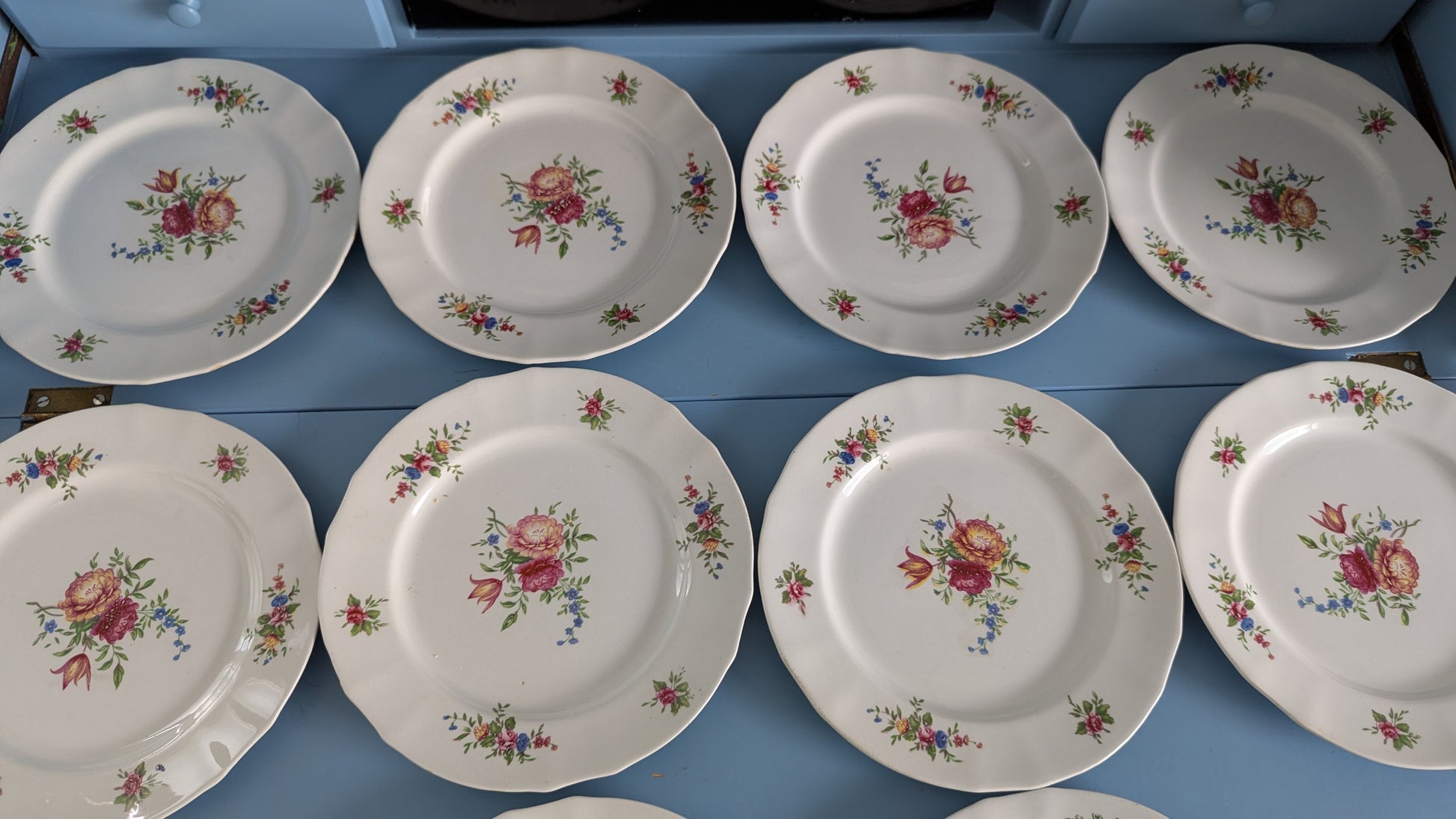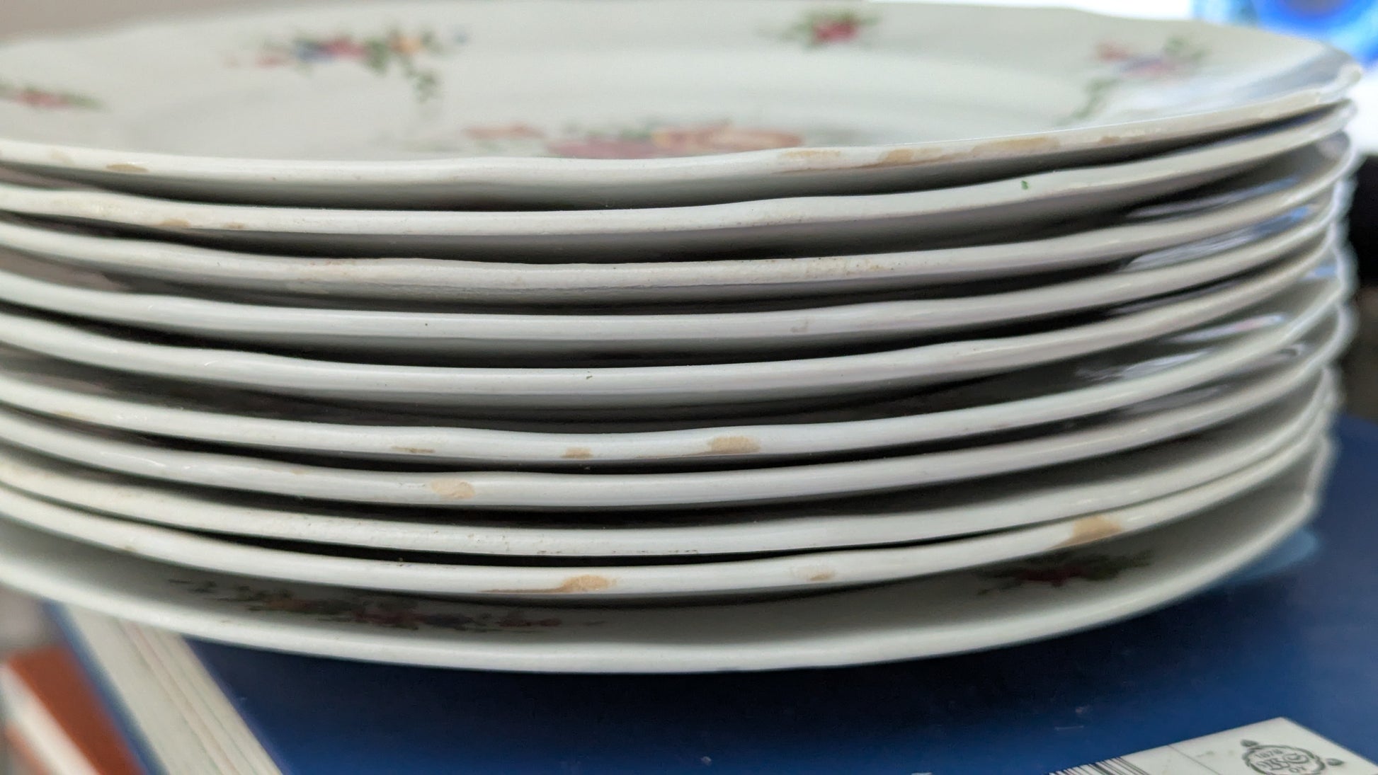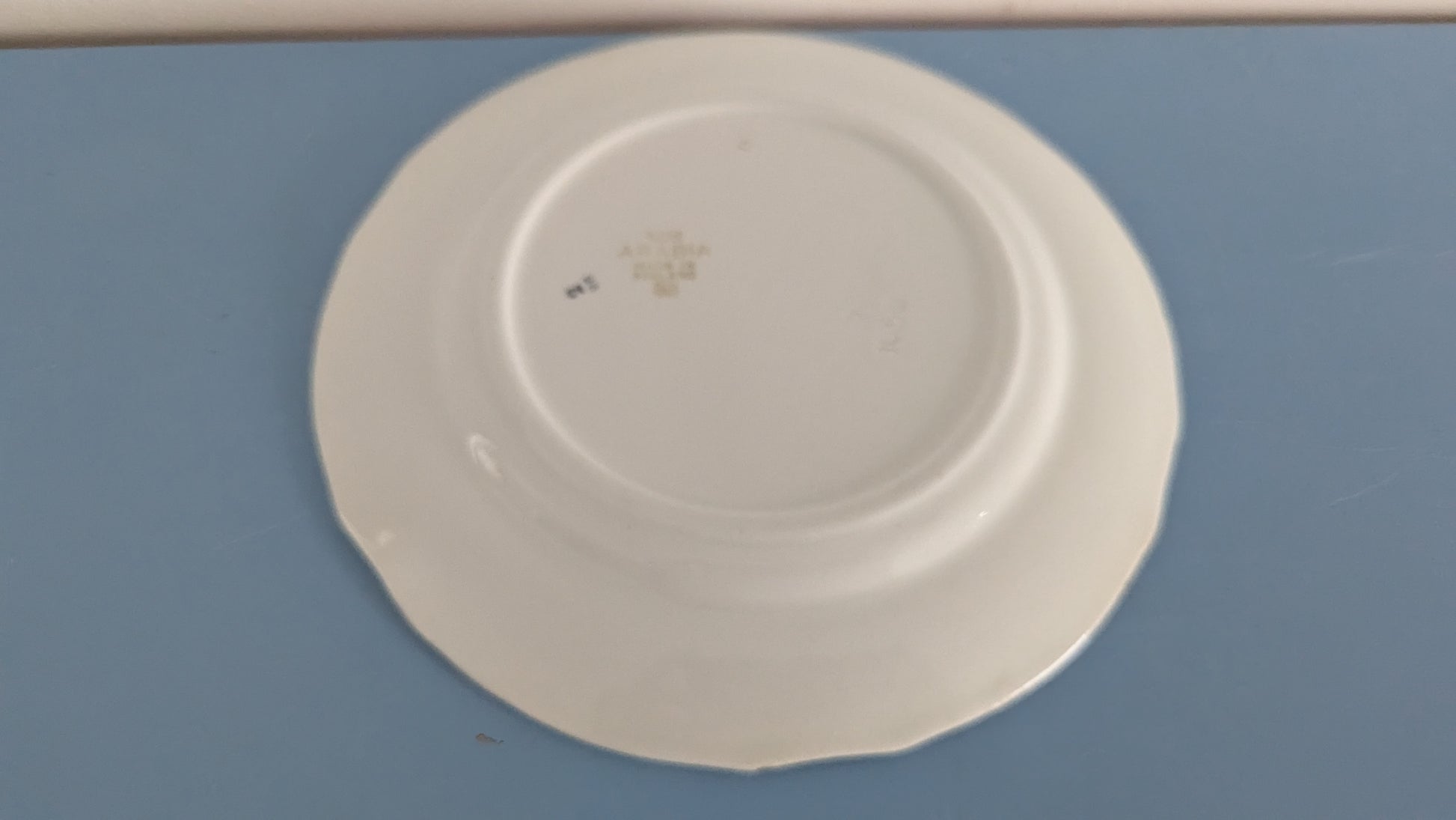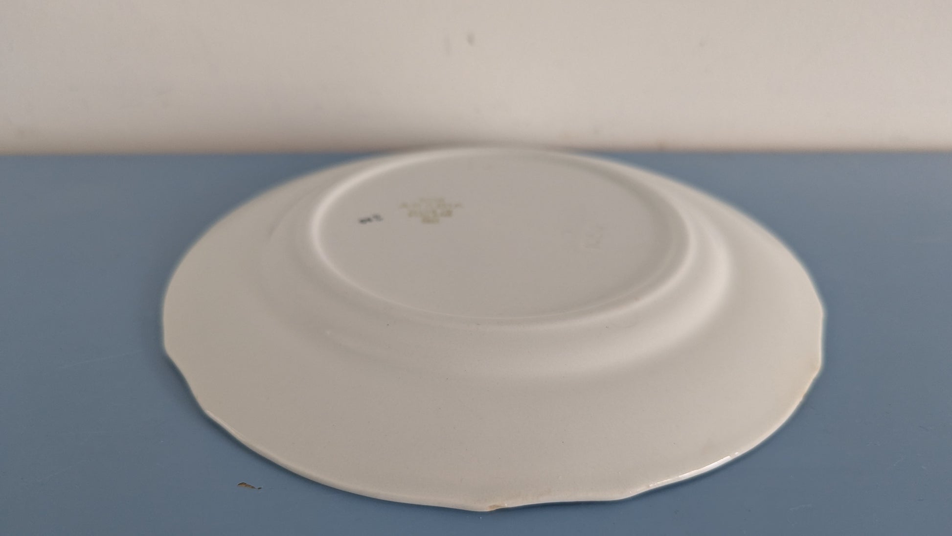 Ei halkeamia. Käyttökulumaa ei ole tai se on vähäistä. Koriste erinomaisessa kunnossa. Usean lautasen ulkoreunassa lasitevaurio tai lasite ei ole tarttunut siihen. Näkyy parhaiten kun lautaset pinoaa päällekkäin kuten viimeisessä kuvassa.