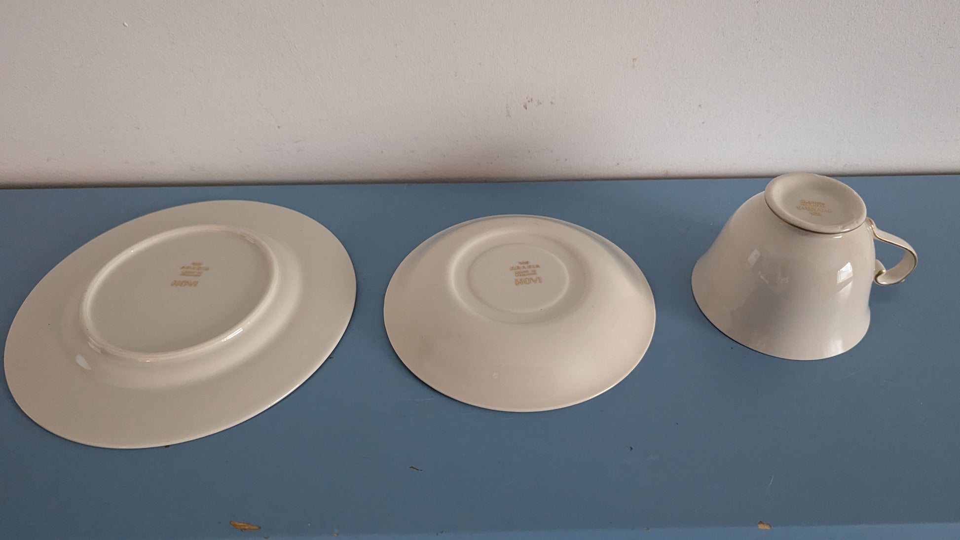 Lautasten halkaisijassa eroja. Lautasista viisi on halkaisijaltaan 17.5cm ja neljä 16.4cm eli 1.1cm pienempiä. Ero näkyy ehkä parhaiten viimeisessä kuvassa.