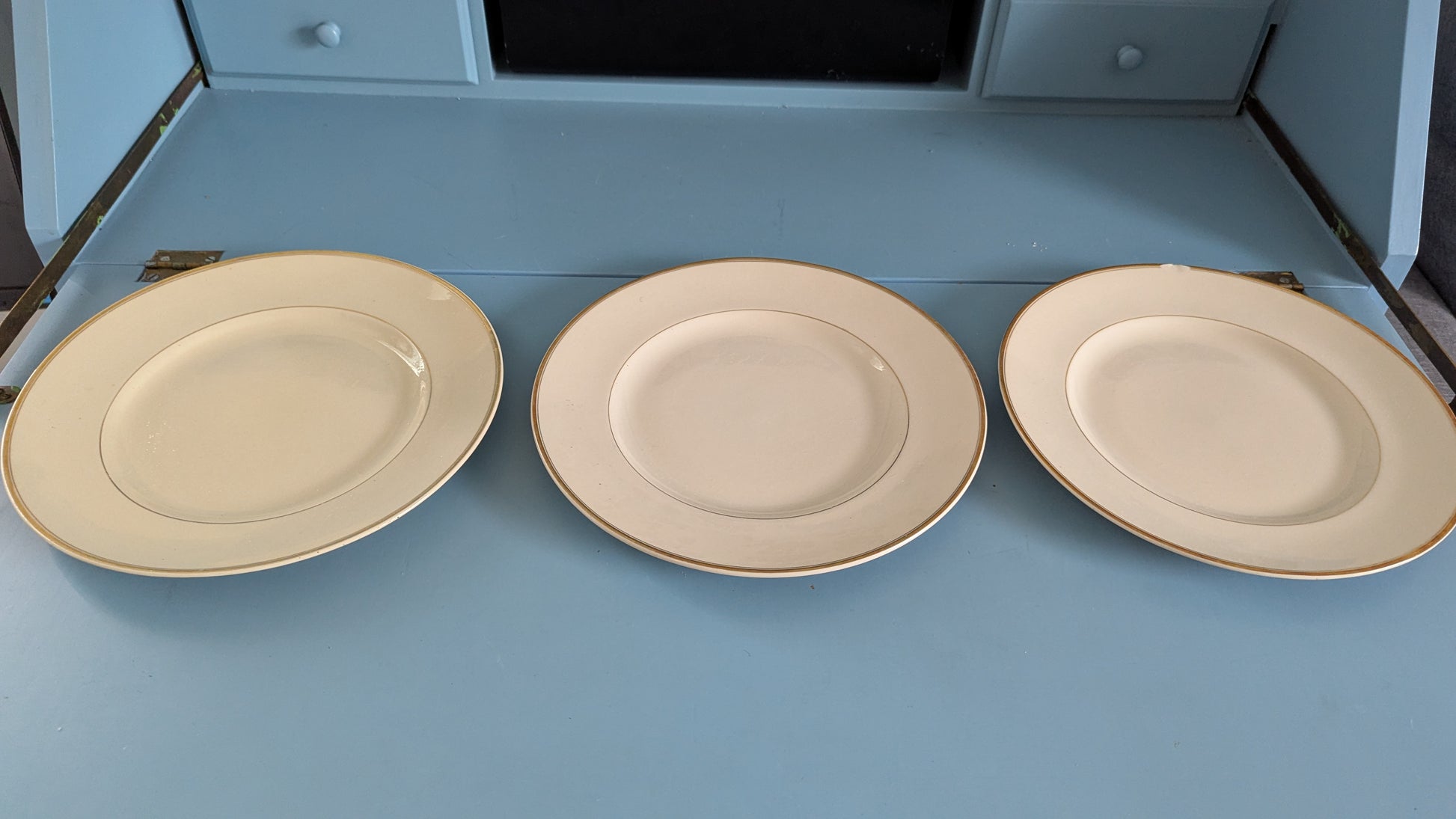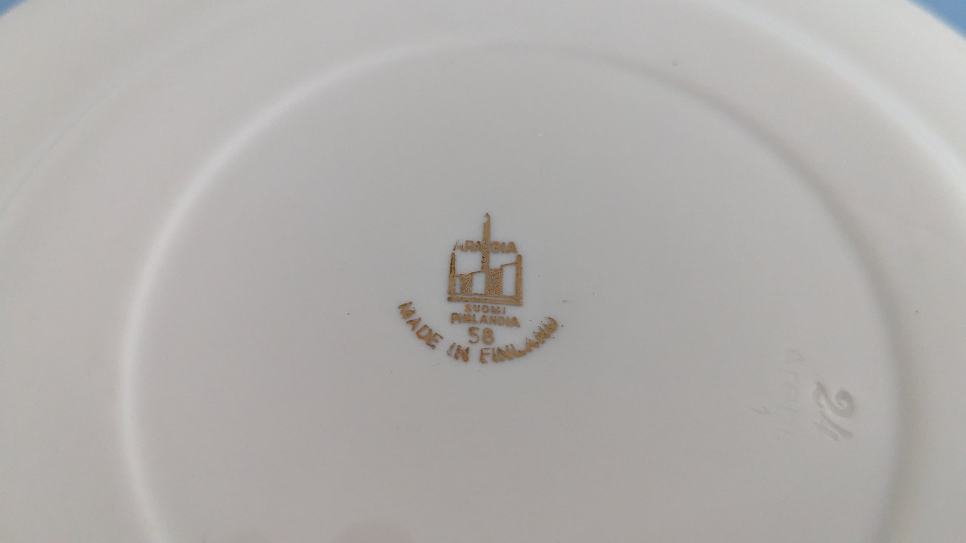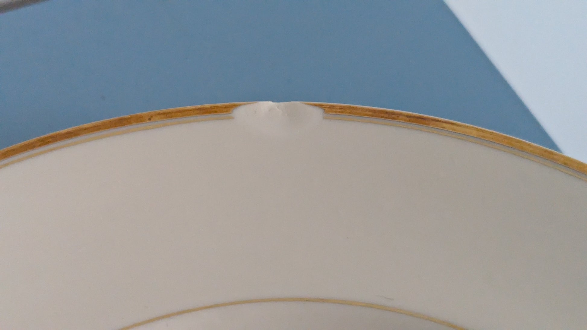 Ei halkeamia. Yhdessä lautasessa viimeisen kuvan mukainen iskemä. Kahdessa muussa ei iskemiä. Kahdessa lautasessa minimaalista käyttökulumaa. Yhdessä vähäistä käyttökulumaa. Kultaukset kaikissa hyvässä kunnossa.