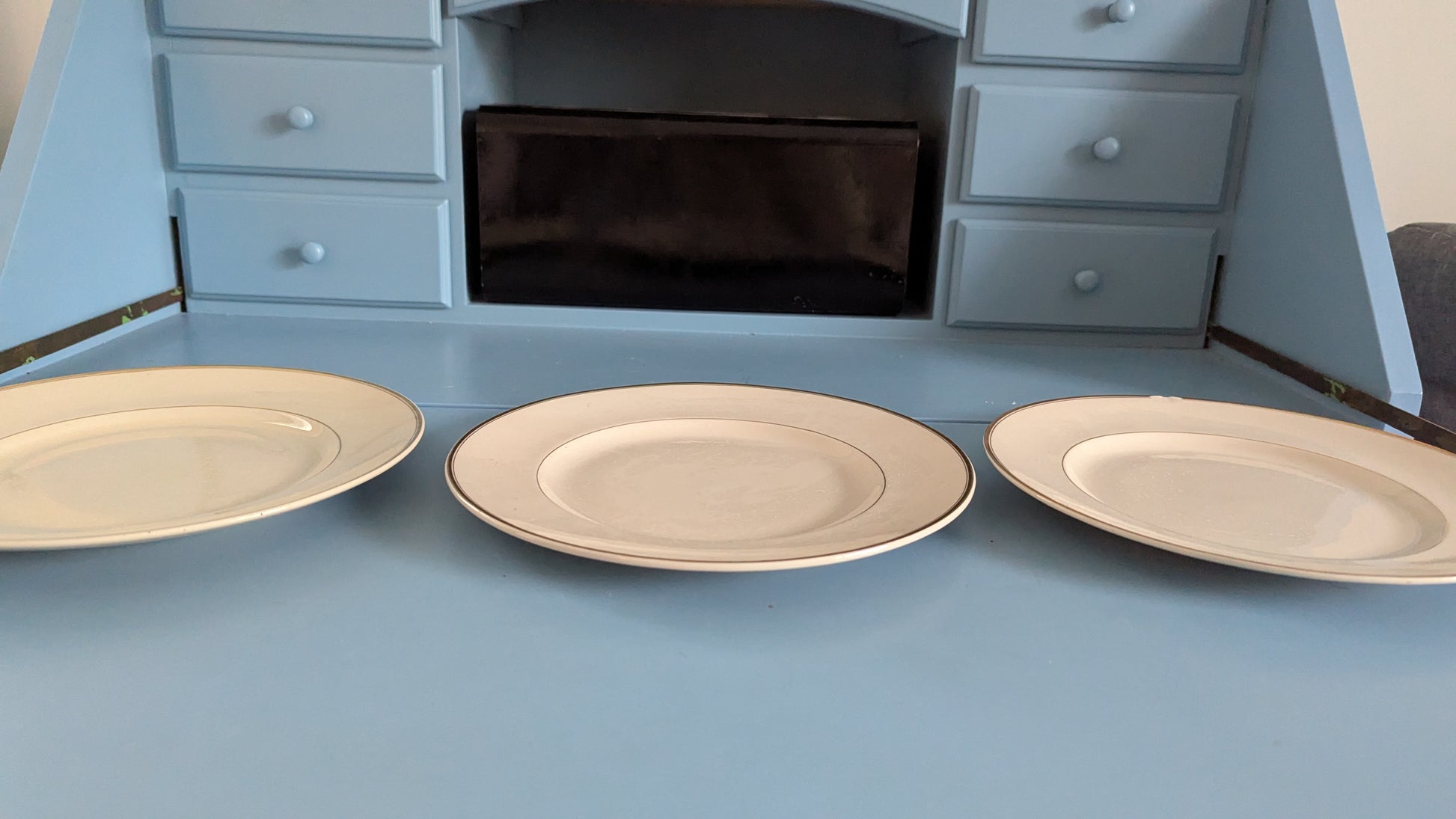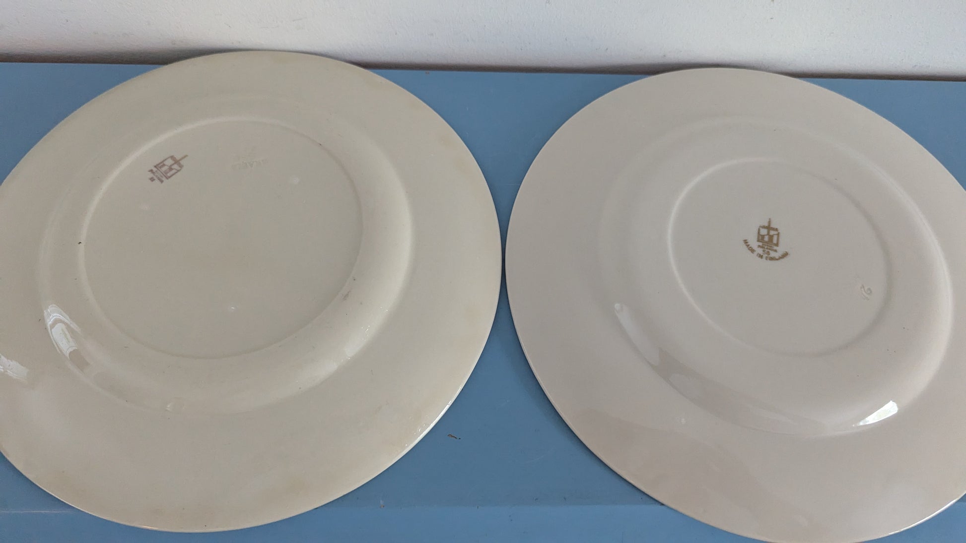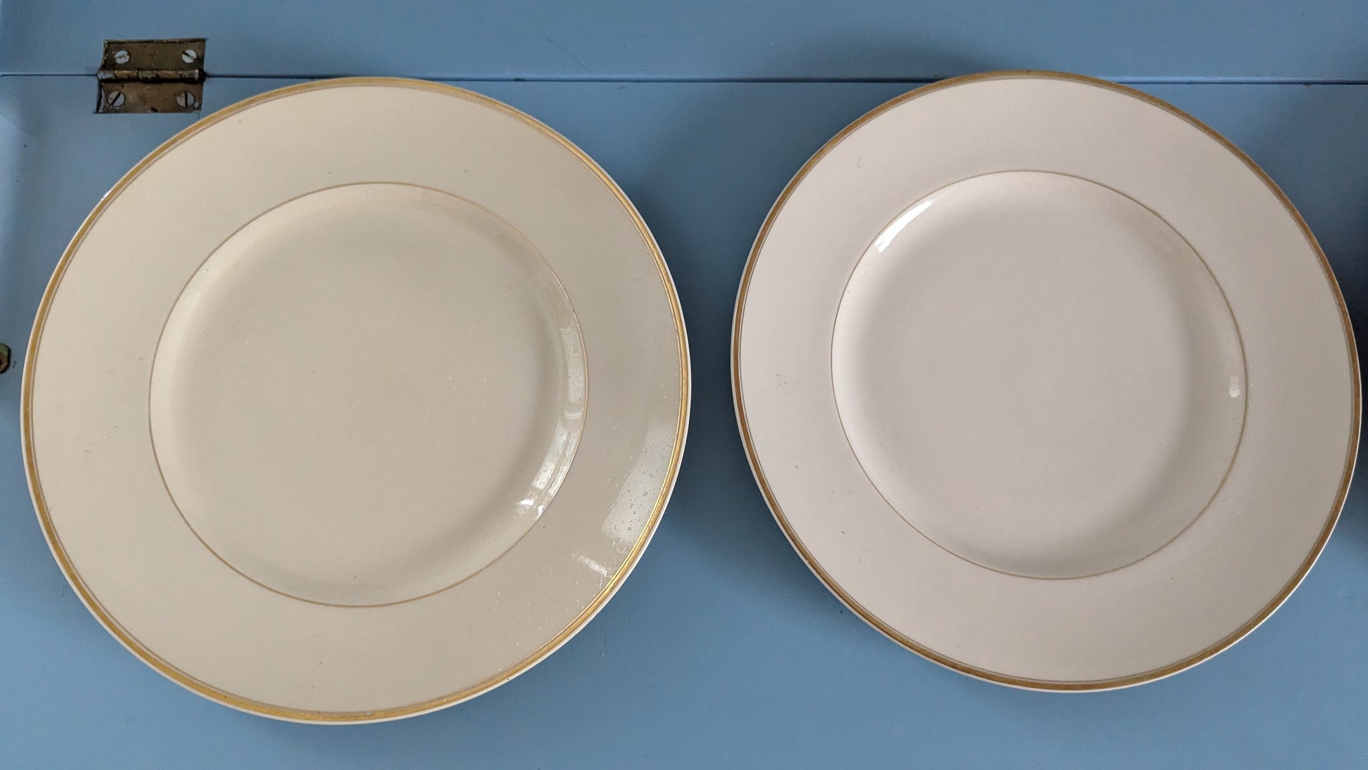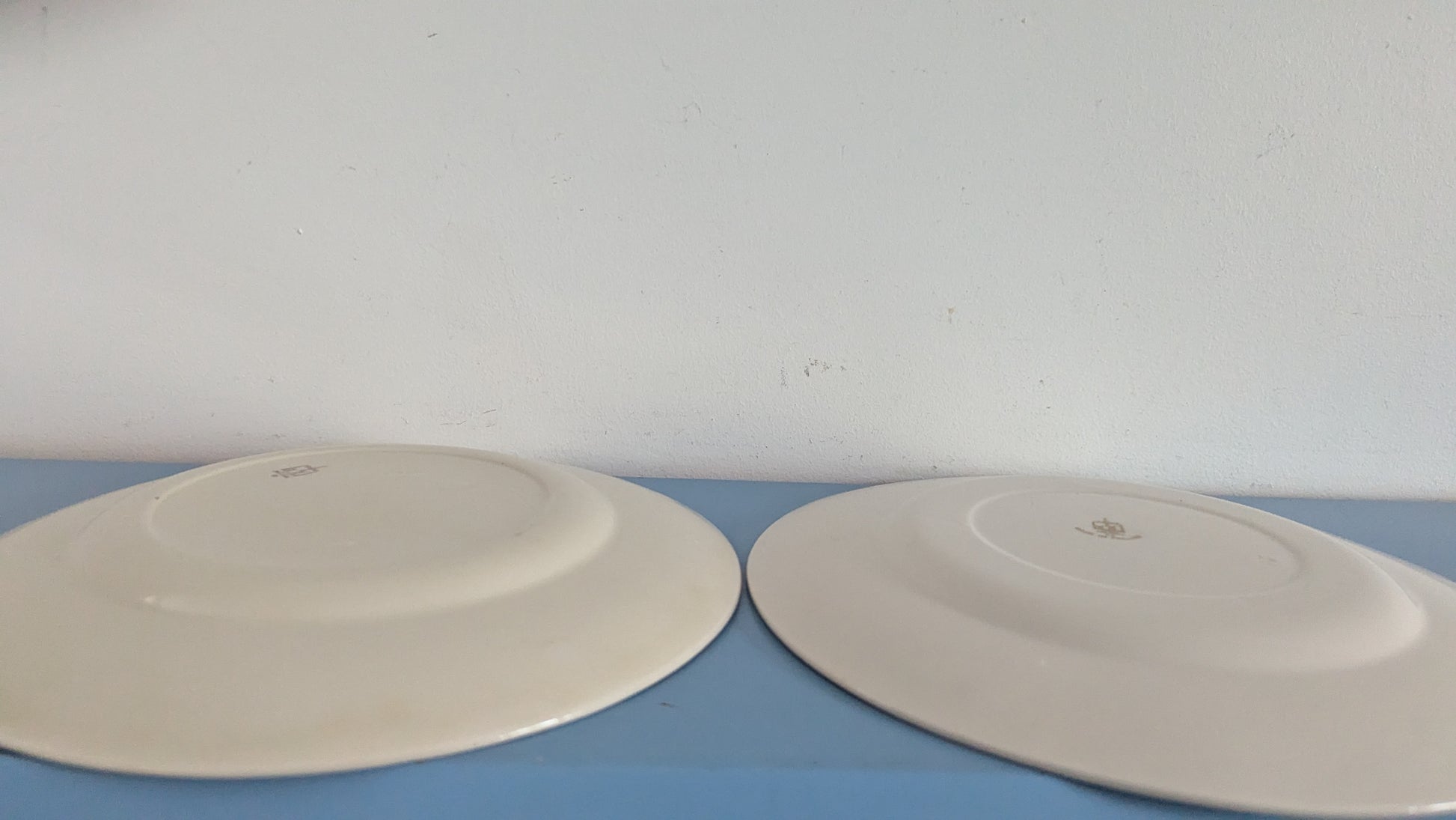 Ei halkeamia. Yhdessä lautasessa viimeisen kuvan mukainen iskemä. Kahdessa muussa ei iskemiä. Kahdessa lautasessa minimaalista käyttökulumaa. Yhdessä vähäistä käyttökulumaa. Kultaukset kaikissa hyvässä kunnossa.