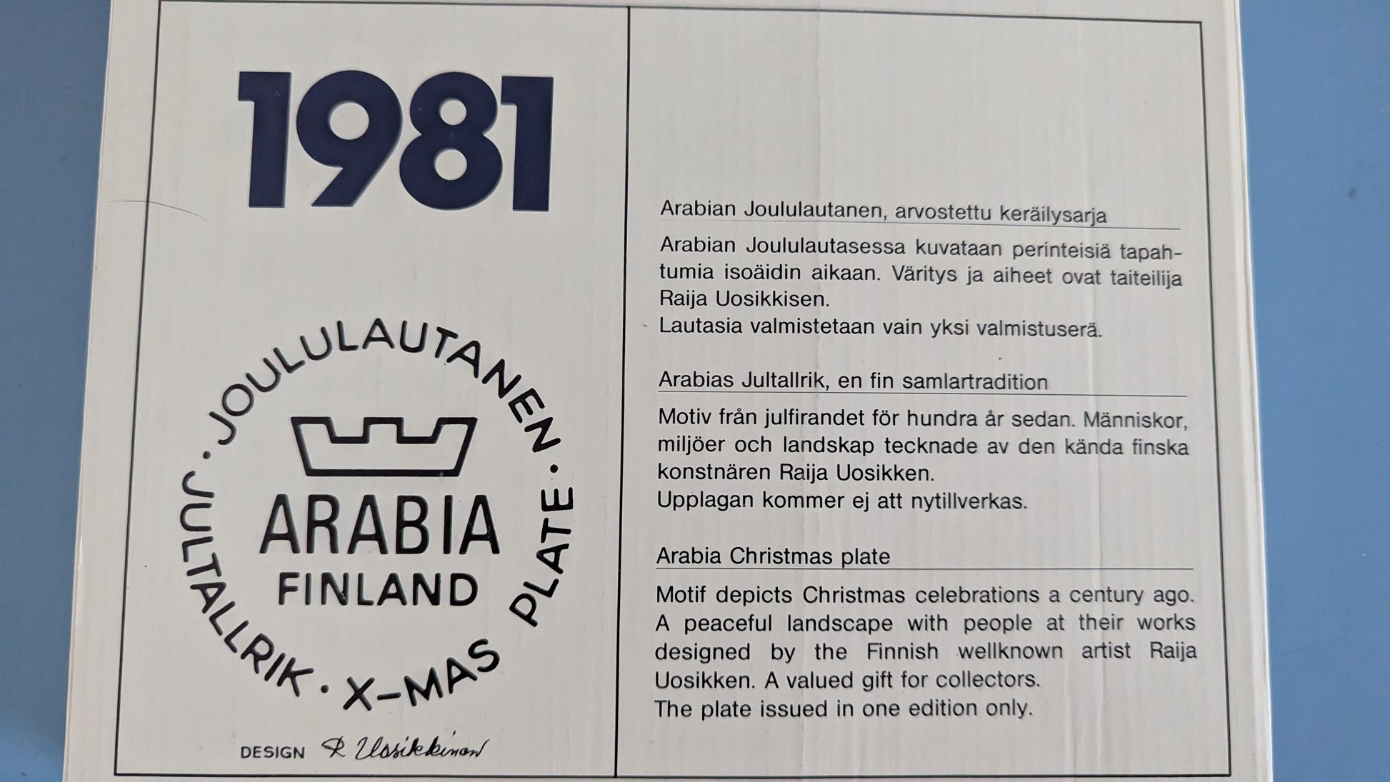 Arabia Joululautanen 1981 (Alkuperäisessä Paketissa, Raija Uosikkinen)