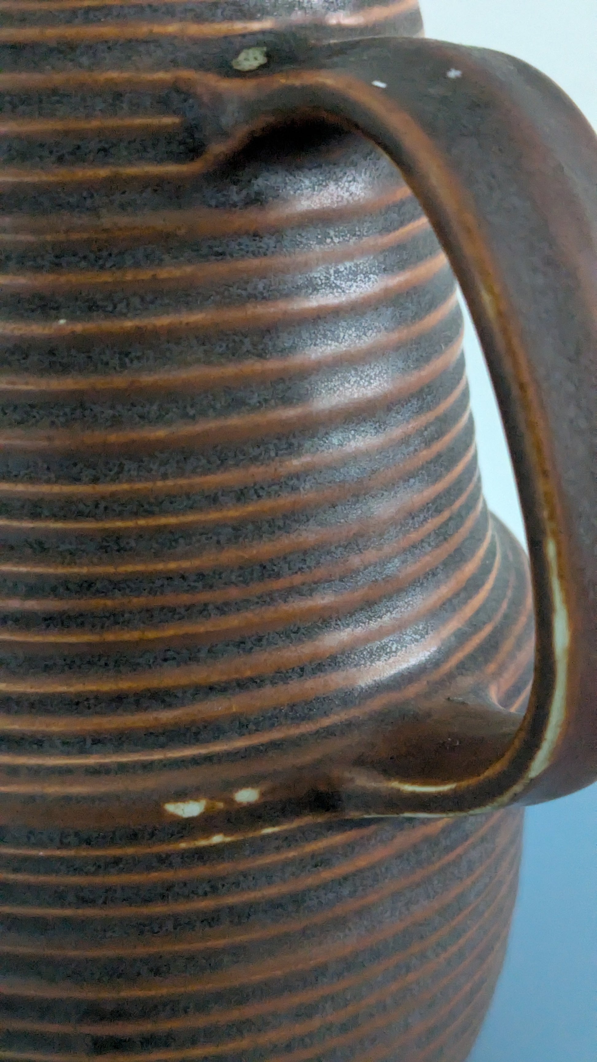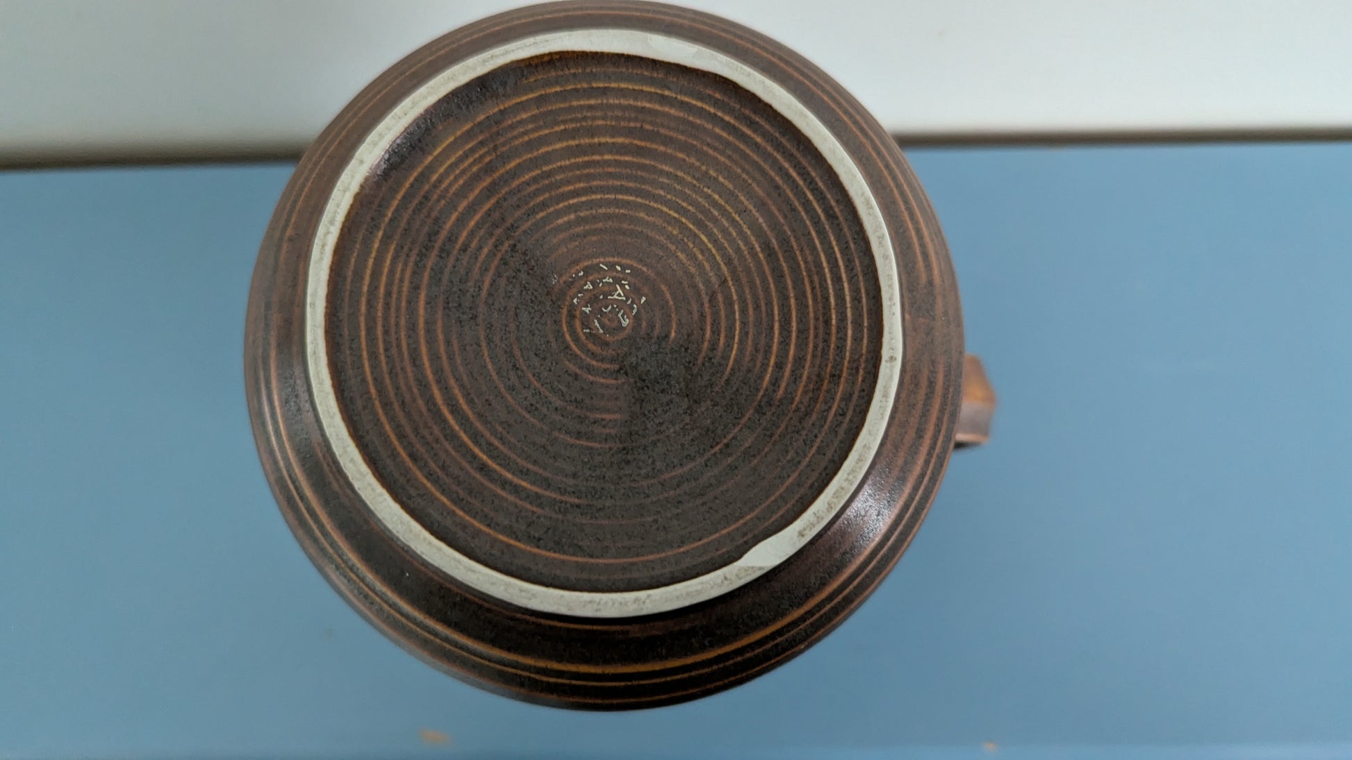 Ei halkeamia. Kahvan ylä- ja alaosassa pari kohtaa mihin ei ole tarttunut väri. Pohjaympyrässä 8mm iskemä. Viat näkyvät kahdessa viimeisessä kuvassa.