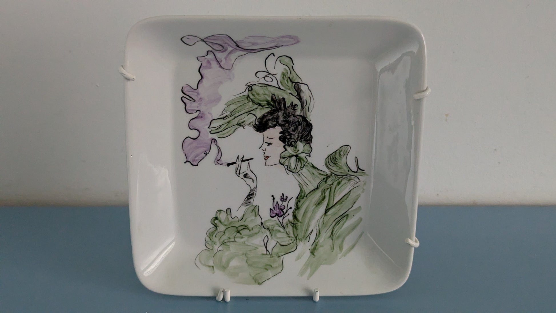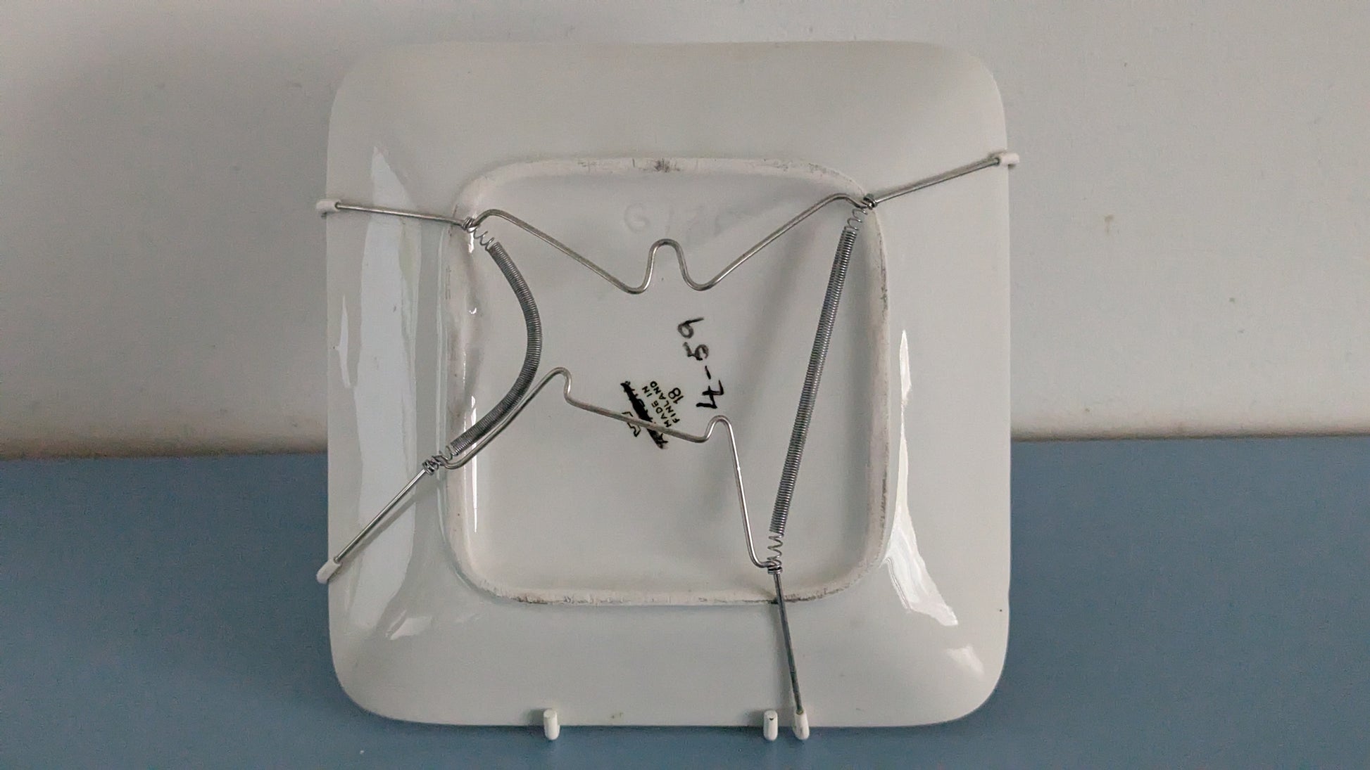 Kyseessä Arabian G mallin valkoinen tarjoilukulho, jonka päälle joku maalannut koristeen vuonna 1959. Takana signeeraus LL -59