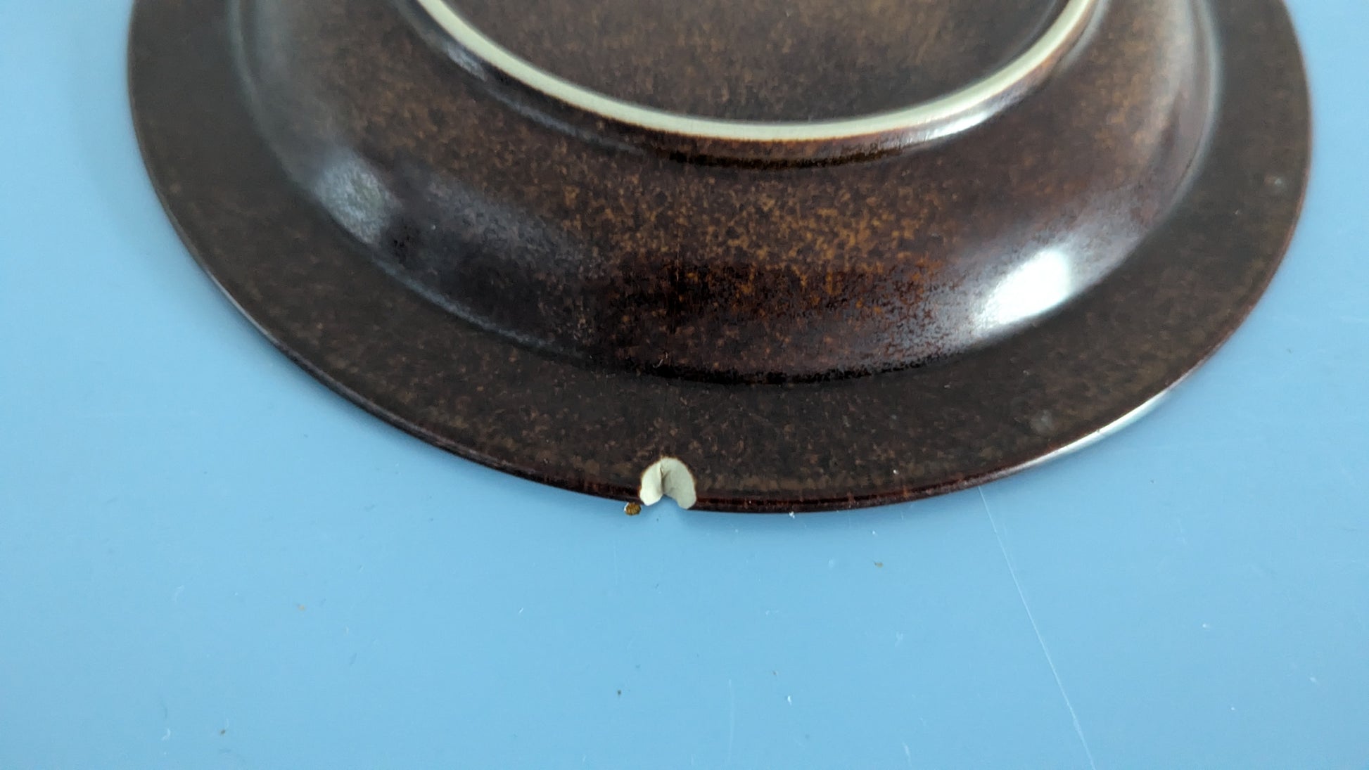 Ei halkeamia. Yhdessä lautasessa viimeisen kuvan mukainen 6mm iskemä. Muissa ei iskemiä. Käyttökulumaa ei ole tai se on minimaalista.