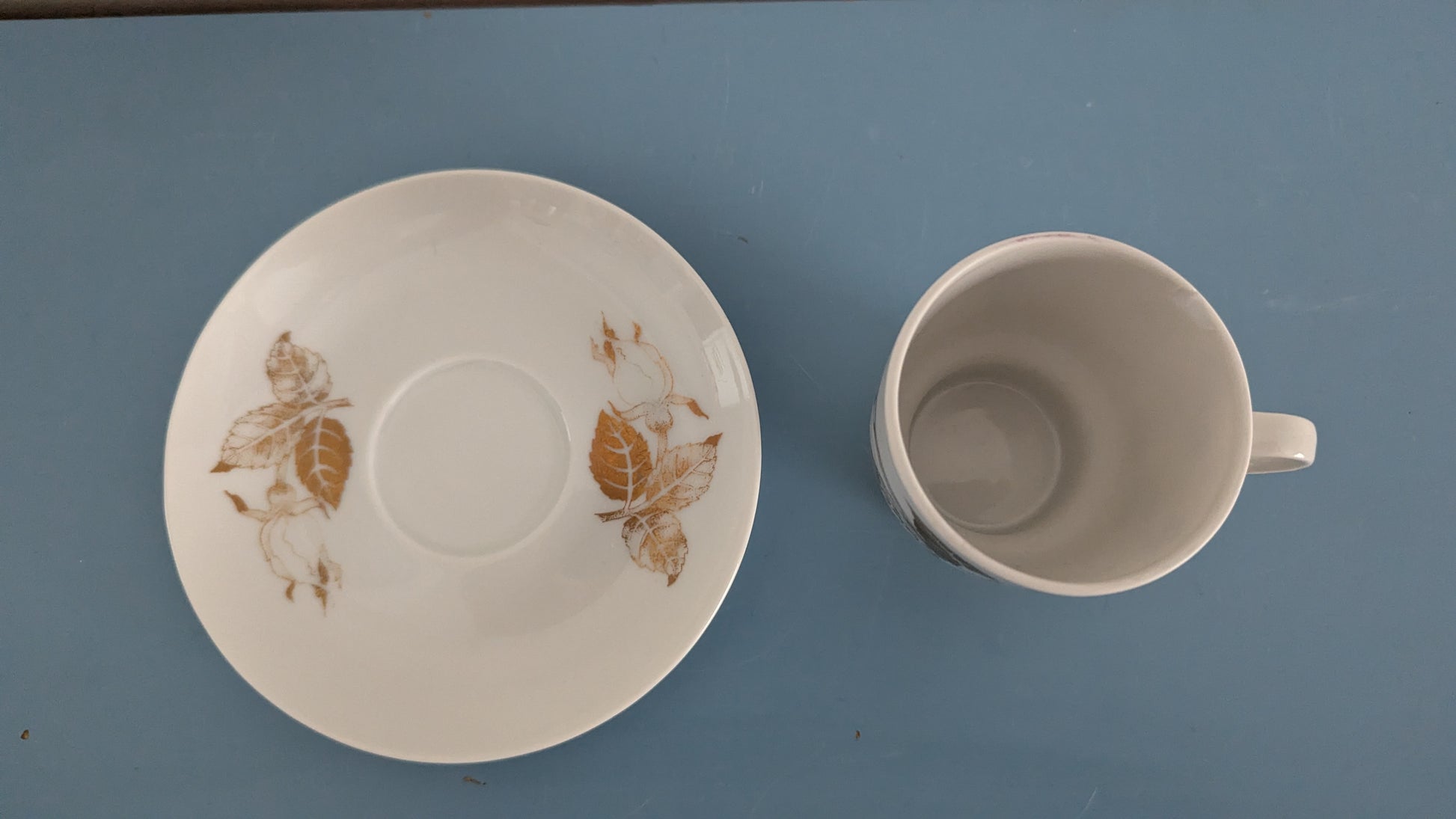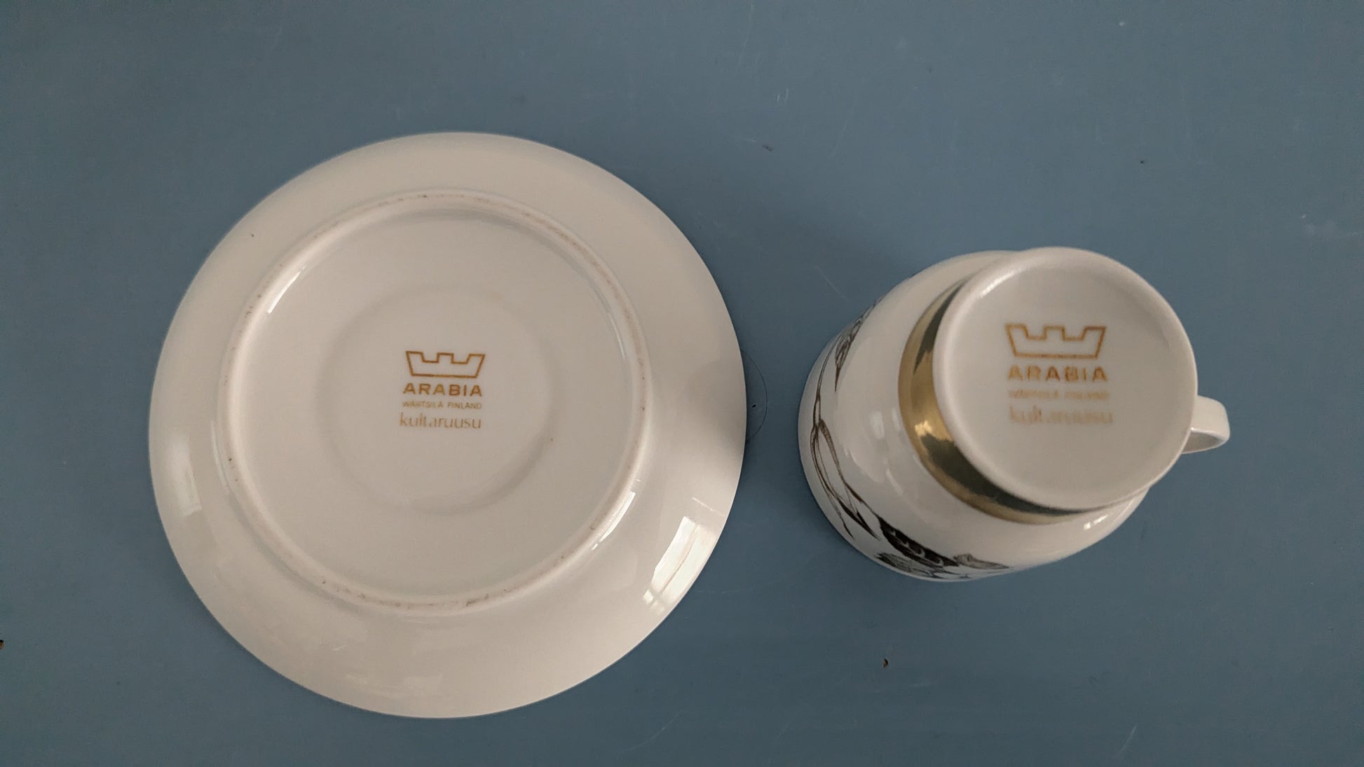 Ei halkeamia. Yhdessä kupissa viimeisen kuvan mukainen 5mm iskemä. Muissa ei iskemiä. Kultakoriste parissa lautasessa hieman kulunut mutta muissa pysynyt hyvänä. Muuten ei käyttökulumaa tai se on minimaalista.