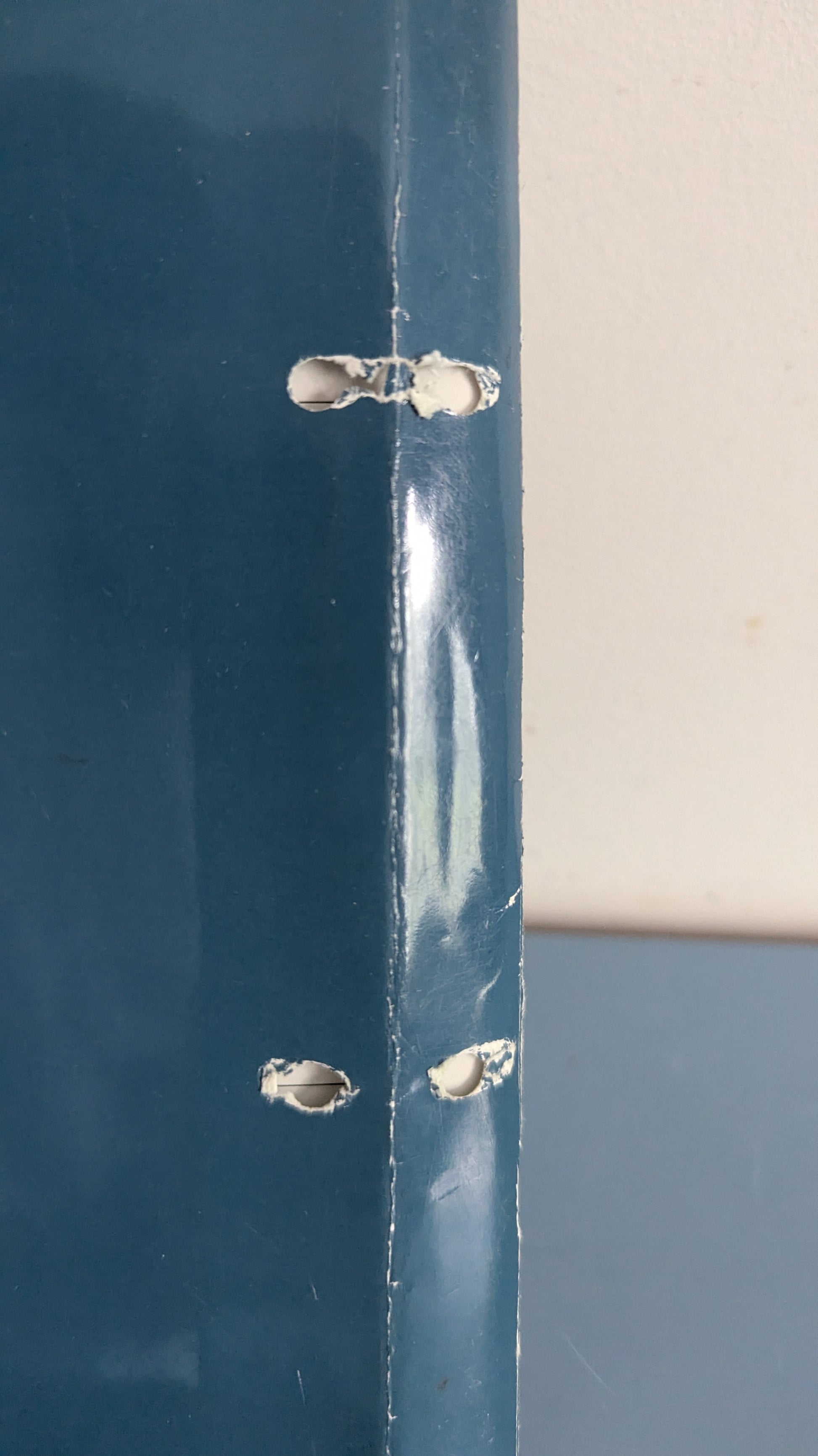 Takakannen vasemmassa ylänurkassa taitos. Lisäksi oikea puoli taitettu ja tehty reiät kansiota varten.