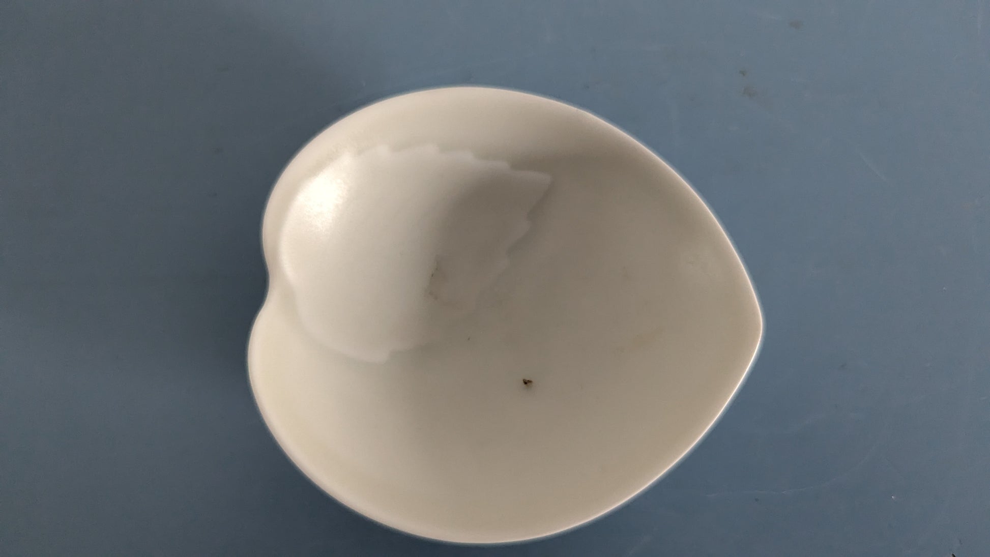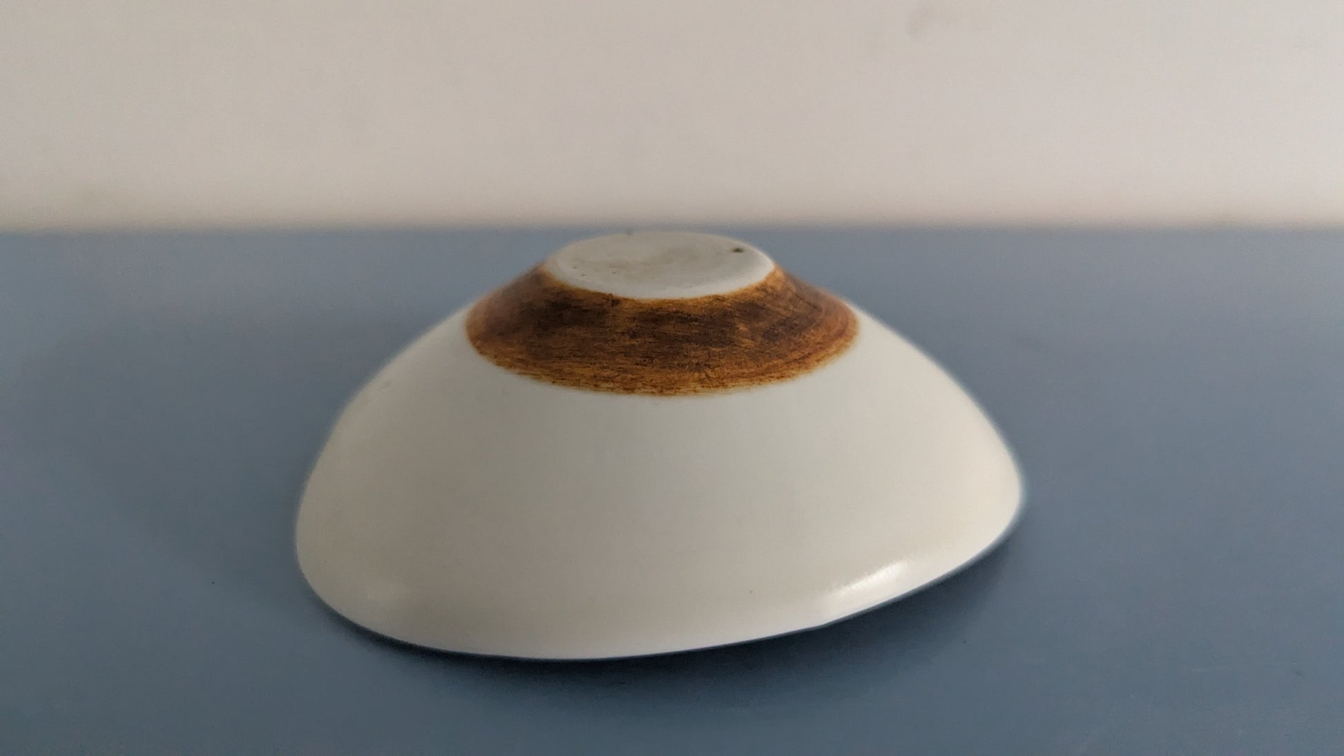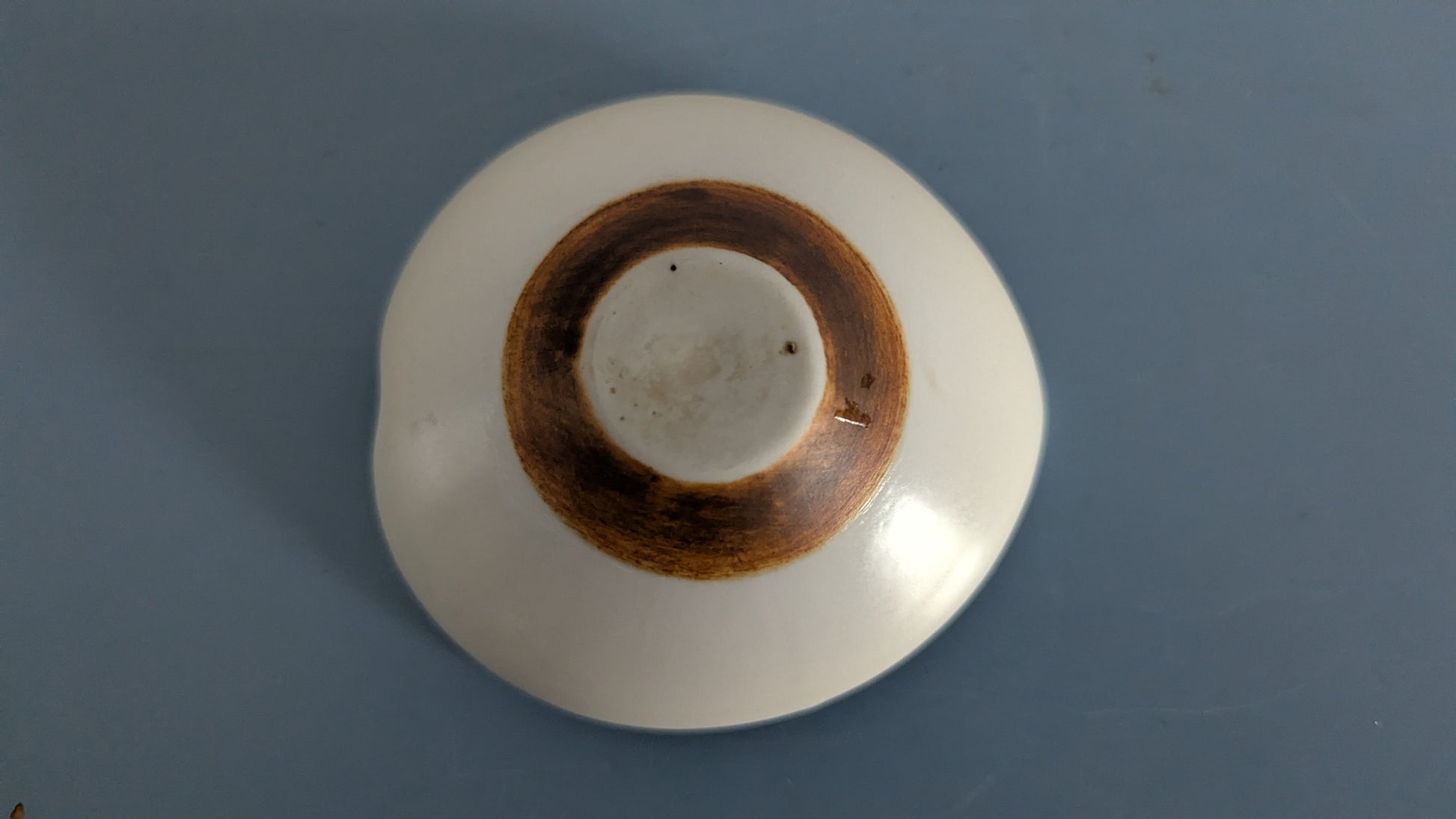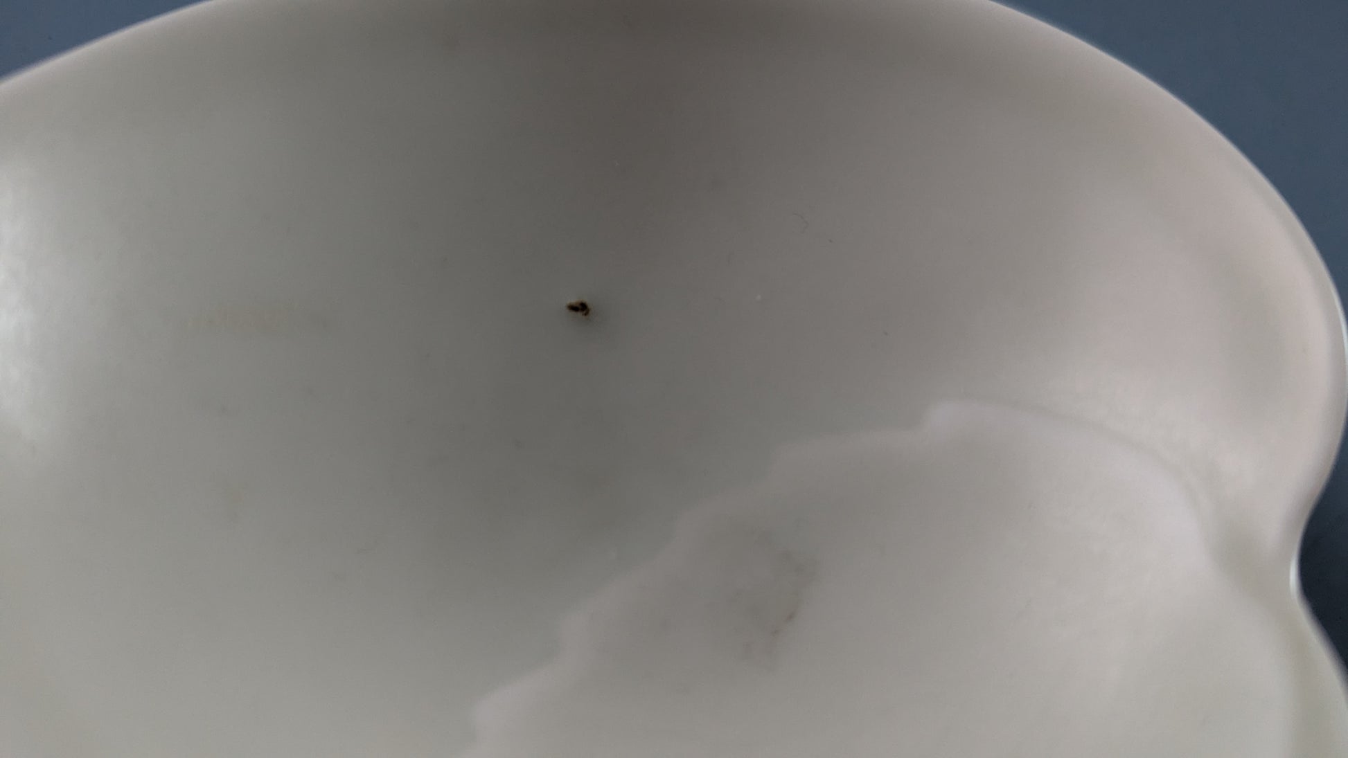Ei iskemiä, halkeamia tai naarmuja. Pohjalla pieni ruskea piste. Siinä kohtaa ollut "finni" joka puhjennut eli pieni nyppylä jonka päältä lähtenyt lasite. Pohjassa ei leimaa tai se on kulunut pois.
