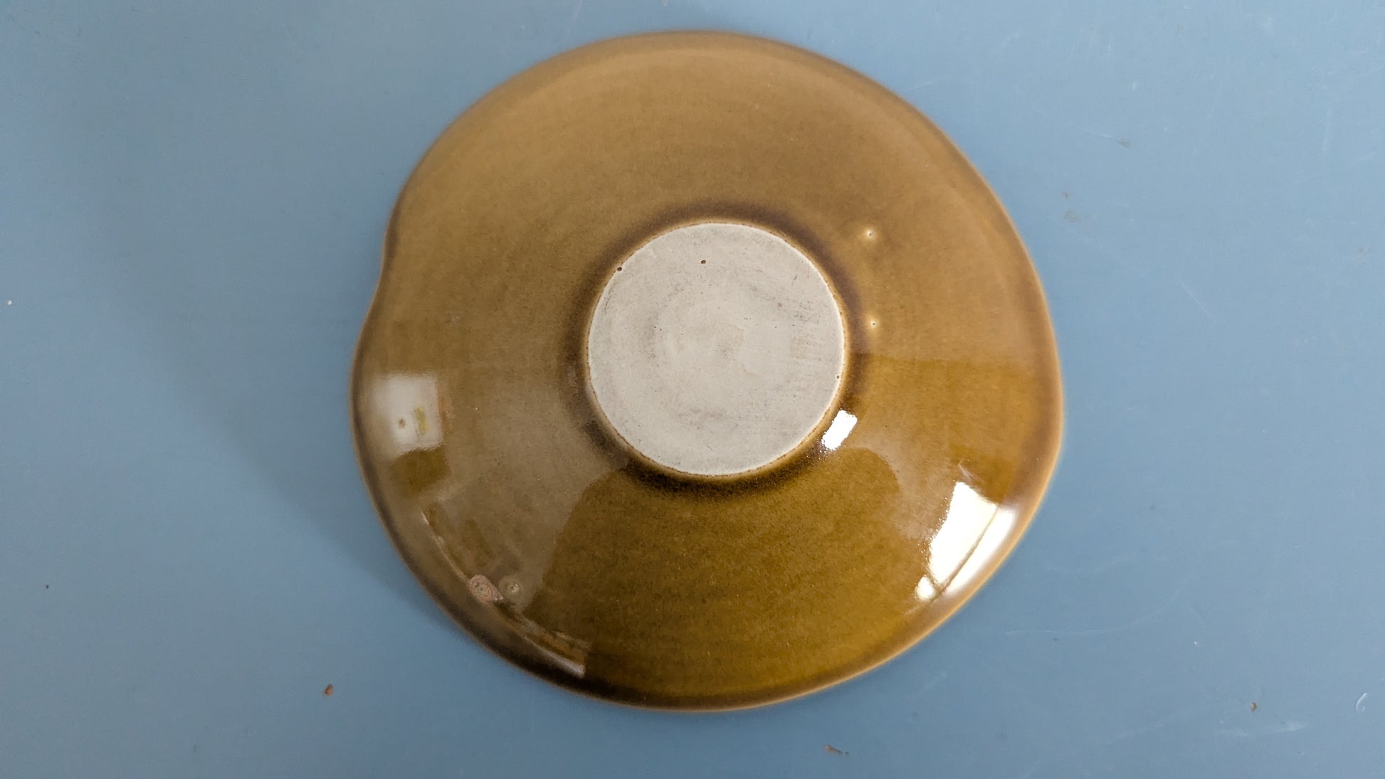 Ei iskemiä tai halkeamia.. Pohjapuolella viisi viimeisen kuvan mukaista pistettä, joihin ei ole tarttunut väri mutta lasitus kylläkin. Yläpuolella yksi samanlainen. Pohjassa ei leimaa tai se on kulunut pois. Pohjalla yksi naarmu joka näkyy valoa vasten peilatessa.