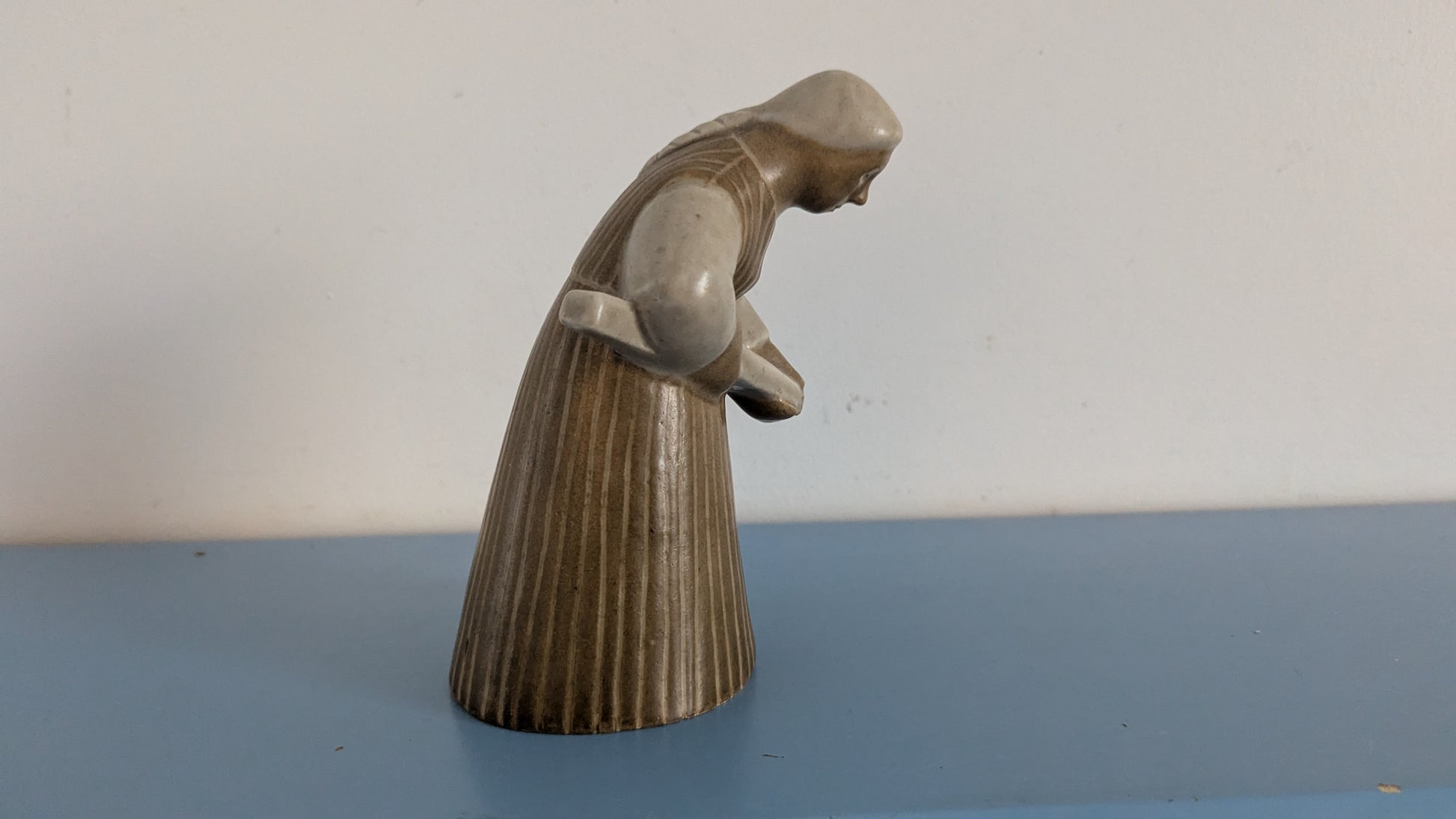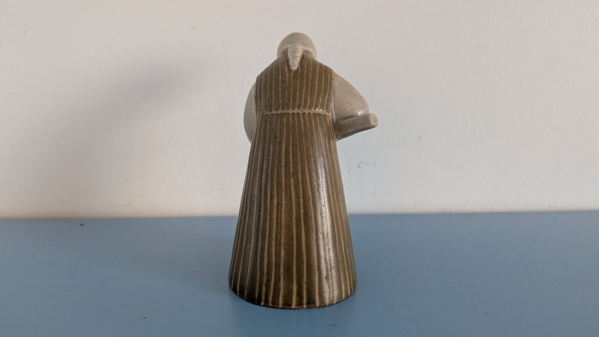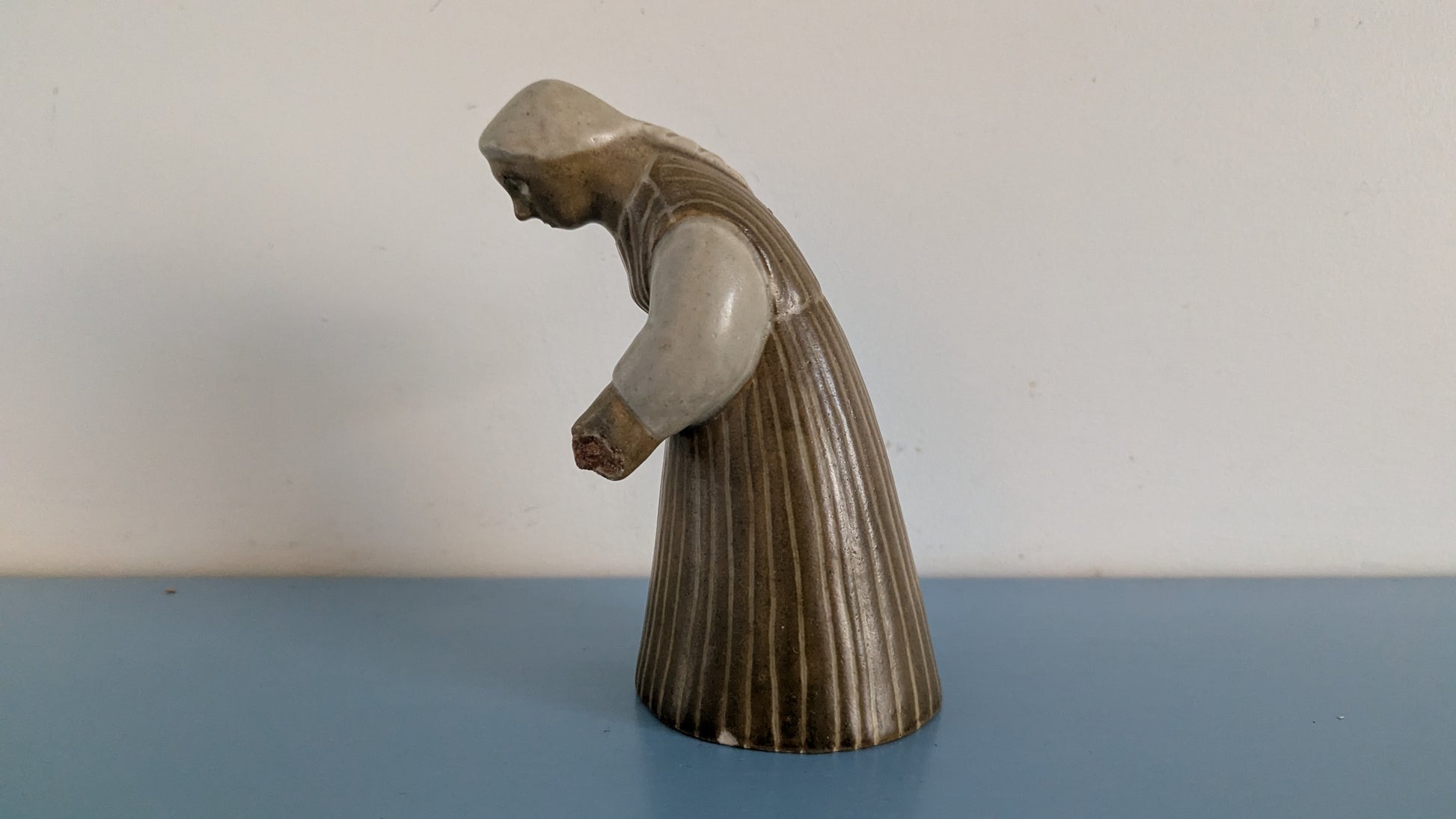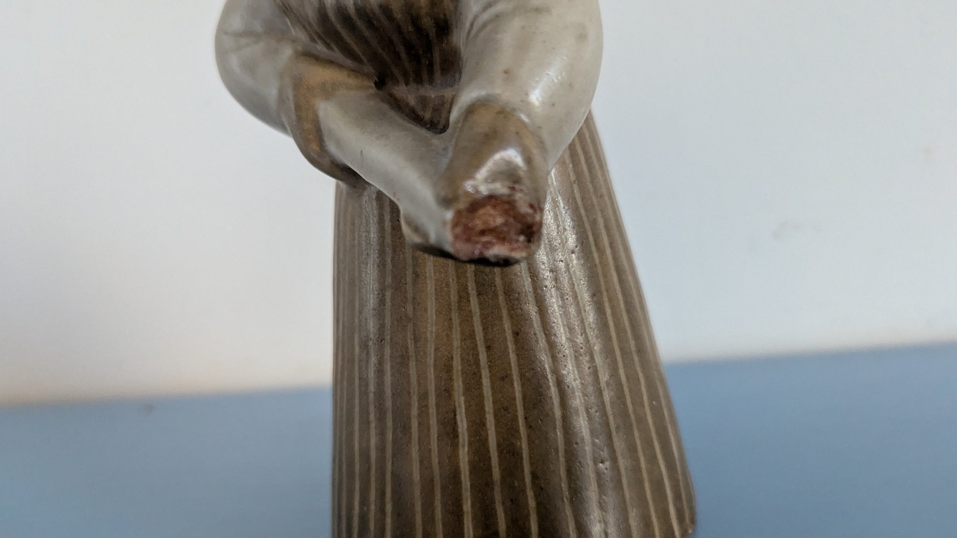 Ei halkeamia. Helmassa 3mm iskemä. Kädessä oleva leipälapio mennyt poikki. Loppuosa hukassa. Viat näkyy kahdessa viimeisessä kuvassa.