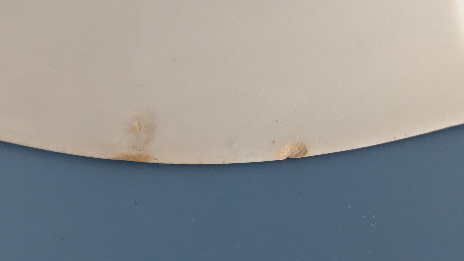 Ei halkeamia. Vähäistä käyttökulumaa. Ylhäällä ulkoreunalla 5mm kokoinen iskemä, mikä näkyy viimeisessä kuvassa.