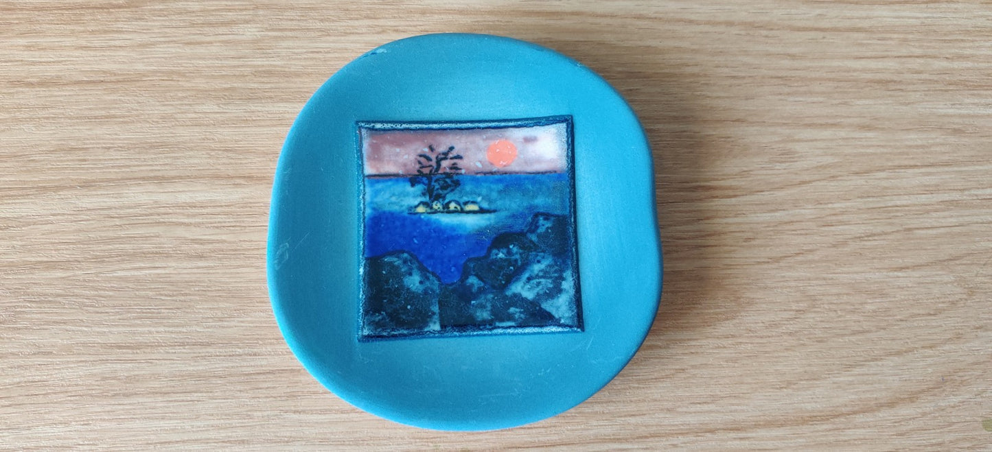 Heljä Liukko-Sundström on suunnitellut useita eri kuva-aiheita epäsymmetrisen muotoiseen sinertävään seinälautaseen. Maisemat -lautassarjaan kuuluu neljä lautasta: Metsä, Viljapelto, Merimaisema ja Ruska.