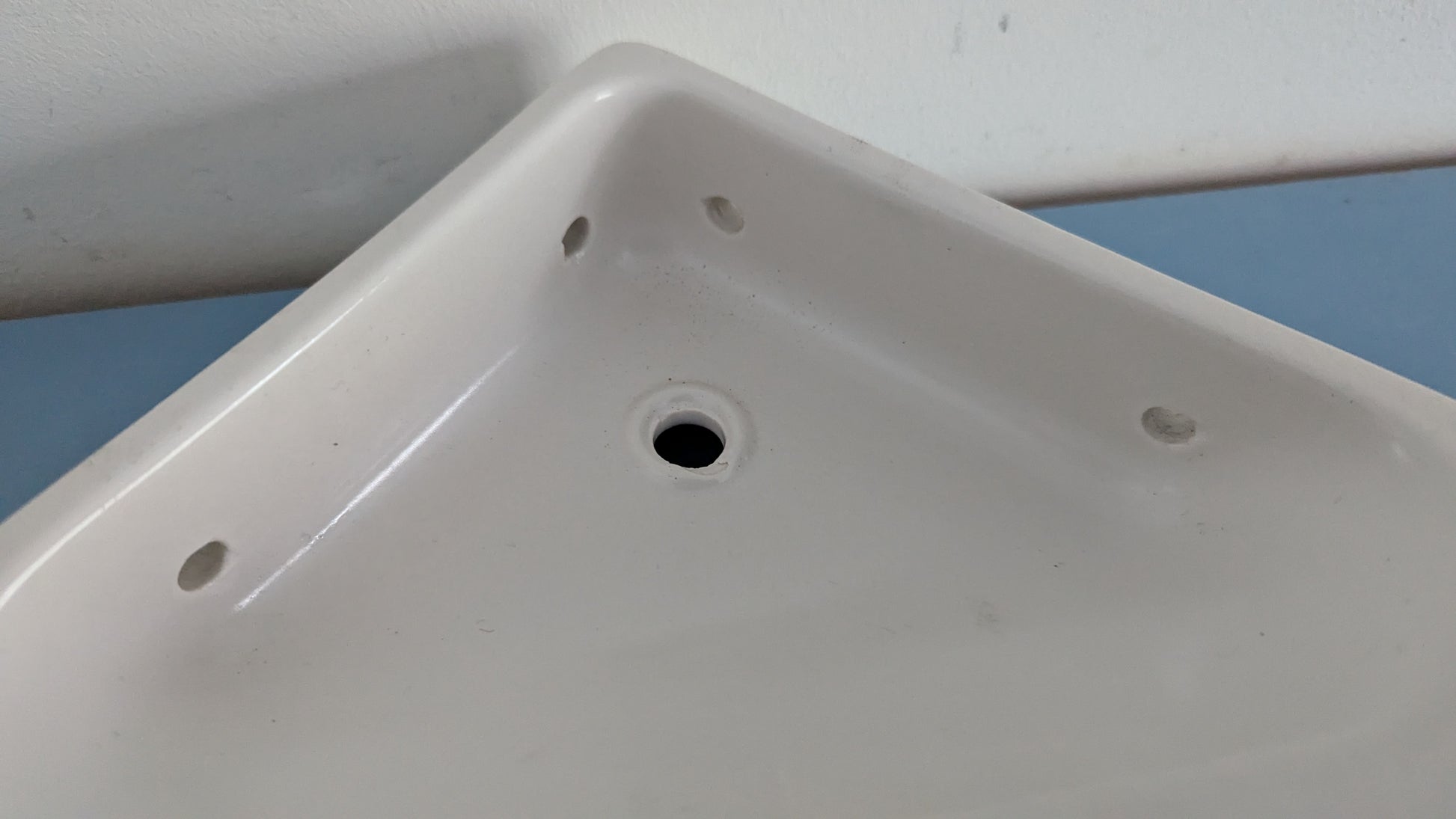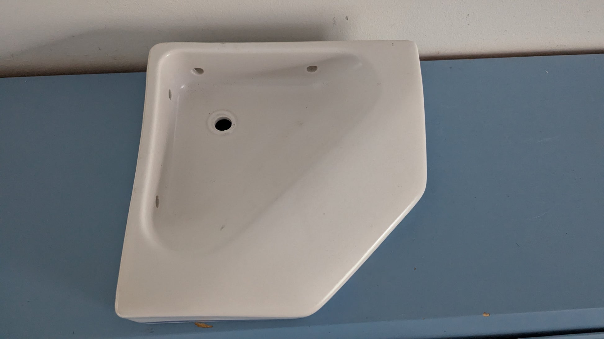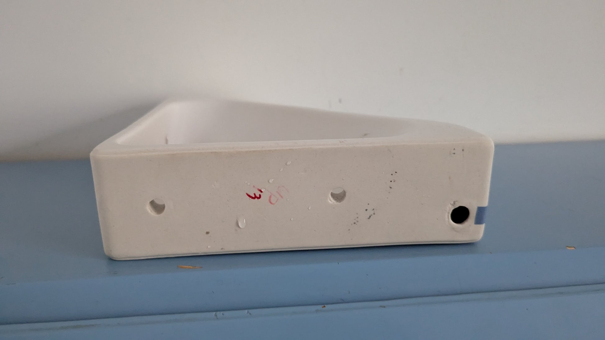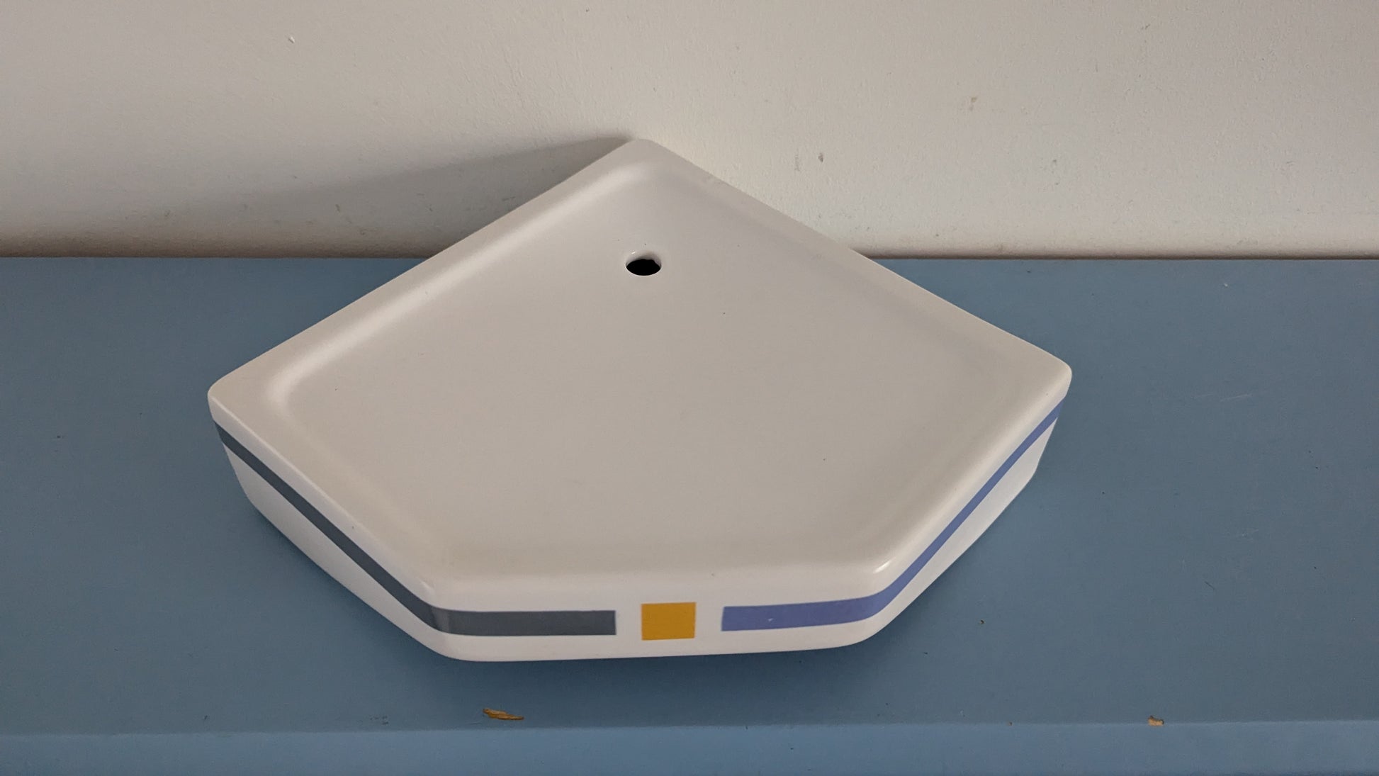 Kulmahylly / Nurkkahylly WC, Suihku tai muihin märkätiloihin. Hyllyssä syvennys saippualle tai shamppoopulloille. Syvennyksen keskellä reikä josta vesi pääsee valumaan poissa.