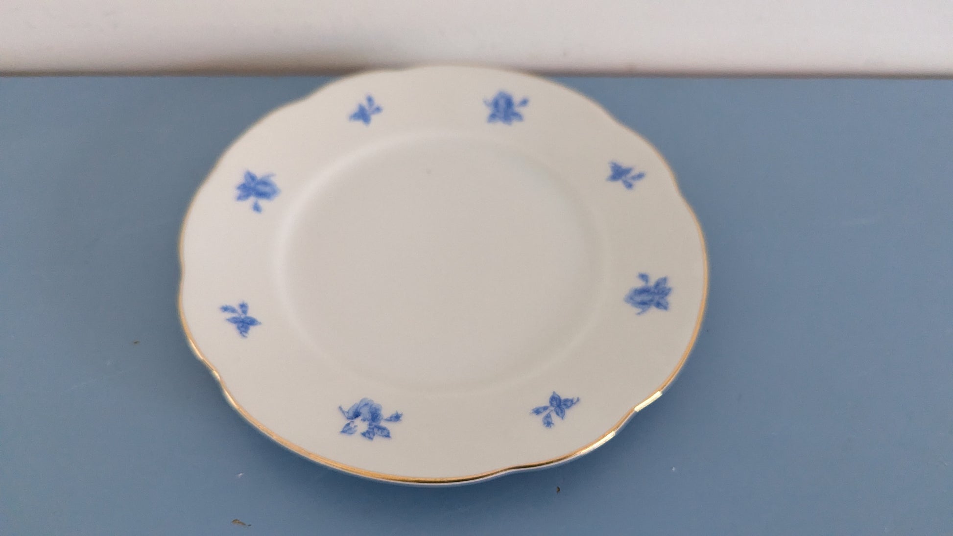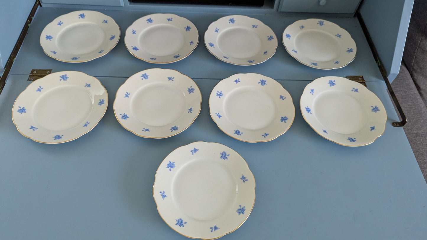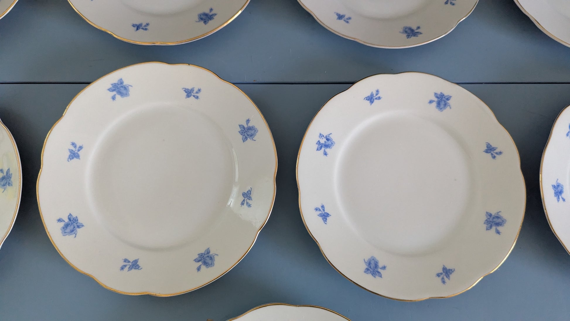 Sinisillä ruusuilla ja lehdille koristellut OB-mallin lautaset.