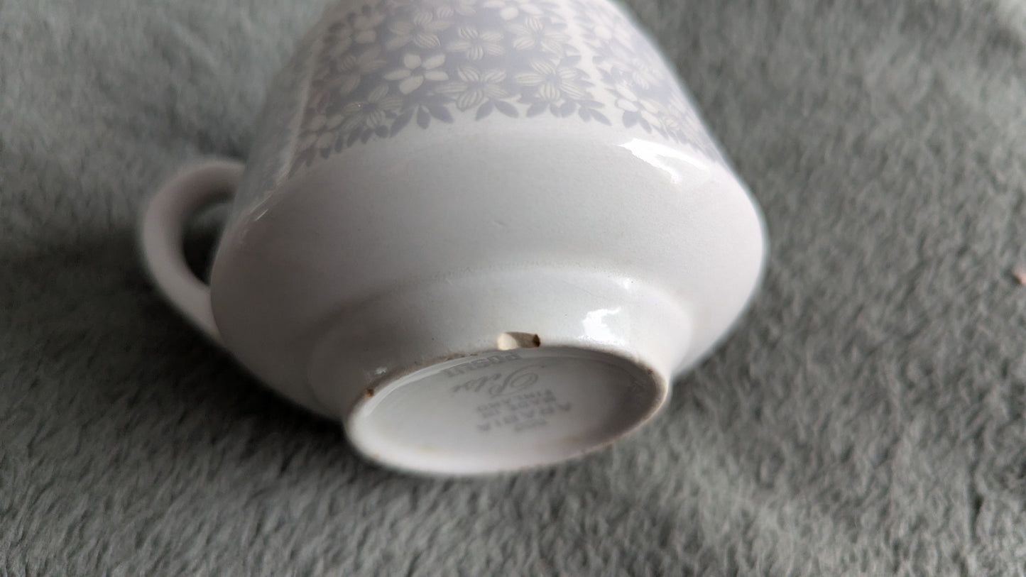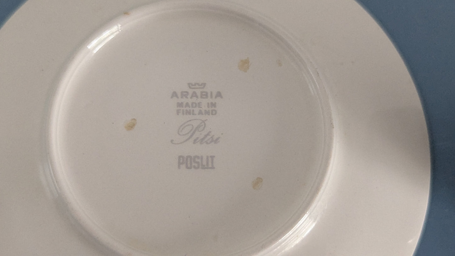 Ei halkeamia. Yhden kupin pohjaympyrässä viimeisen kuvan mukainen iskemä. Muissa ei iskemiä. Jokaisen lautasen pohjapuolella ihmeelliset kolme pistettä. En ole muissa Pitsi sarjan lautasissa tuollaisia nähnyt. Näkyy hyvin toiseksi viimeisessä kuvassa, Käyttökulumaa ei ole tai se on vähäistä.