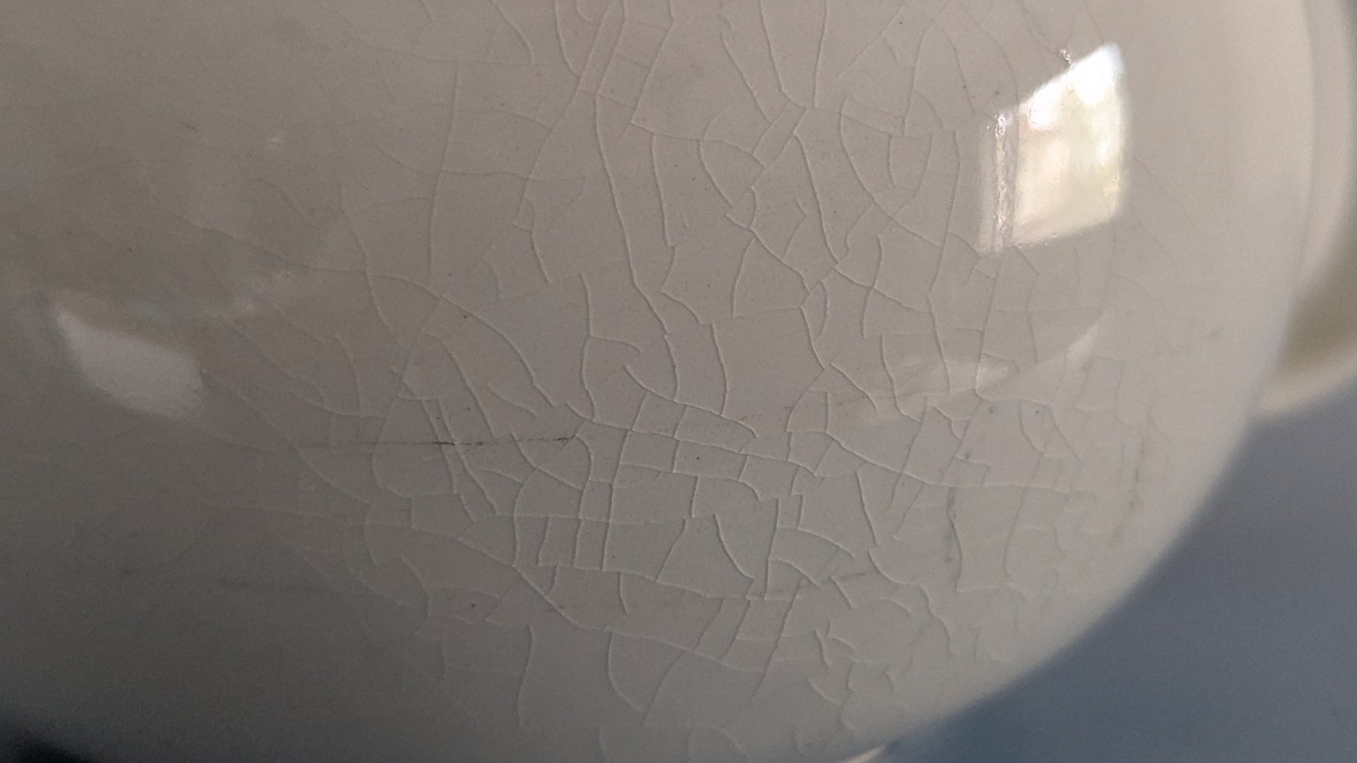 Ei iskemiä, halkeamia tai naarmuja mutta kevyttä krakeloitumista kauttaaltaan. Näkyy viimeisessä kuvassa.