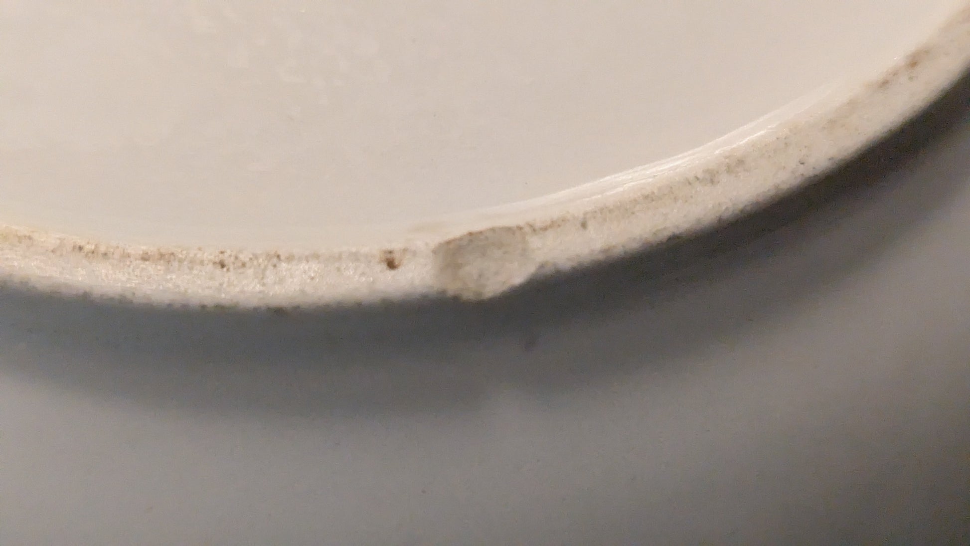 Ei halkeamia. Minimaalista käyttökulumaa. Pohjarenkaassa viimeisen kuvan mukainen 4mm iskemä.