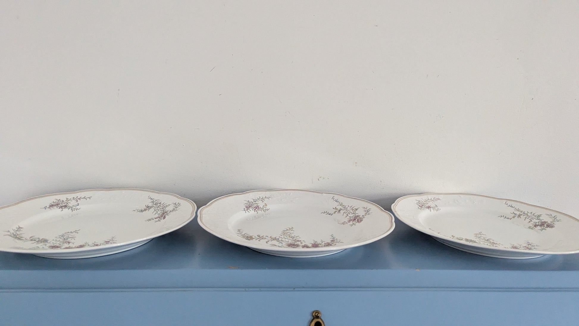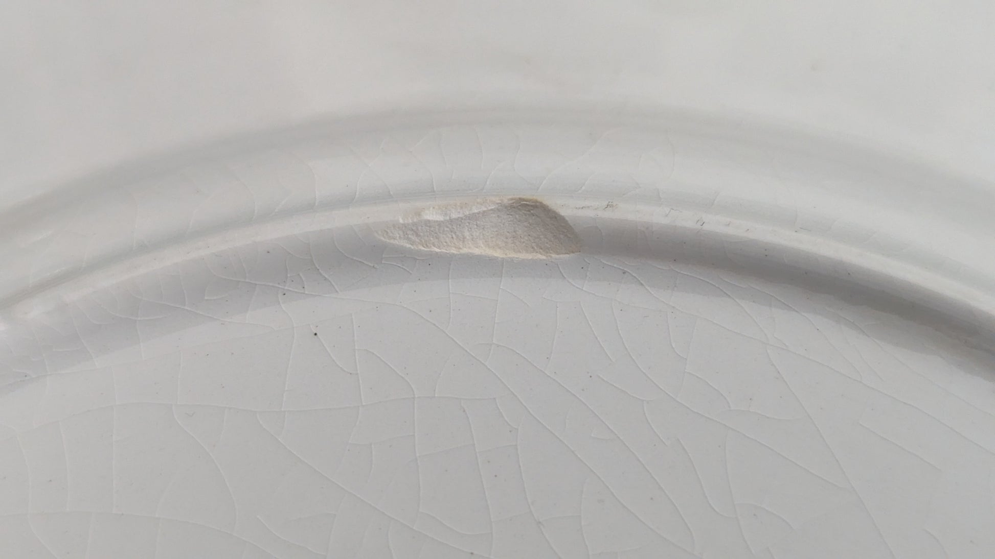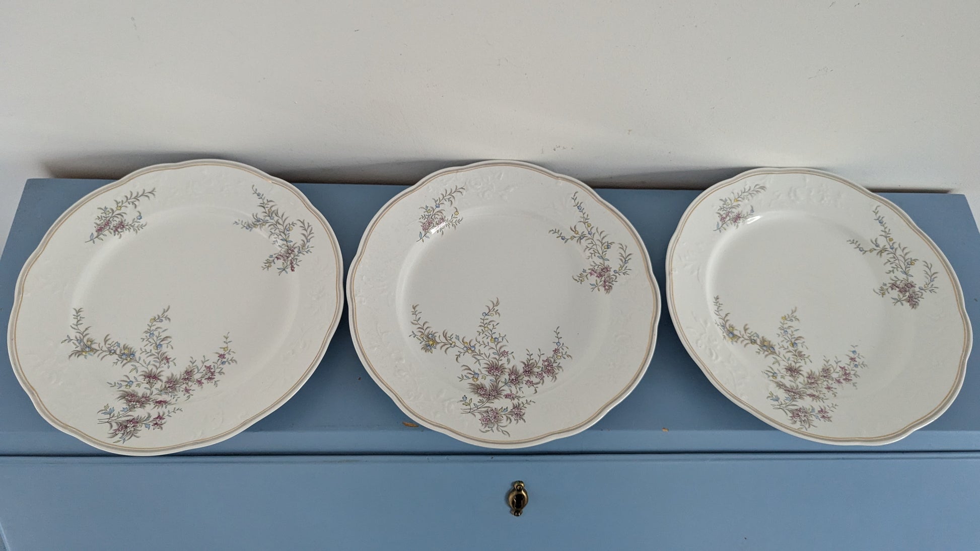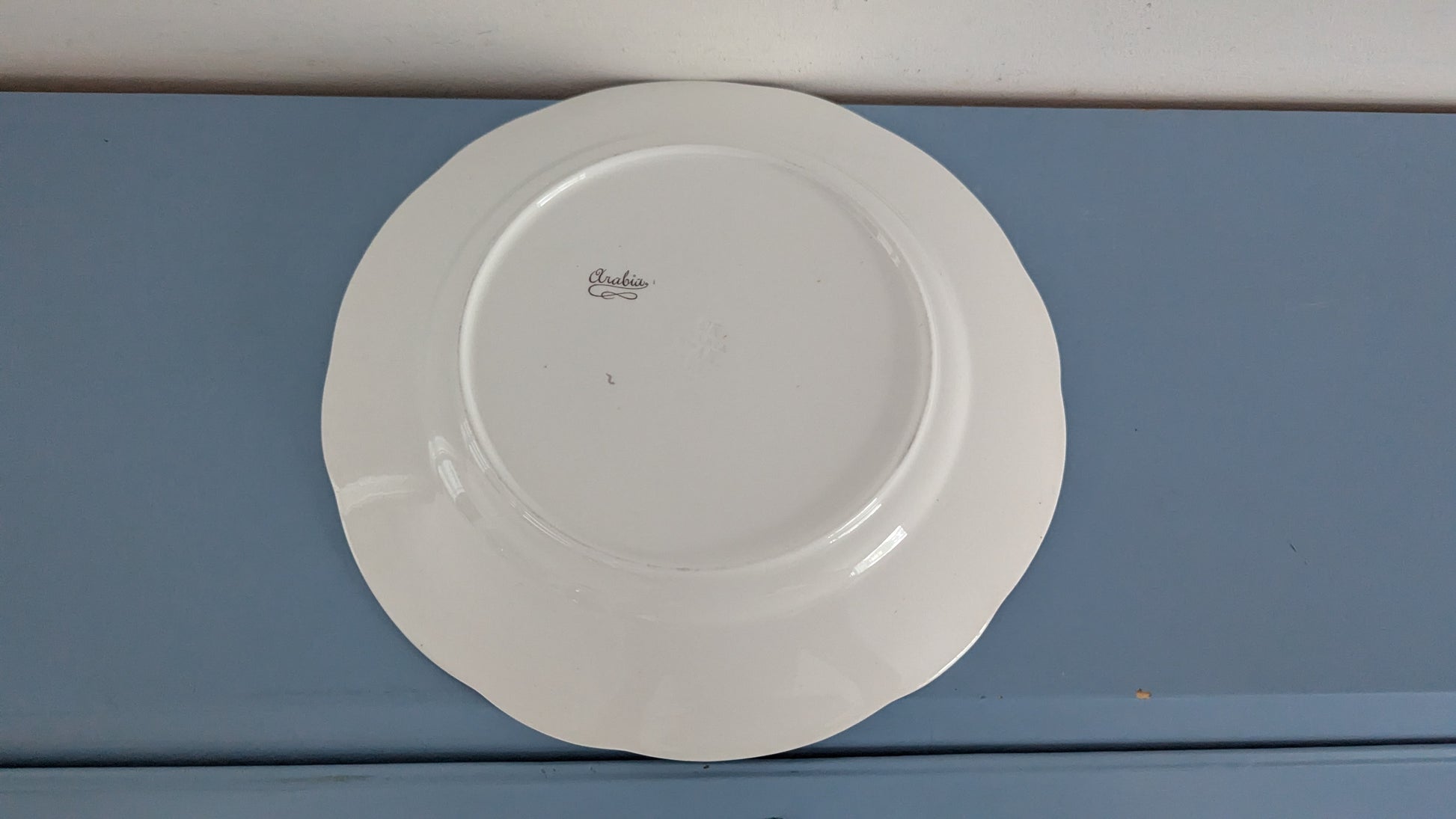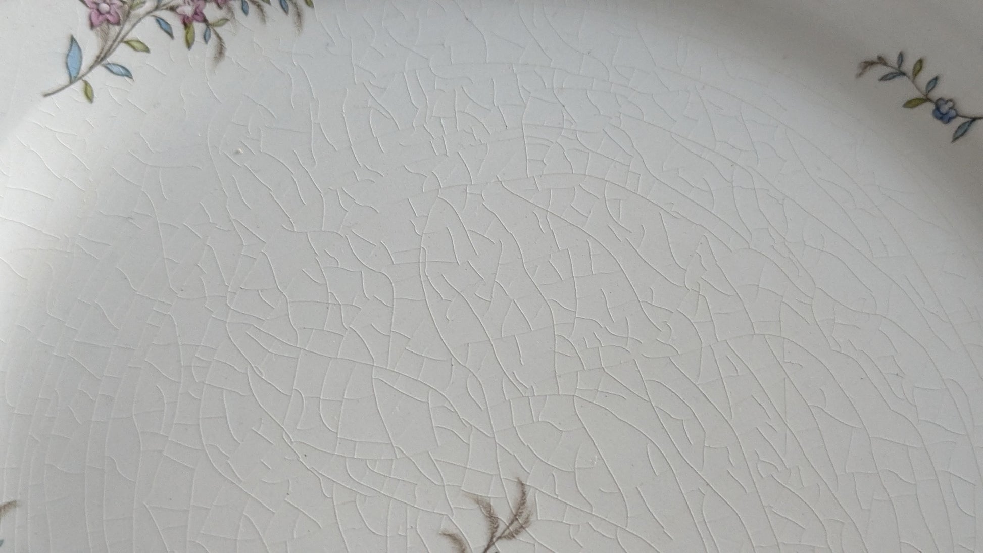 Ei halkeamia. Yhdessä lautasessa reilusti krakeloitumista, toisessa jonkin verran ja kolmannessa ei yhtään. Reilummin krakeloituneessa myös pohjareunassa iskemä. Muissa ei iskemiä. Eli yksi lautasista täysin kunnossa kun taas kahdessa muussa jotain sanomista. Käyttökulumaa ei ole tai se on minimaalista käyttökulumaa. Koristeet ja kultaukset erinomaisessa kunnossa.