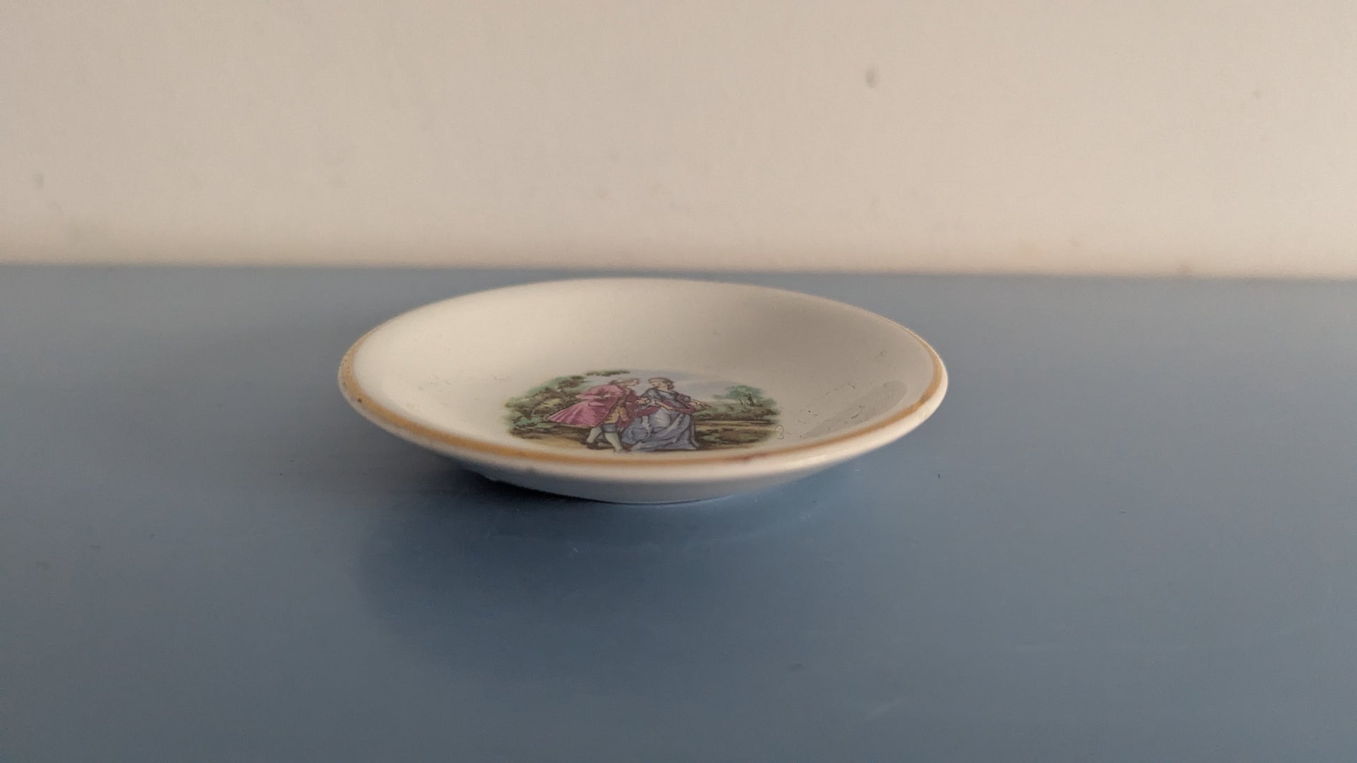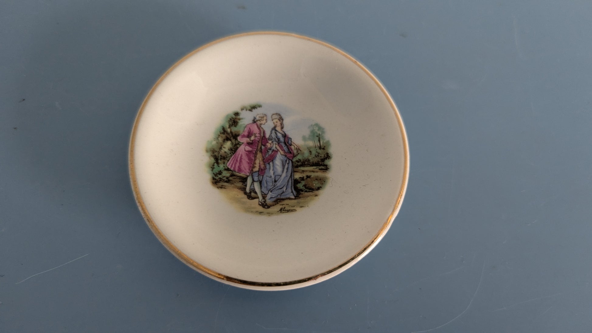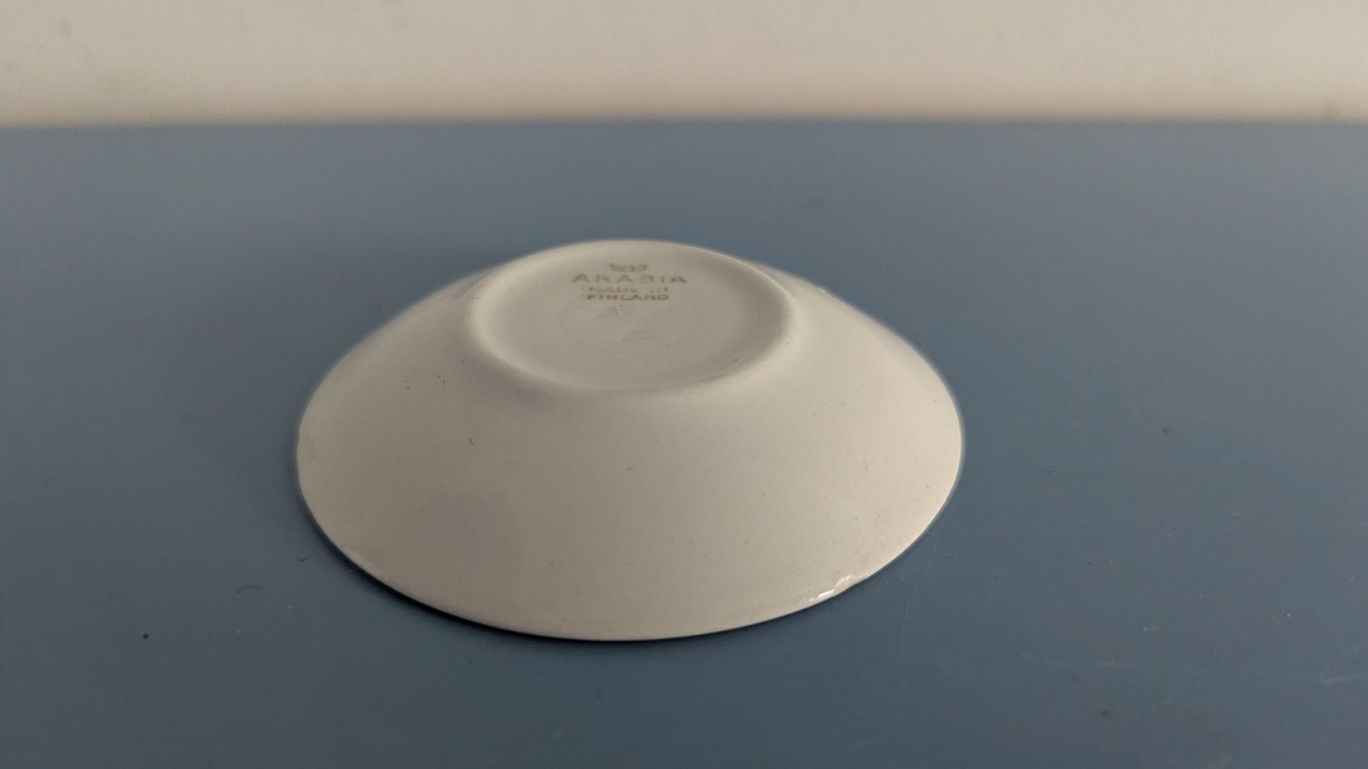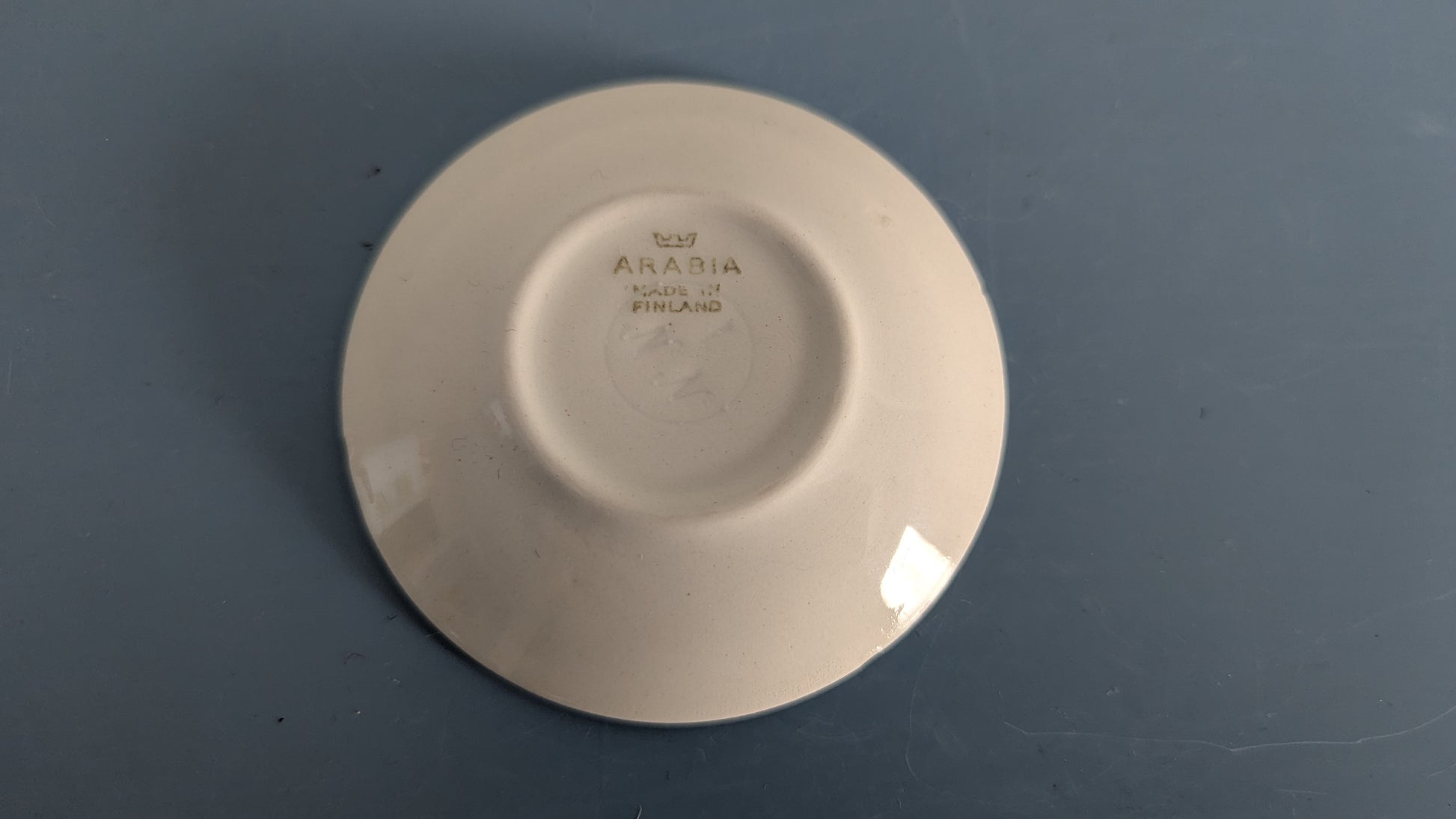 Pieni lautanen. Onko tehty lasten leikkilautaseksi vai koristeeksi? Pohjassa Arabia leiman lisäksi lasituksen alla massaleima N' N'