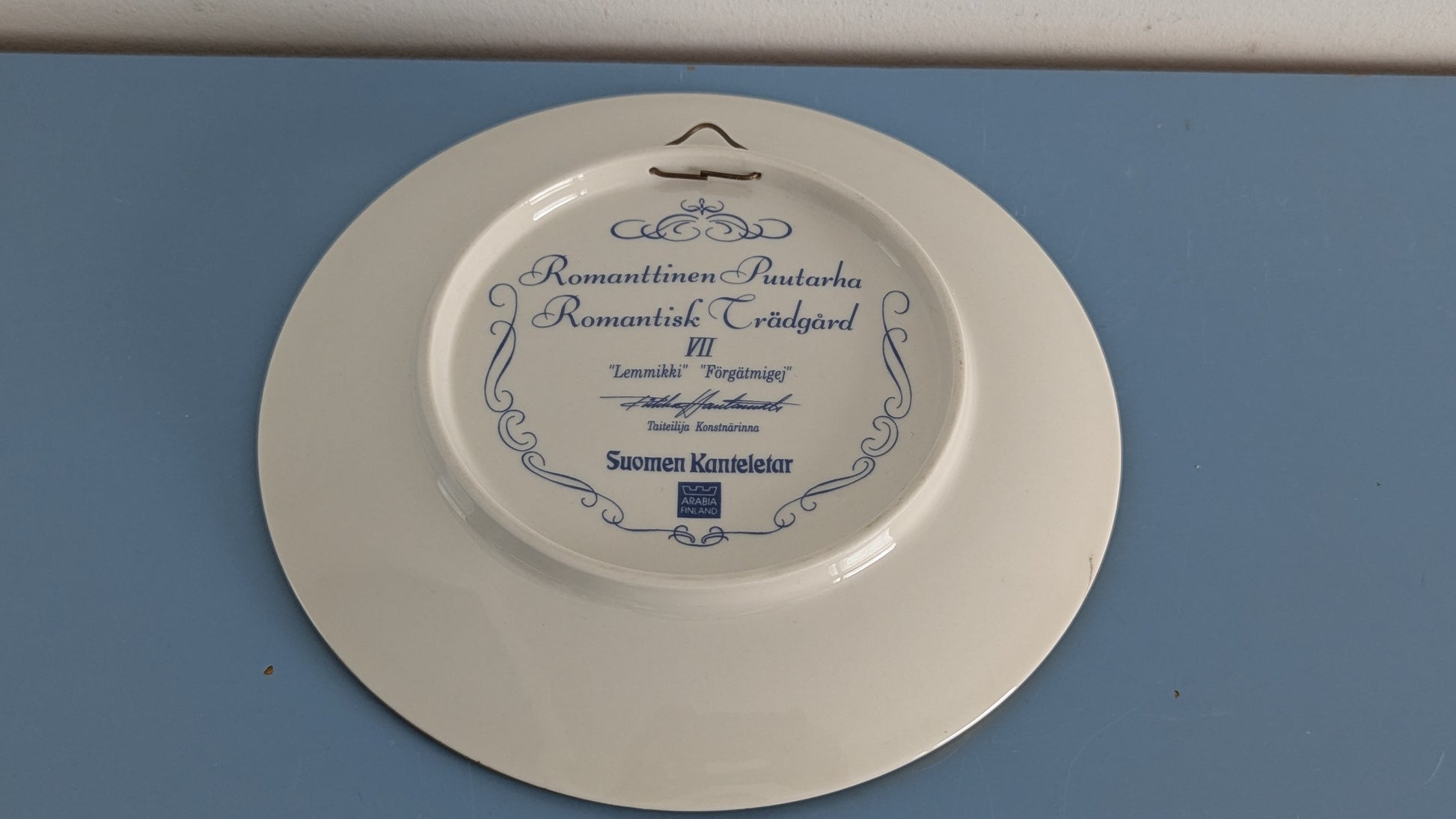 Arabian Suomen Kantelettarelle, ilmeisesti 1990-luvulla, valmistama Romanttinen puutarha sarjan seinälautanen