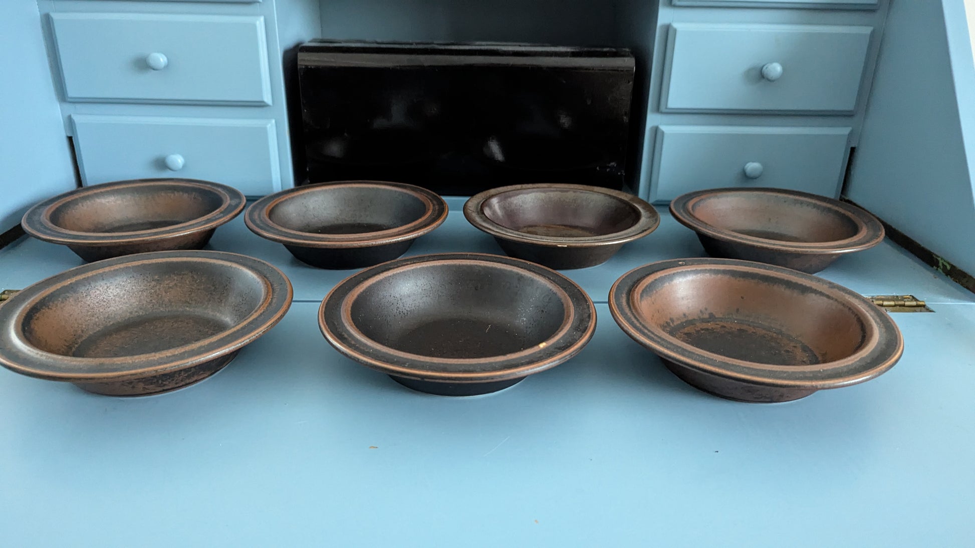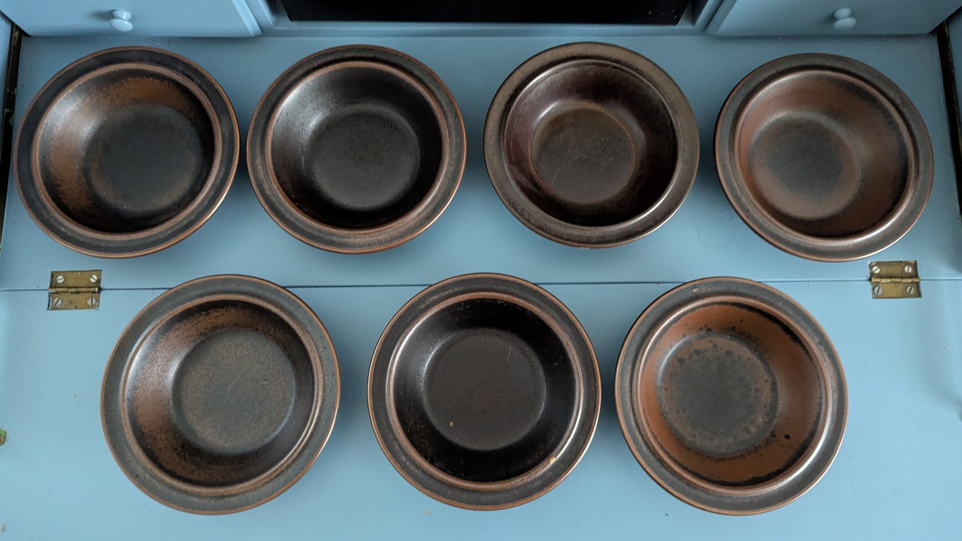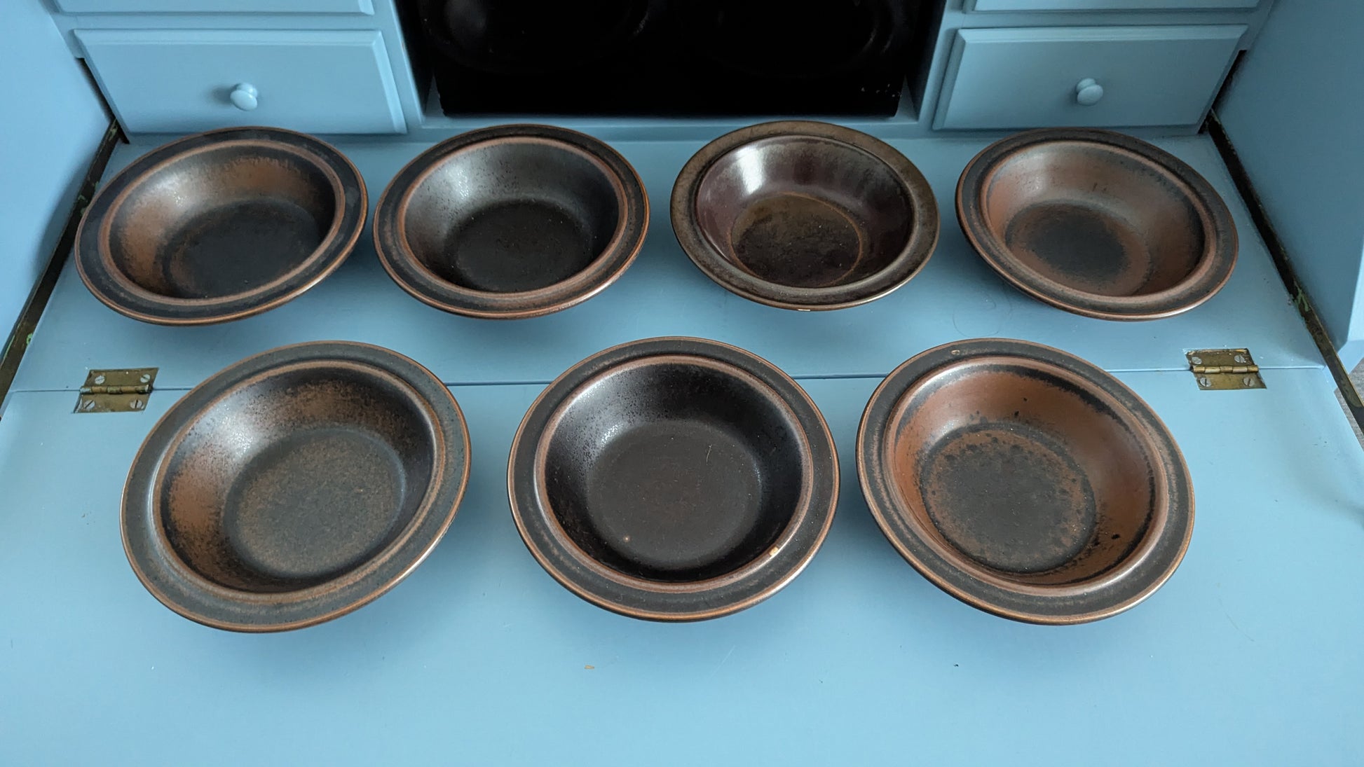 Ei iskemiä tai halkeamia. Käyttökuluma minimaalista. Kahdessa lautasessa pieni kohta johon ruskea väri ei ole tarttunut. Leimat kuluneet pois.