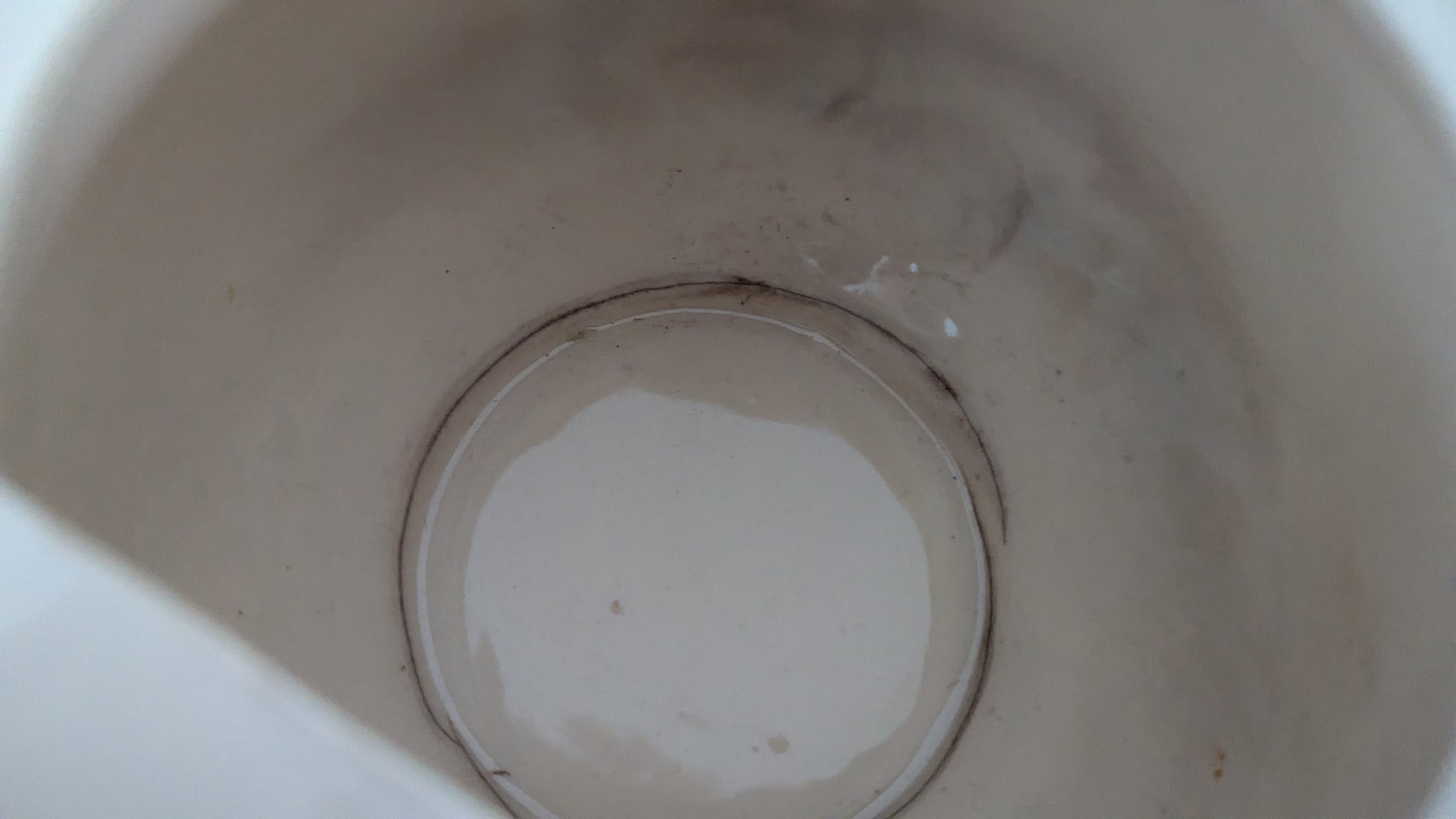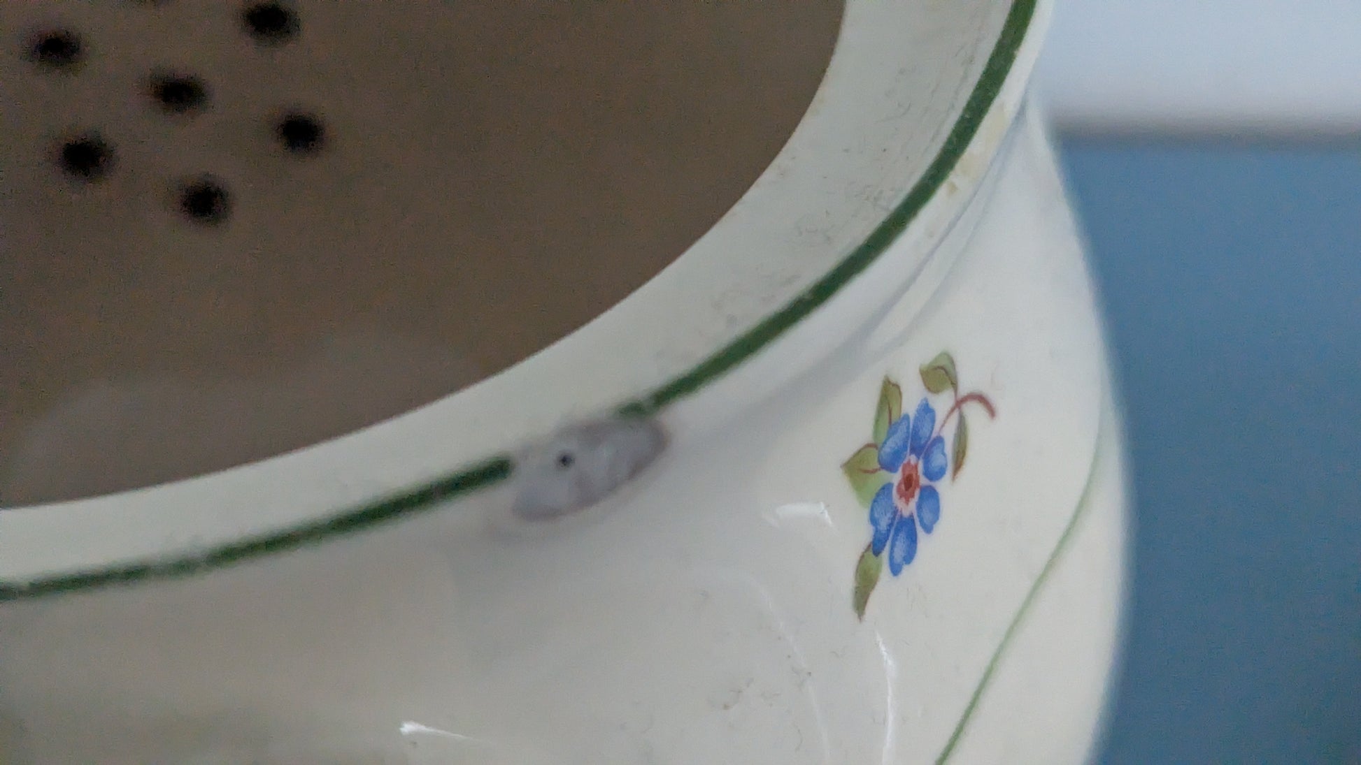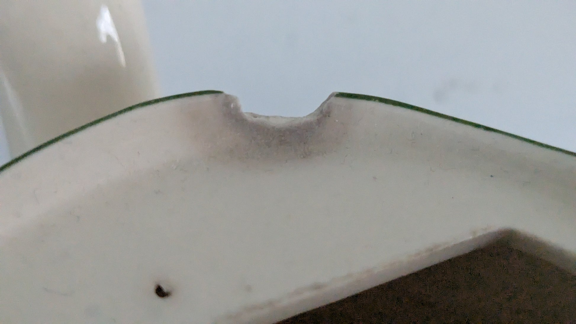 Koriste erinomaisessa kunnossa. Sisäpuolella pohjassa halkeama. Kaksi 1cm iskemää yläosassa ja yksi 2cm iskemä pohjassa.