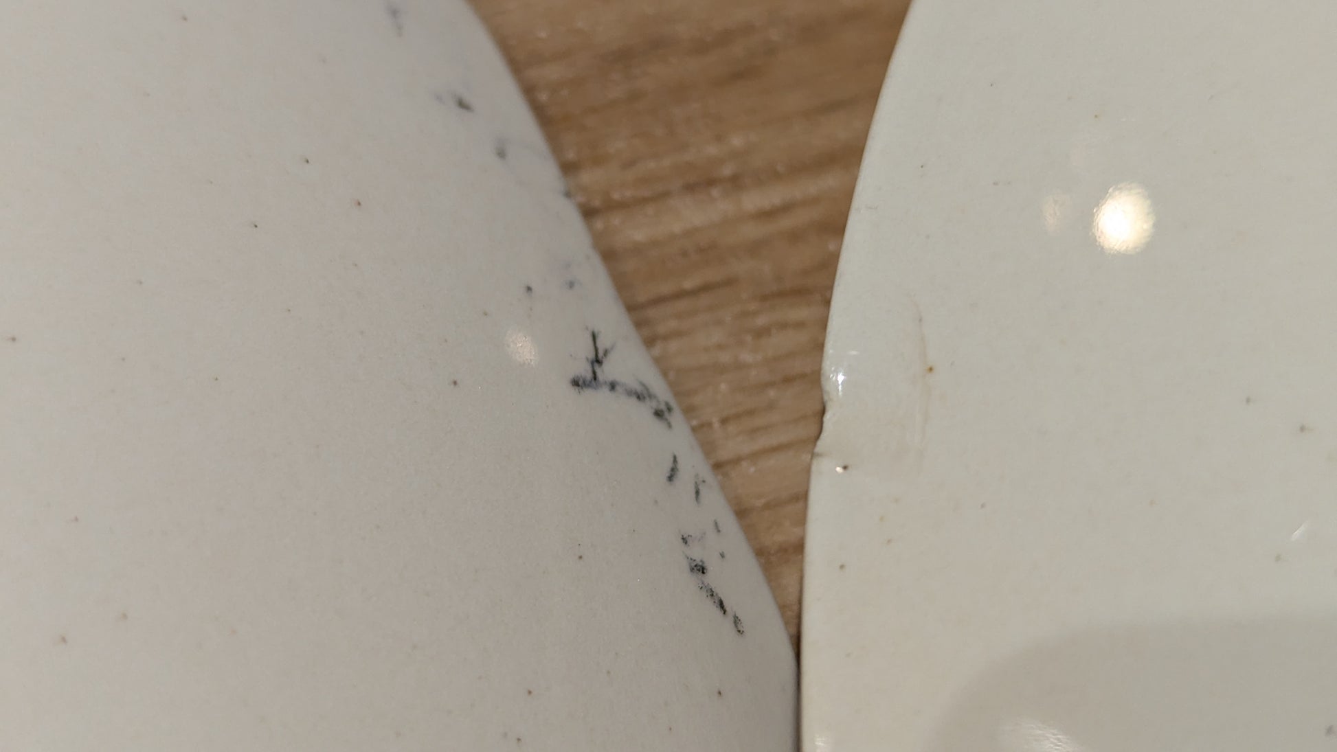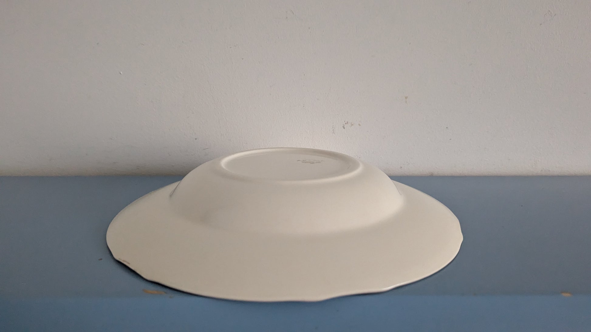 Ei halkeamia. Kultaus ja koriste erinomaisessa kunnossa. Minimaalista käyttökulumaa. Yhden lautasen pohjapuolella noin 5mm iskemä. Muissa ei iskemiä. Yhden lautasen pohjapuolella ilmeisesti metallista jäänyttä jälkeä. Viat näkyy viimeisessä kuvassa.