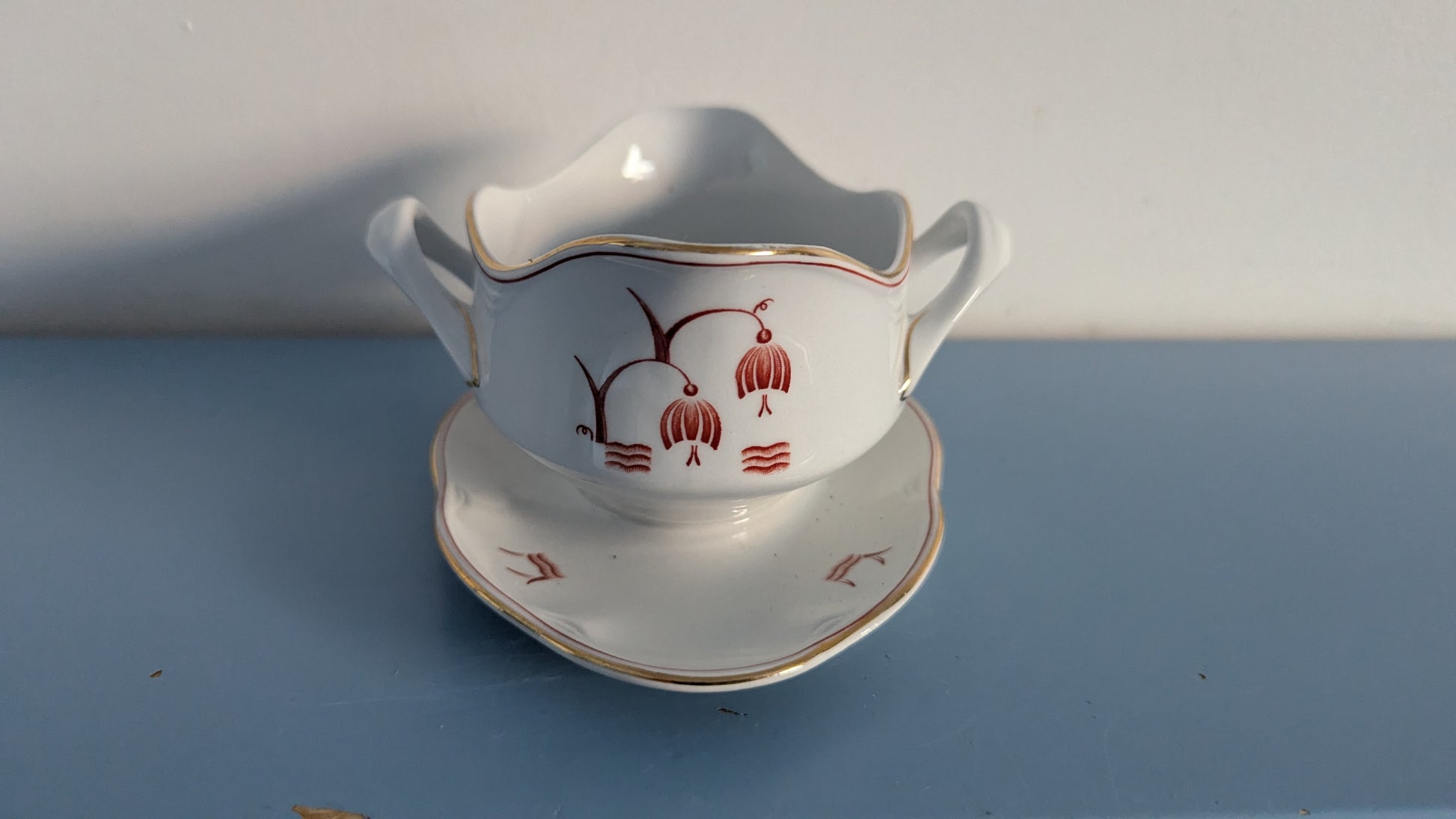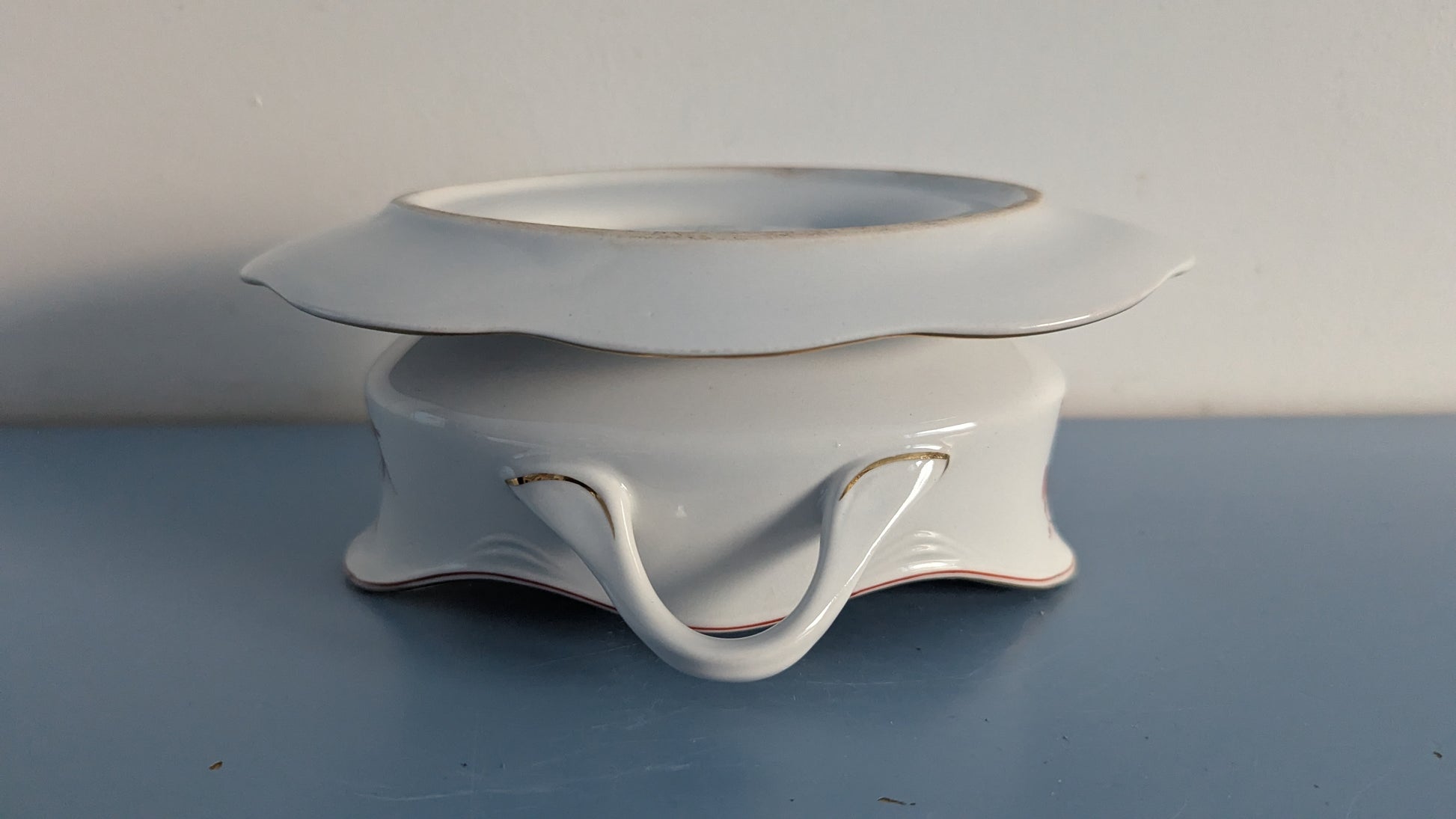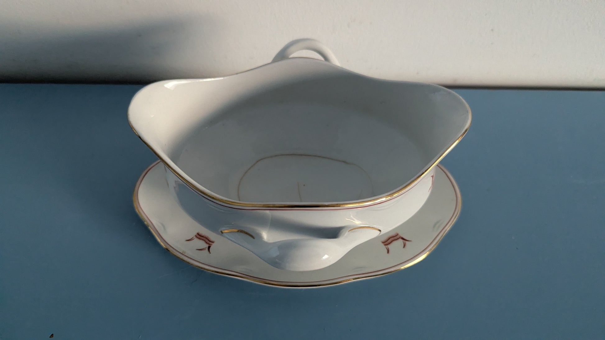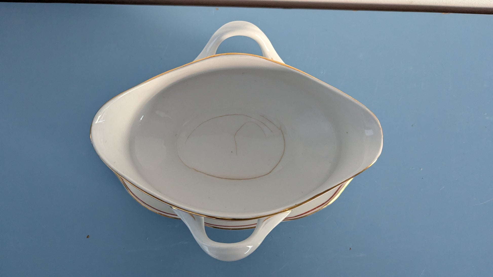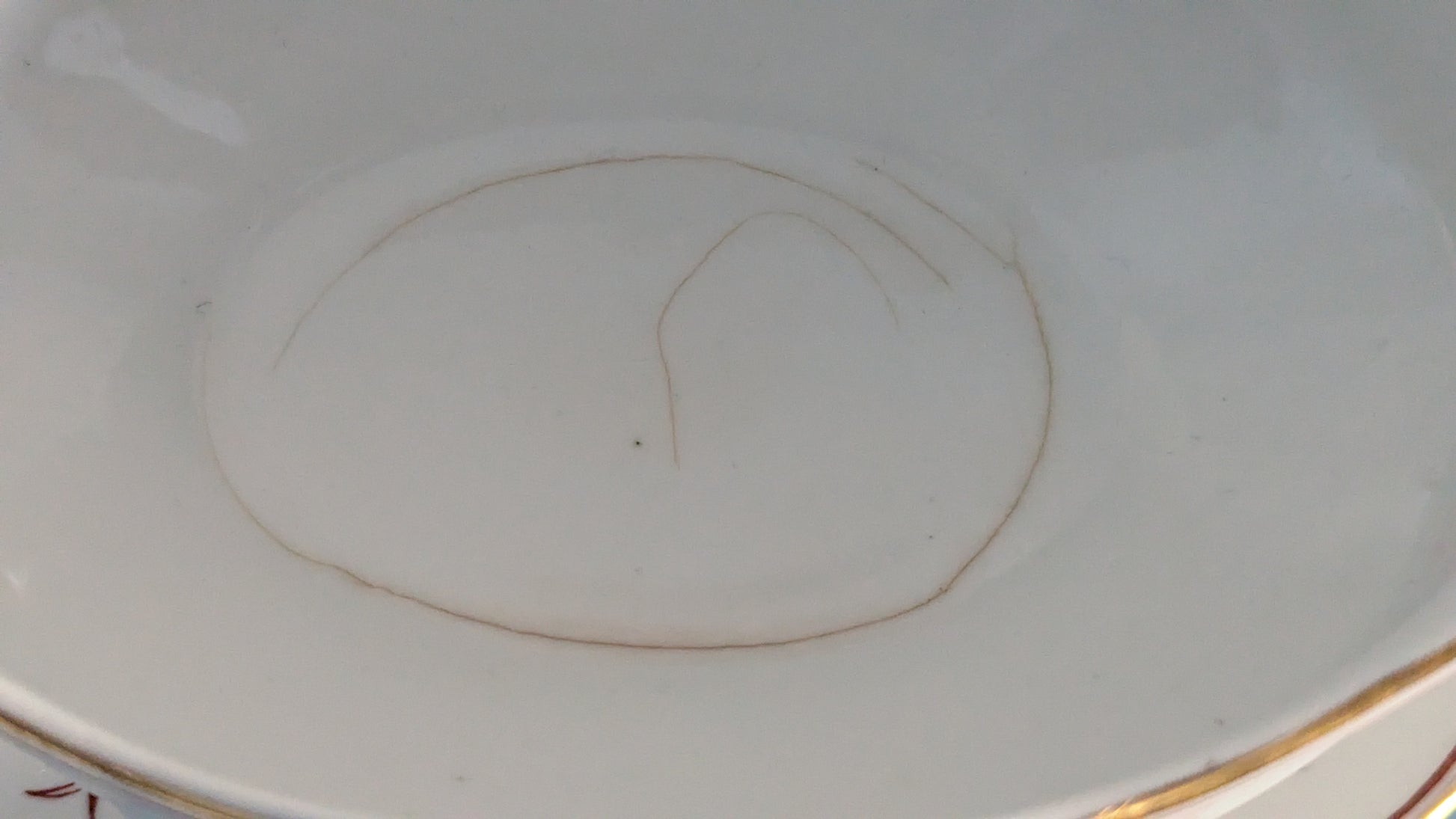 Ei iskemiä. Koriste ja kultaus erinomaisessa kunnossa. Pohjalla viimeisen kuvan mukaiset halkeamat. Ei ole toisella puolen vaan ainoastaan kulhon pohjalla.