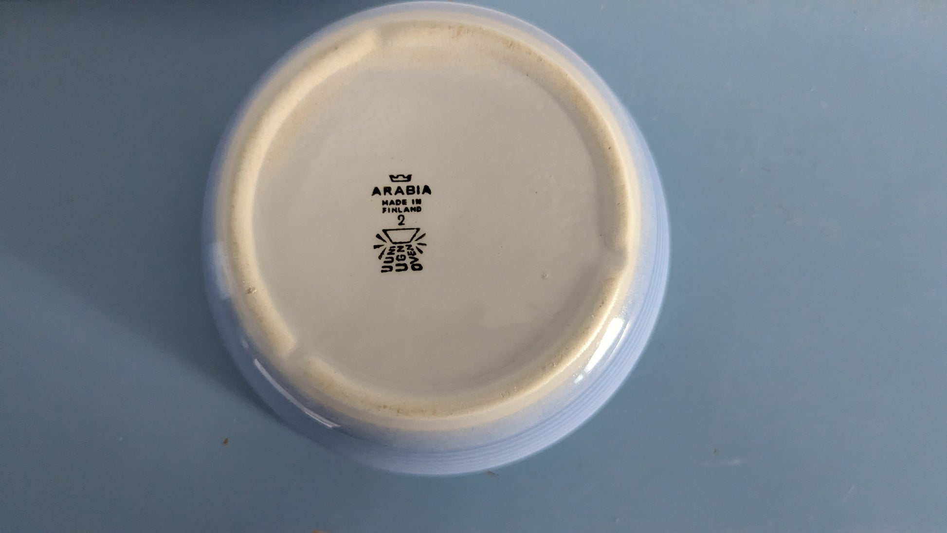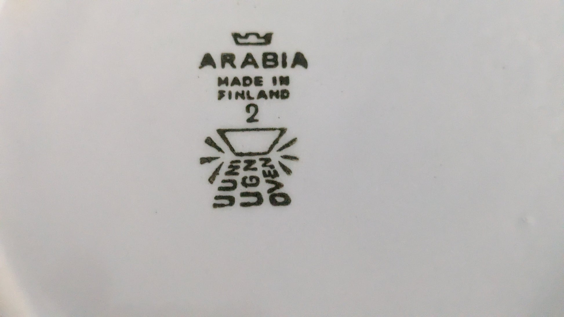 Pohjassa Arabian leima ja merkintä uunin kestävyydestä. Kestoa tehty useaan eri mallin ja useilla eri väreillä.