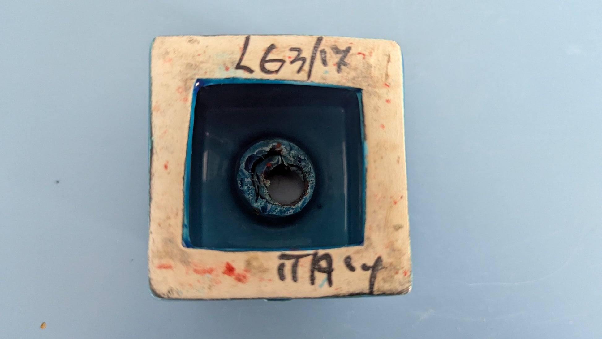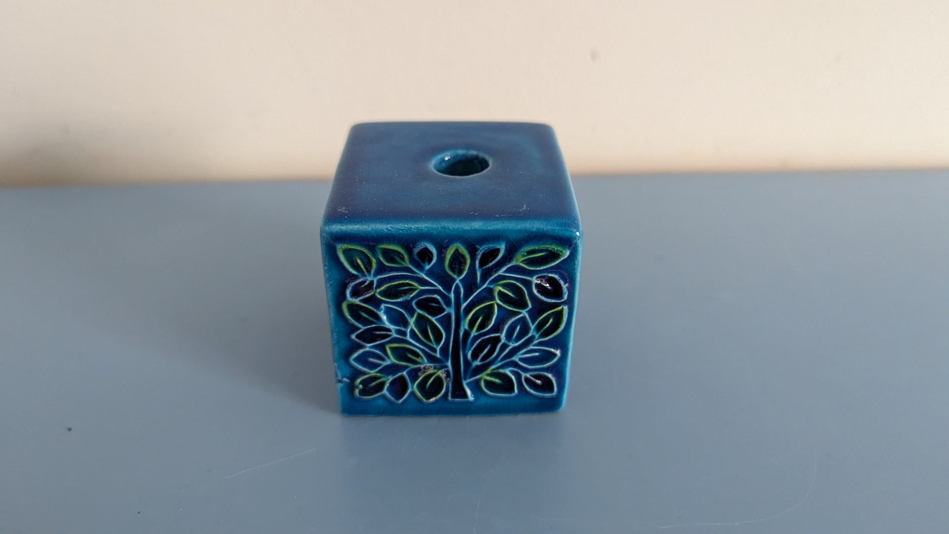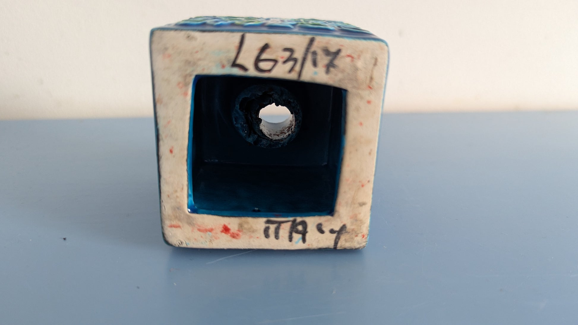 Mitä ilmeisemmin kynttilänjalka. Ei tietoa mikä muukaan olisi tämän käyttötarkoitus. Edessä ja takana Aldo Londin suunnittelema Tree of Life koristekuvio. Yläpuolella 1.8cm reikä johon menisi enkelikynttilä. Pohjassa tussilla teksti Italy LG 3/17. Se mikä ihmetyttää on viimeisessä kuvassa näkyvä reikä. Mitä tarkoitusta varten se on? Onko tämä tarkoitettu kiinnitettäväksi siitä esim. ruuvilla seinään? Silloin koristekuviot jäisivät sivulle.