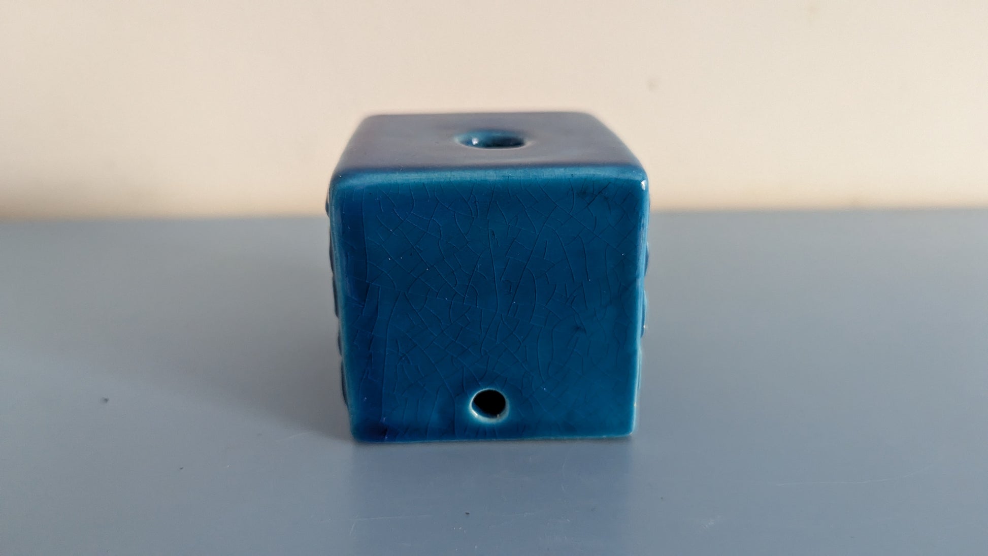 Ei iskemiä, halkeamia tai naarmuja. Tyhjällä (reiättömällä sivulla) orastavaa krakeloitumista. Ylhäällä oleva reikä ei ole sattunut aivan keskelle vaan heittää keskustasta muutaman millin.