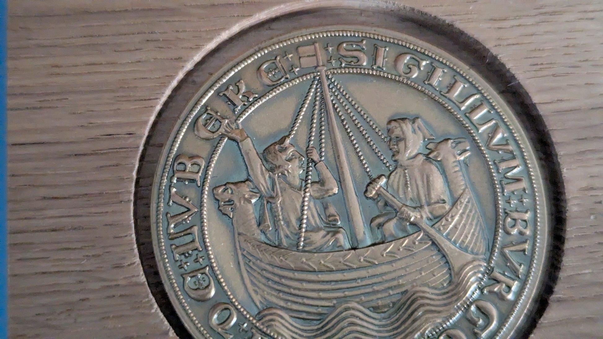 Etupuolella keskellä suuri Kogg-tyylinen purjelaiva, joka oli Hanse-liiton aikakauden kauppalaiva ja symboloi Lübeckin merellistä valtaa ja vaurautta. Laivan ympärillä teksti "Sigillum Burgensivm De Lvbicke" eli “Lübeckin porvarien sinetti”