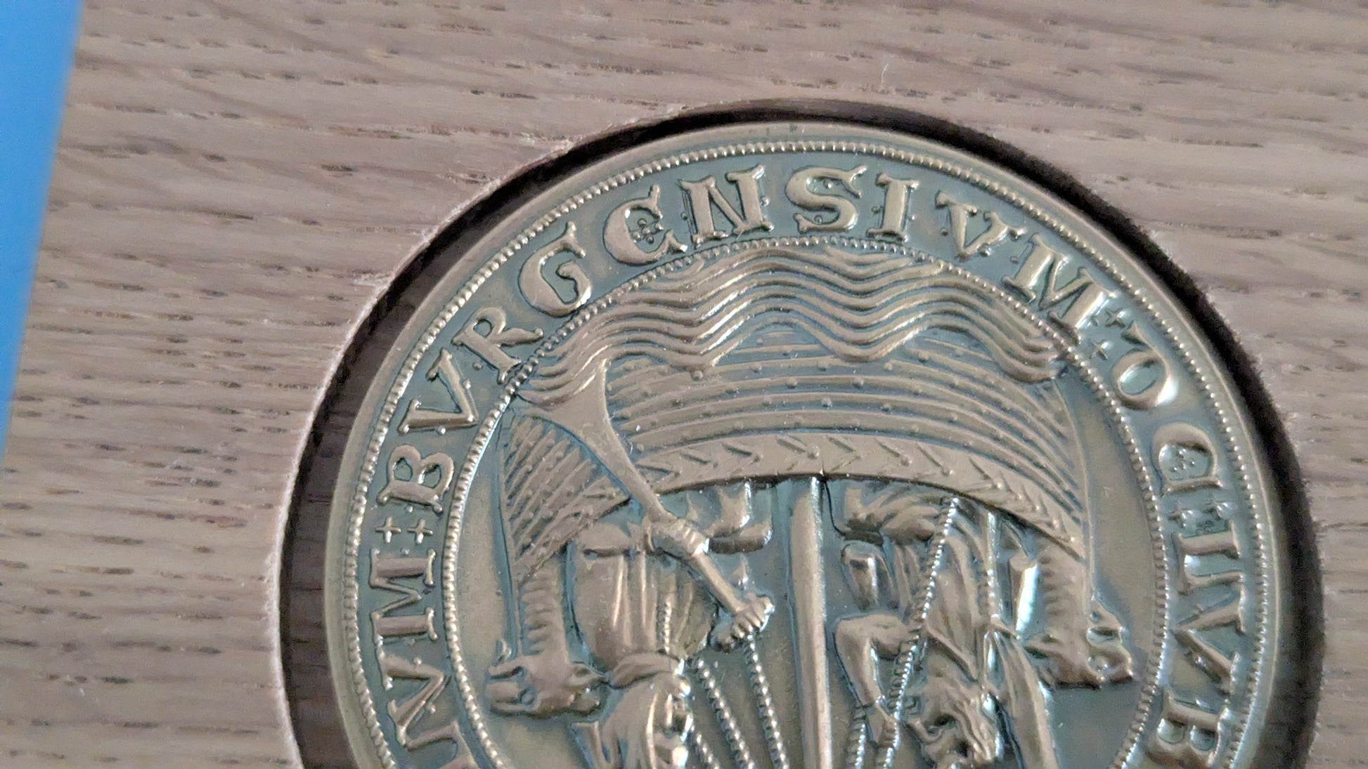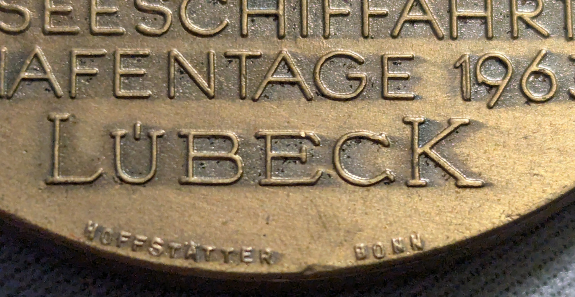 Taustapuolella Lyypekin kaupungin historialliset kirkontornit ja teksti "Ostseeschiffahrts- u. Hafentage 1963 Lübeck" eli Itämerenkulun ja satamapäivät 1963 Lybeckissä. Tekstin alla pienellä Hoffstätter Bonn mikä viittaa valmistajaan Carl Hoffstätteriin.